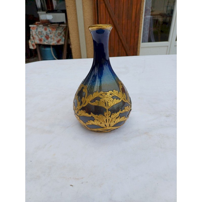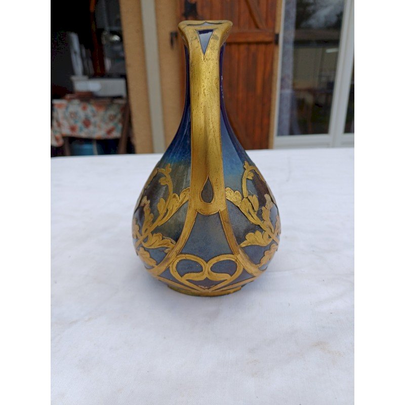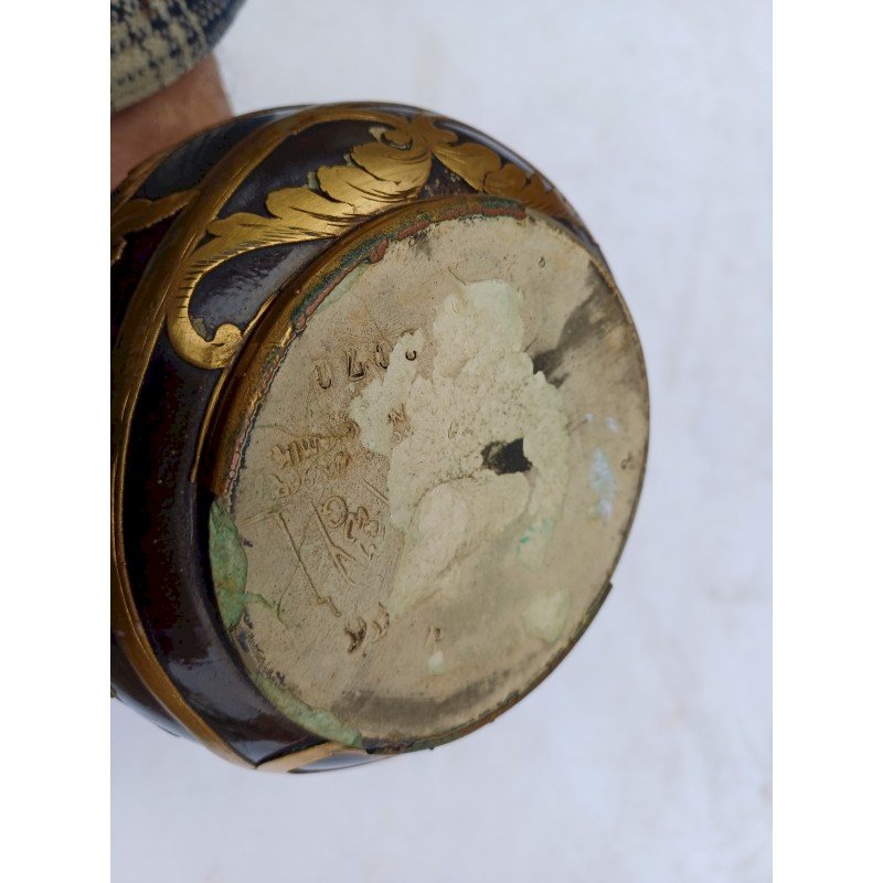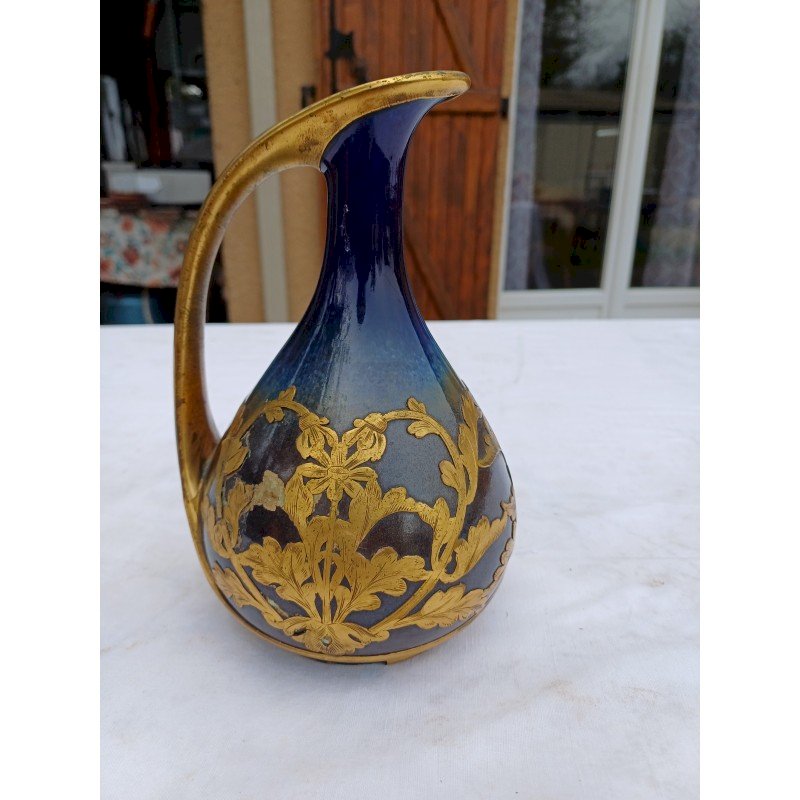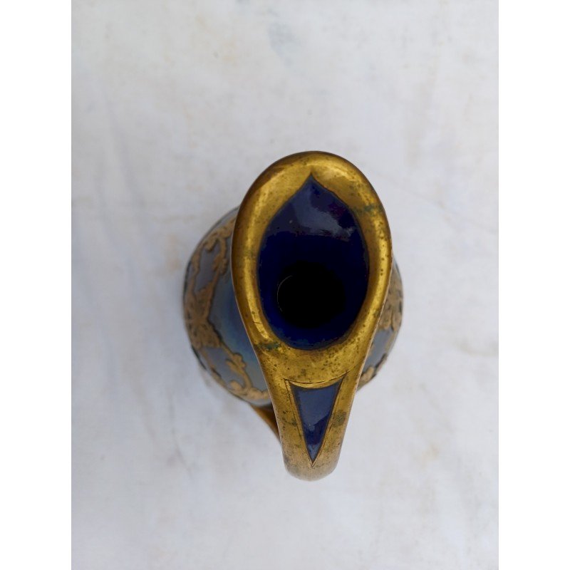 Ceramic pitcher enameled by Peter Bremens, Manufacturer: Merkelbach, decorated with chased brass and foliage patterns, Height: 20 cm, Length and Width: 13 cm x 12 cm, Weight: 670 g, Good condition.