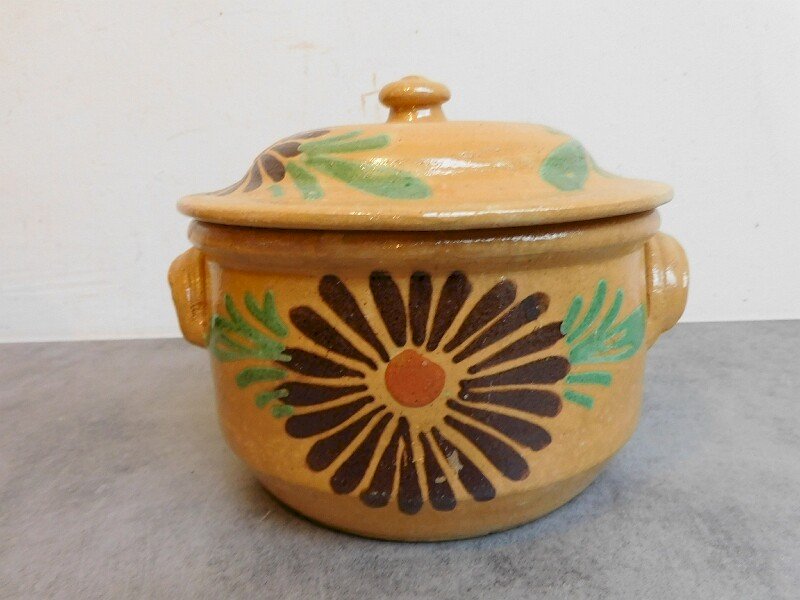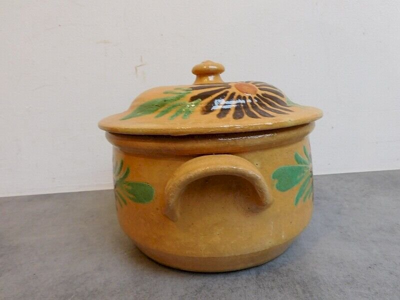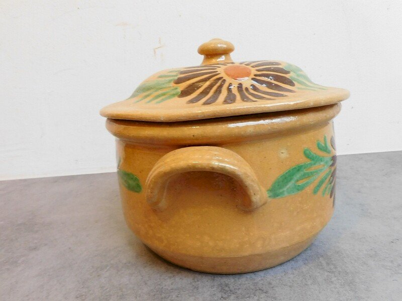 superb glazed earthenware soup tureen with a flower decoration, it is in very good condition, it has a small chip on the knob that serves as a handle on the lid, it measures 16.5 cm in height and 21 cm in diameter.