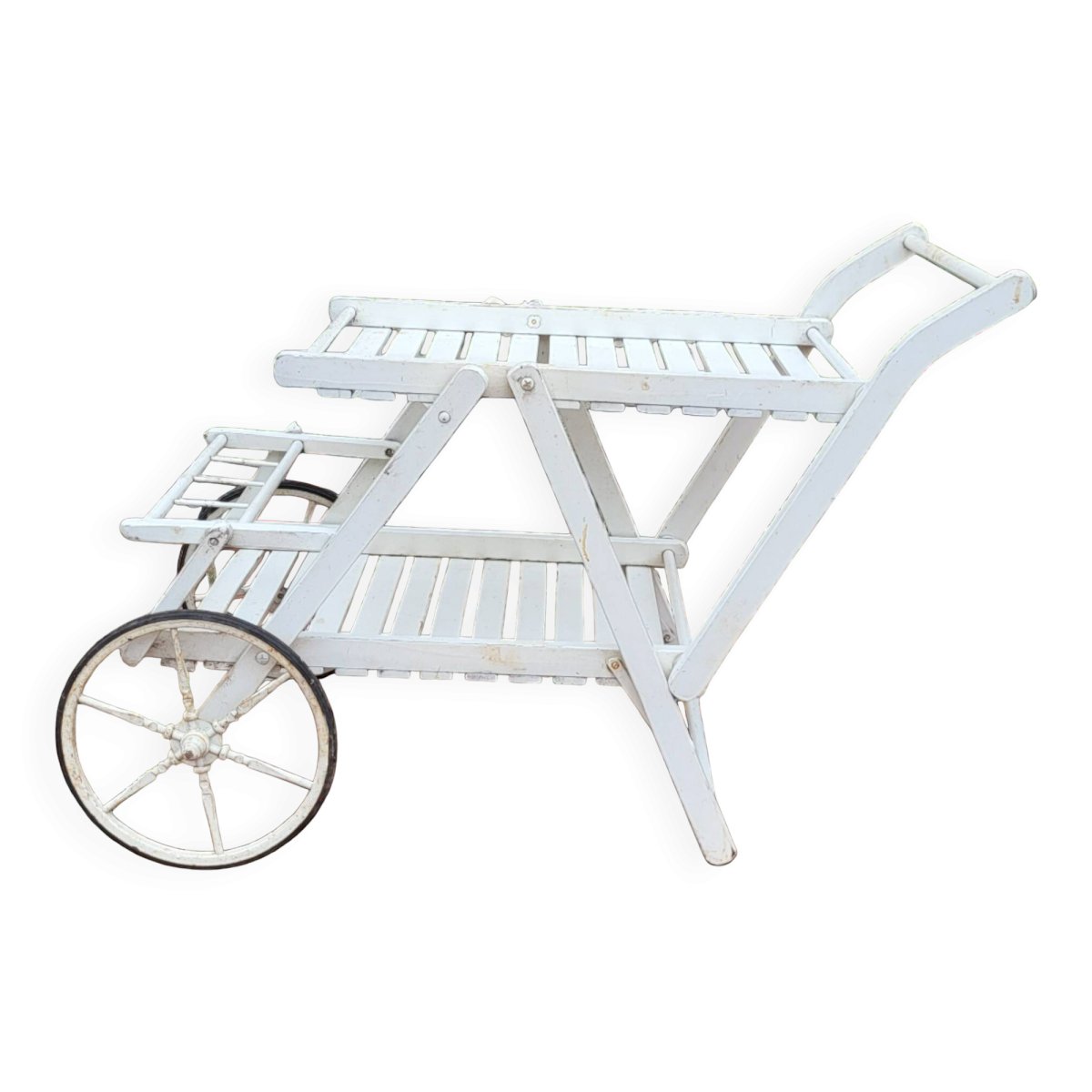 Wooden serving cart by the brand Gleizes / 1960s/70s. Foldable serving cart. Height 62 cm, Width 57 cm (wheels), Length approximately 107 cm.
