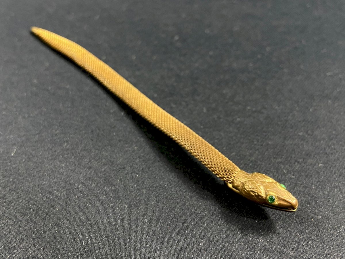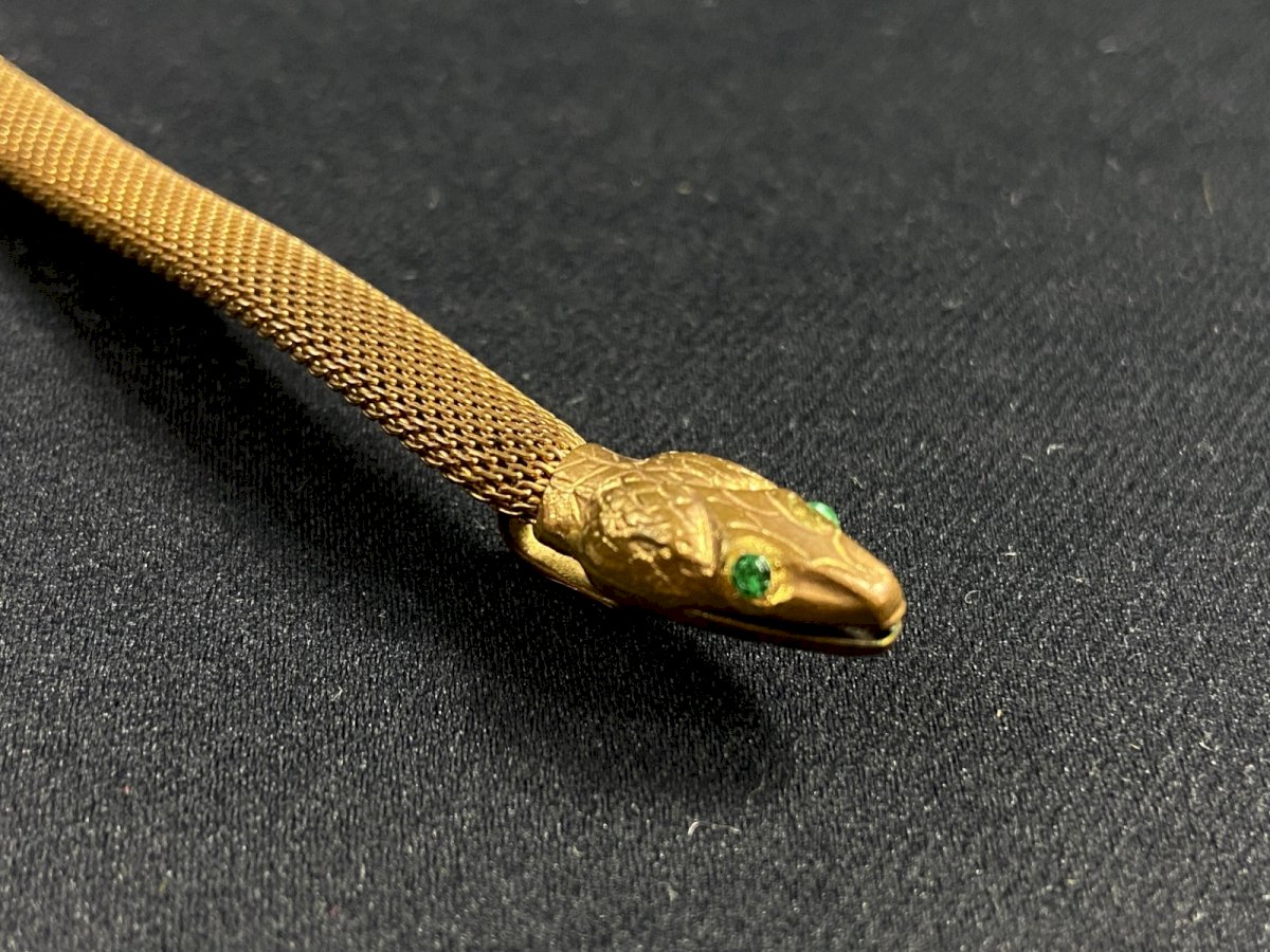Gold-plated metal pendant featuring an elongated snake with a finely carved head, open mouth, and emerald green faceted glass (or set glass paste) eyes, with an articulated body made of a flexible tubular chain known as mesh chain, and a loop beneath the head allowing for suspension. Victorian style, mid-20th century. Provenance: probably France or England. These articulated snakes were very fashionable in women's jewelry and accessories. The symbol of the snake, associated with eternity, protection, and love, was popularized by the bracelet given by Prince Albert to Queen Victoria in 1839. A beautiful example of Victorian / Art Nouveau taste, symbolizing eternity and protection. Dimensions: L. 13 cm × Ø 0.9 cm Weight: 6 grams Very nice presentation. Shipment VERY carefully handled worldwide. Authenticity: Original Type: Display object, Decorative Origin: England Period: Art Deco Subtype: Jewelry Country of origin: United Kingdom Material: Gold-plated metal Style: Victorian