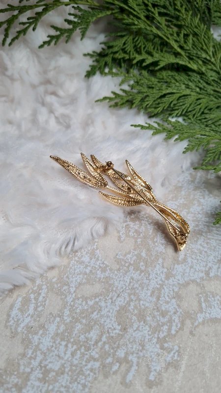 Very beautiful old brooch, feather with rhinestones, in gilded metal, vintage.