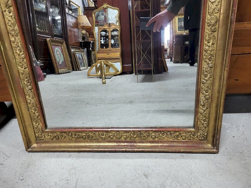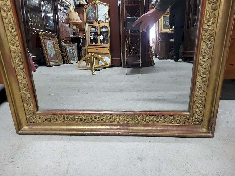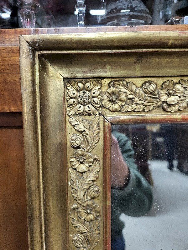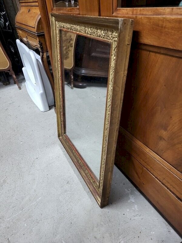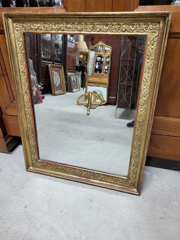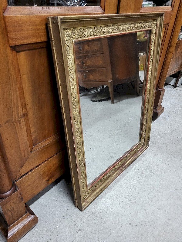 Nice golden mirror with a decor of leaves and foliage from the 19th century. It is in good condition; the gilding has worn off in some places, but it gives it an even older effect. It's a very beautiful and uncommon model. It measures 73 cm wide by 90 cm high. Type: Wall-mounted Shape: Rectangular.