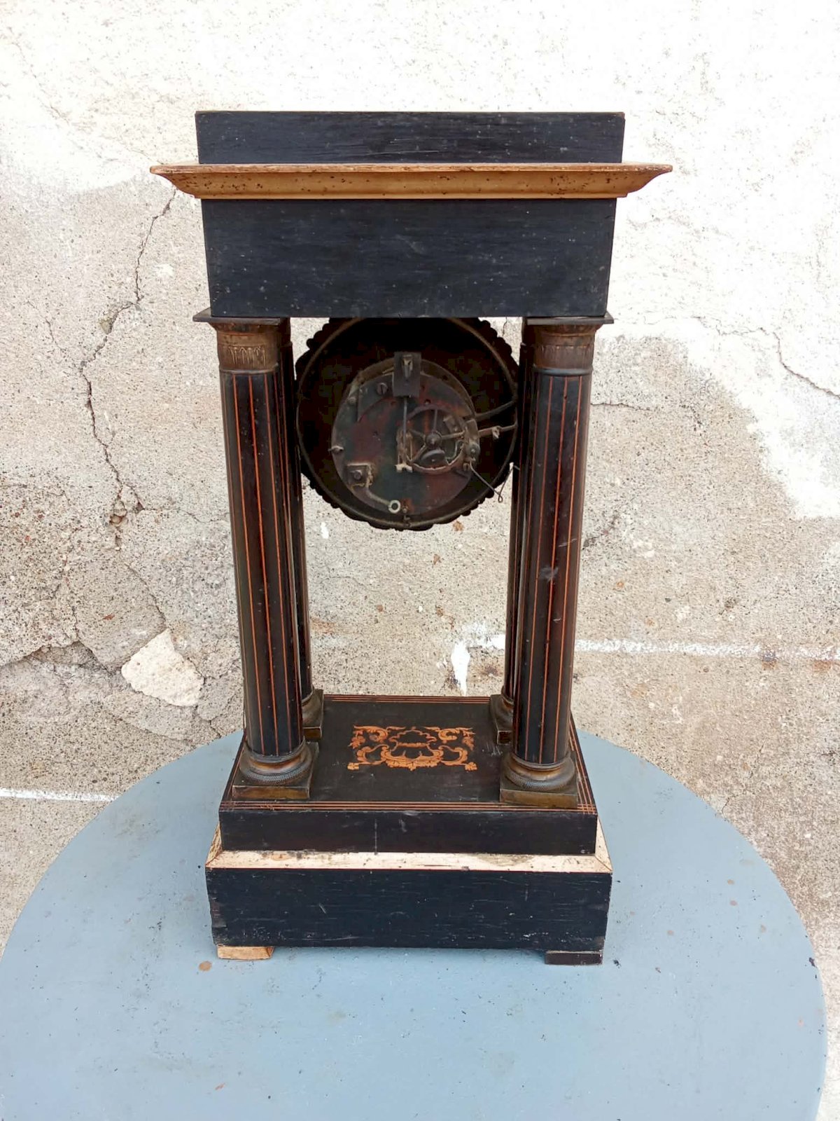 Elegant portico clock from the Charles X era, refined model with typical décor from the 1820s–1830s.