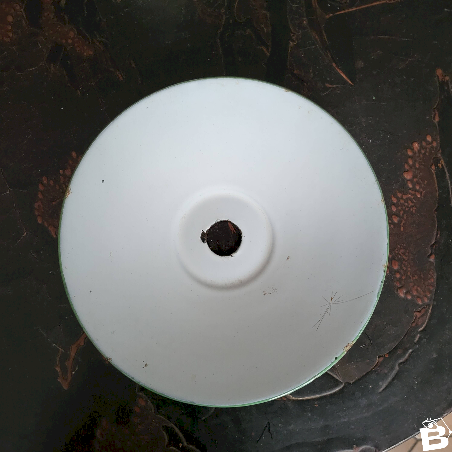 Green enamelled metal lampshadeDiameter 24.5 cmSigns of use and age. L: 24.5 W: 1 H: 1