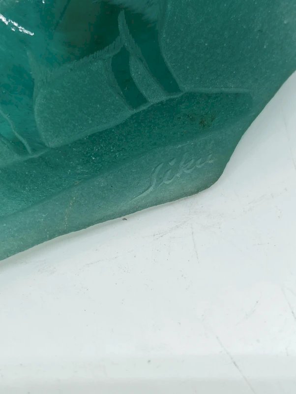 green glass sculpture decorated with wolves signed by Siku in good condition