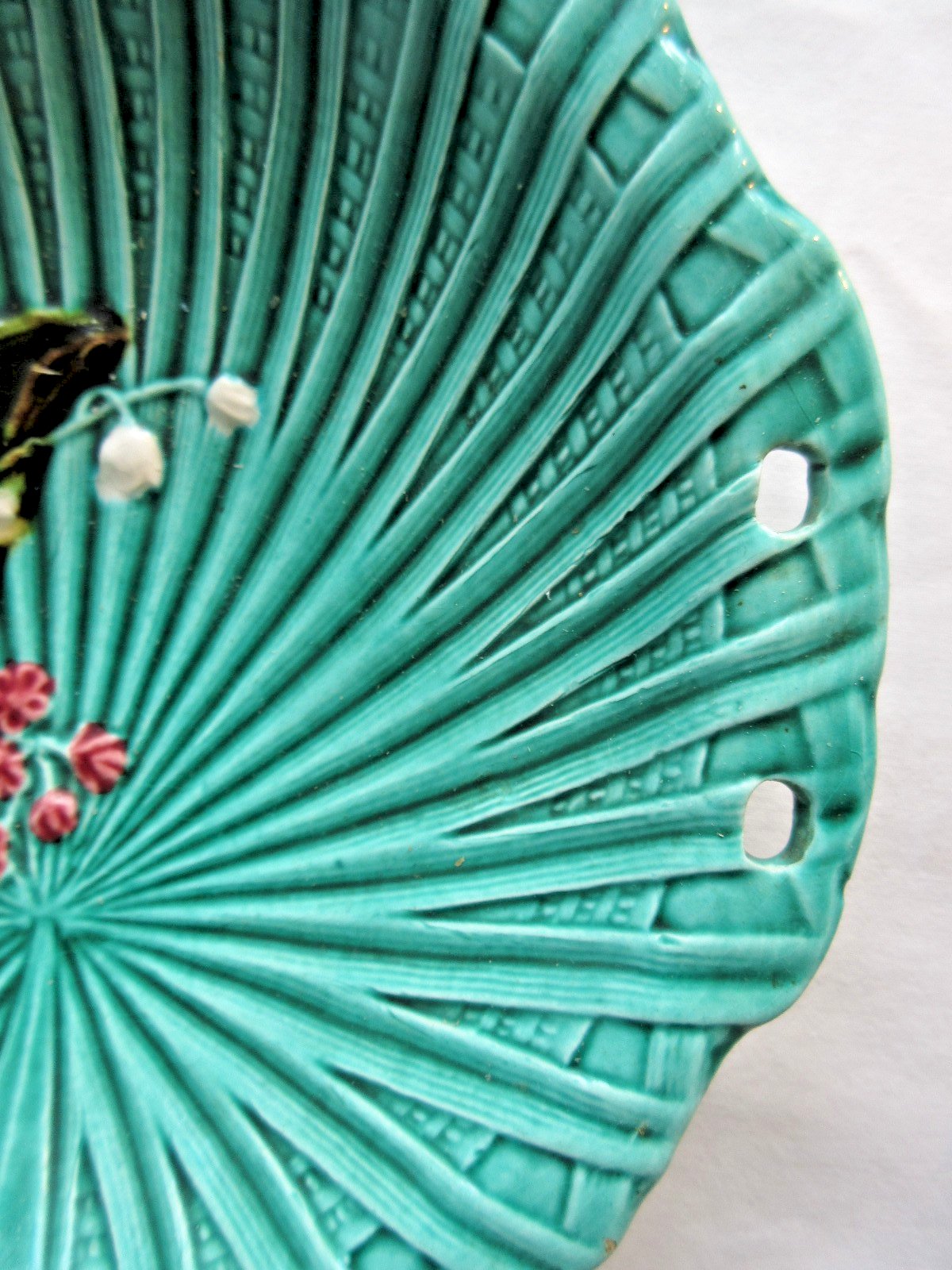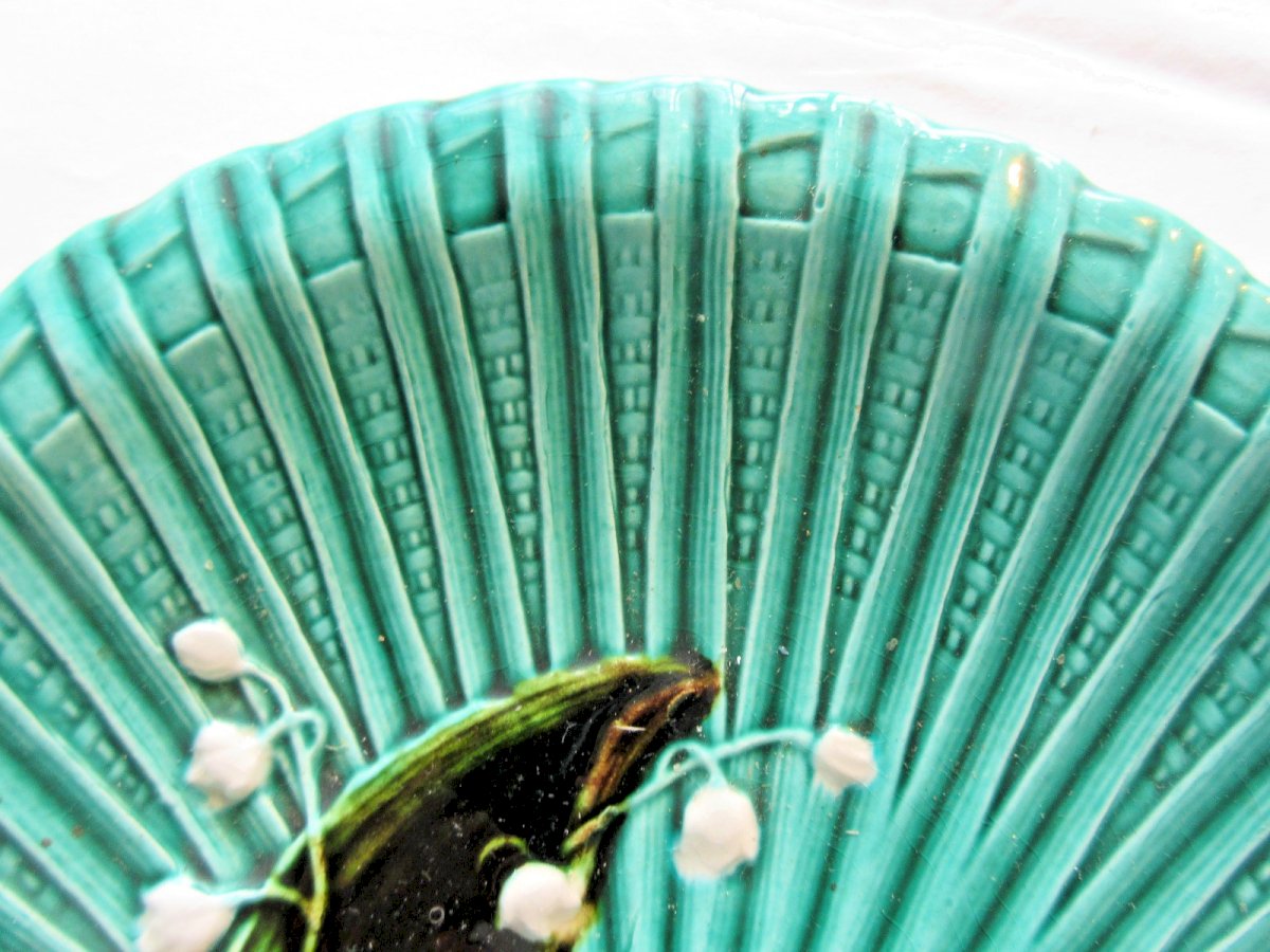 Worldwide sale. Lily of the valley and forget-me-not bowl. Small green clay pot decorated with lily of the valley and forget-me-not on a palm leaf. On each side, a handle pierced with 2 holes. Underneath, number 4583, Schramberg production. Good condition, without flaws. Diameter: 19.5 cm, Height: 3.5 cm. For collecting or gifting. Country of manufacture: Germany Materials sourced from: Germany