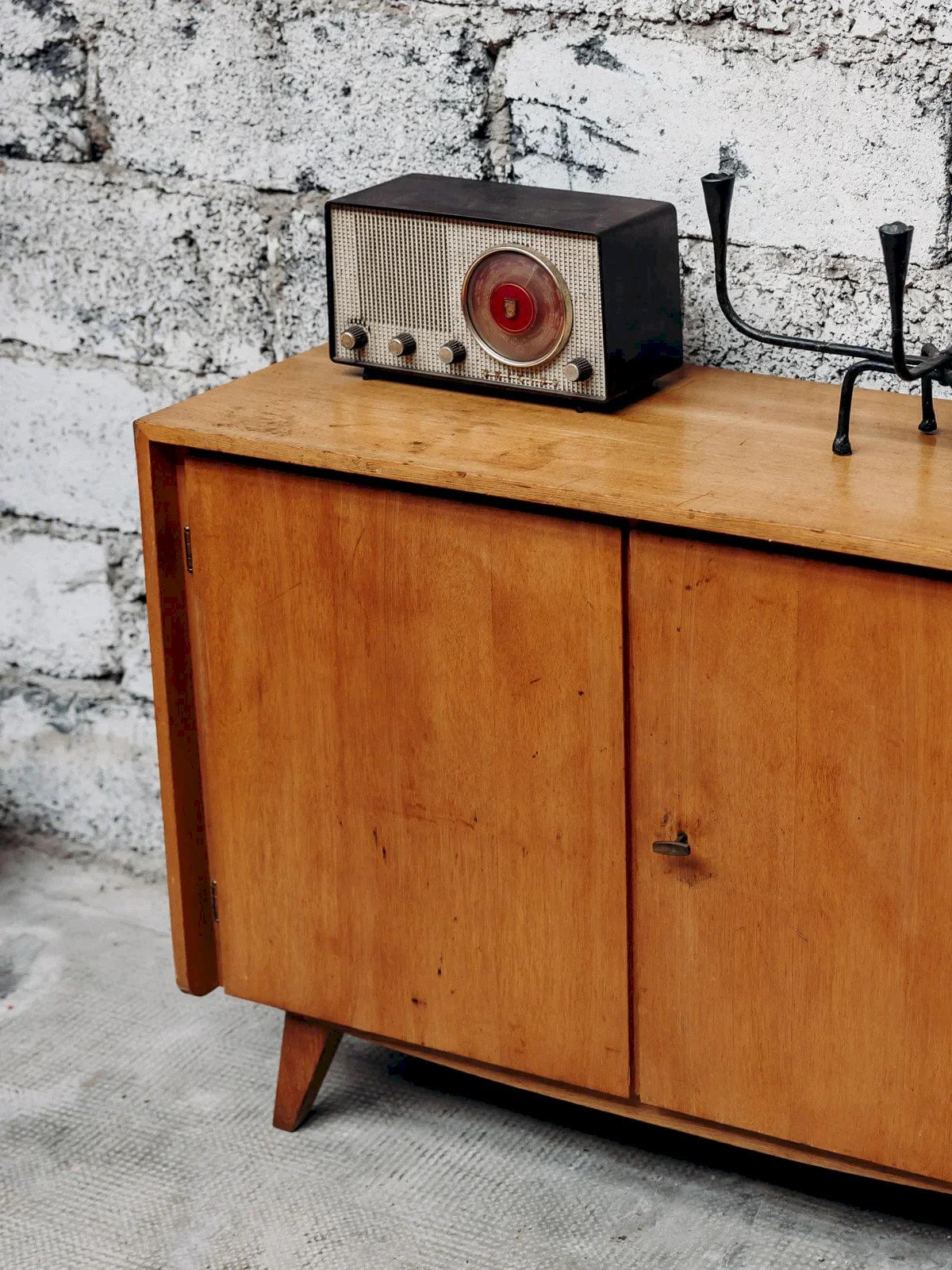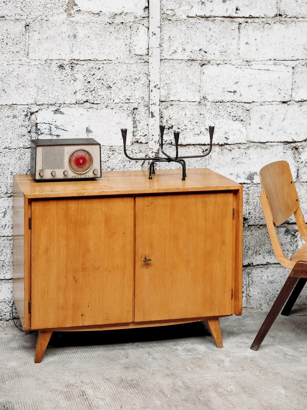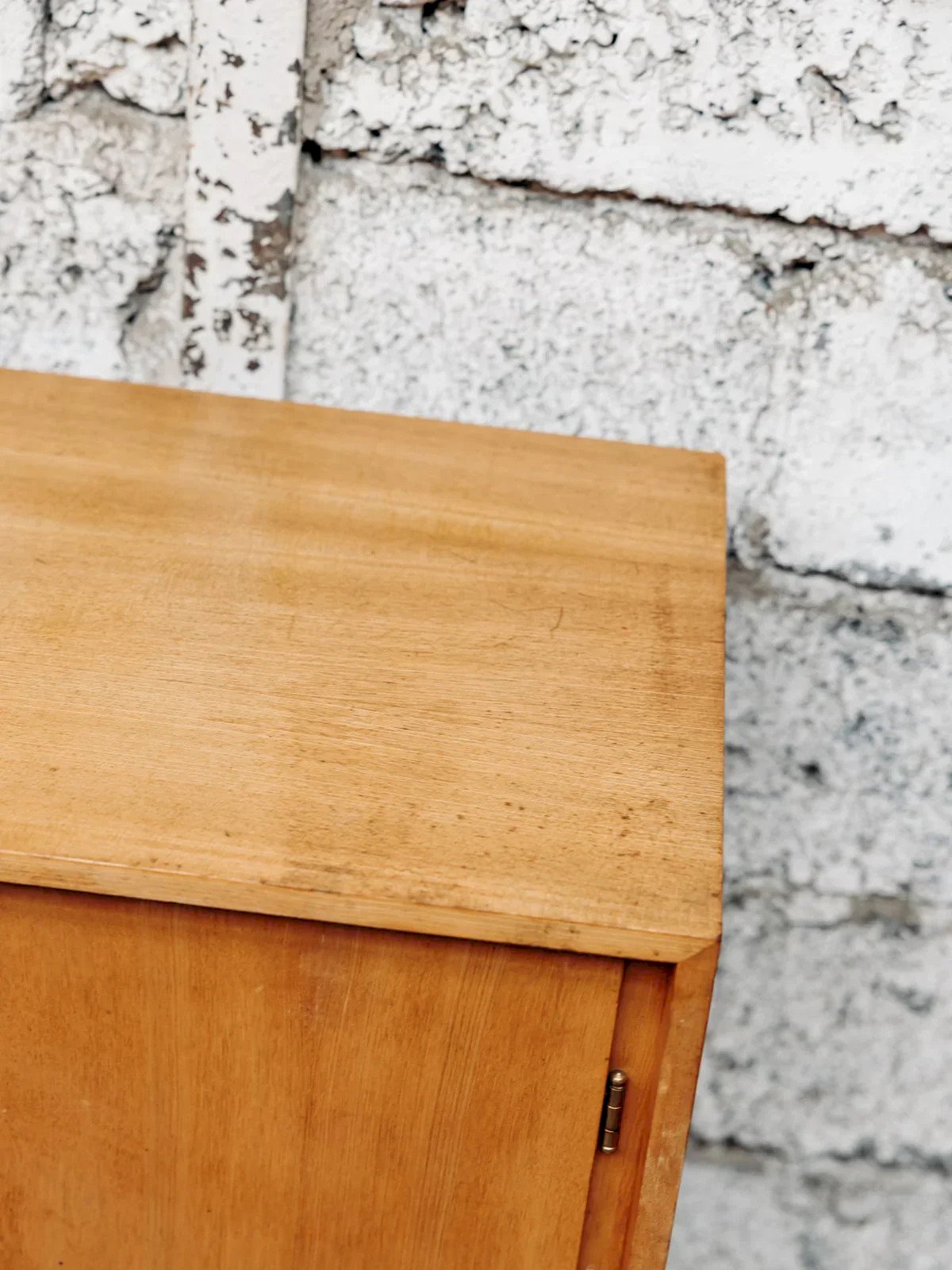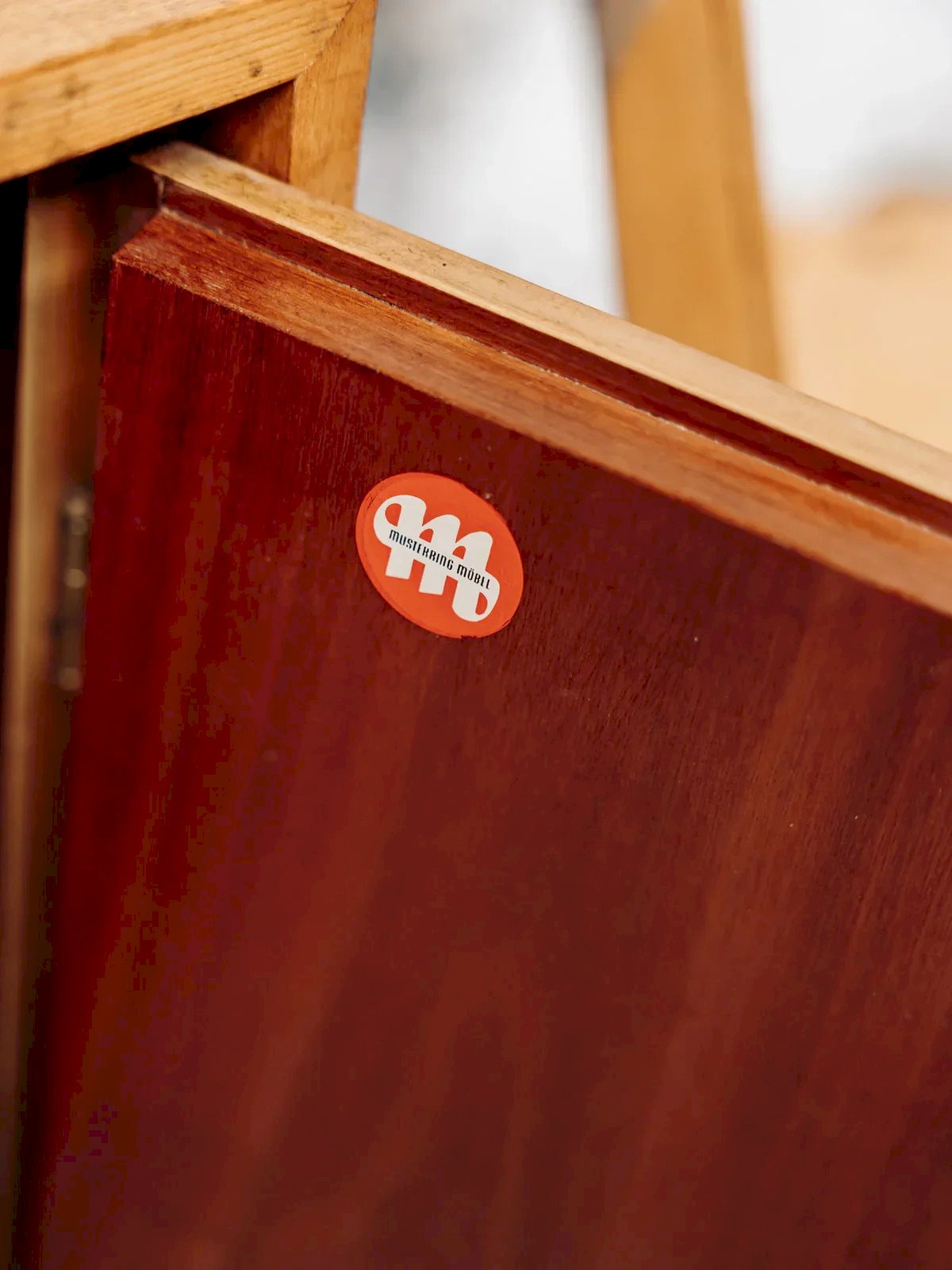 Discover this buffet by MUSTERING, featuring a sleek and warm design. Made from light wood, it rests on lovely tapered legs typical of Scandinavian style. It has two cupboard doors with a functional key to keep your belongings safe. The clean lines and meticulous finishes make it both a practical and decorative piece of furniture. Perfect for a living room or an entrance. Length: 100 cm Height: 78 cm Depth: 49 cm Condition: Used: Item has been used. Item shows some superficial wear marks, fully operational and functioning correctly. It may be a demonstration model or an item returned to the store after a short period of use. the possible imperfections. Brand: Debongout Type: Vintage product Material: Wood Style: Contemporary Customized: Buffets