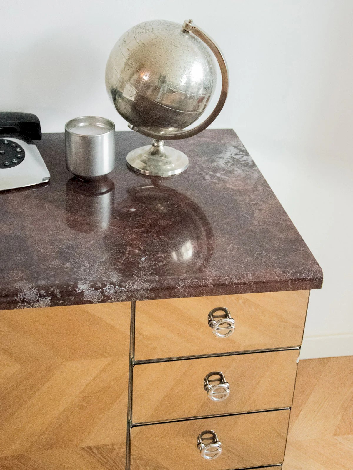 Elevate your interior with this Space Age sideboard featuring a red-purple marble veneer top, dressed with chrome metal doors and sculptural round handles. The smoked mirror glass on the facades captures the light while the chrome square legs lift a wide and low piece of furniture, perfect as a sideboard, TV stand, or storage in a contemporary dining room. Four drawers provide practical organization, and the combination of marble, chrome, and glass creates a controlled retro-glamorous atmosphere. Length: 109 cm Width: 58 cm Height: 68 cm Drawer height: 11 cm Condition: Used: Item has been used. Item shows some superficial signs of wear... Used: Item has been used. Item shows some superficial signs of wear, fully operational and functioning correctly. It may be a demonstration model or an item returned to the store after a short period of use. the possible imperfections. Brand: Debongout Type: Vintage product Material: Wood, Glass Style: Contemporary Custom: Sideboards
