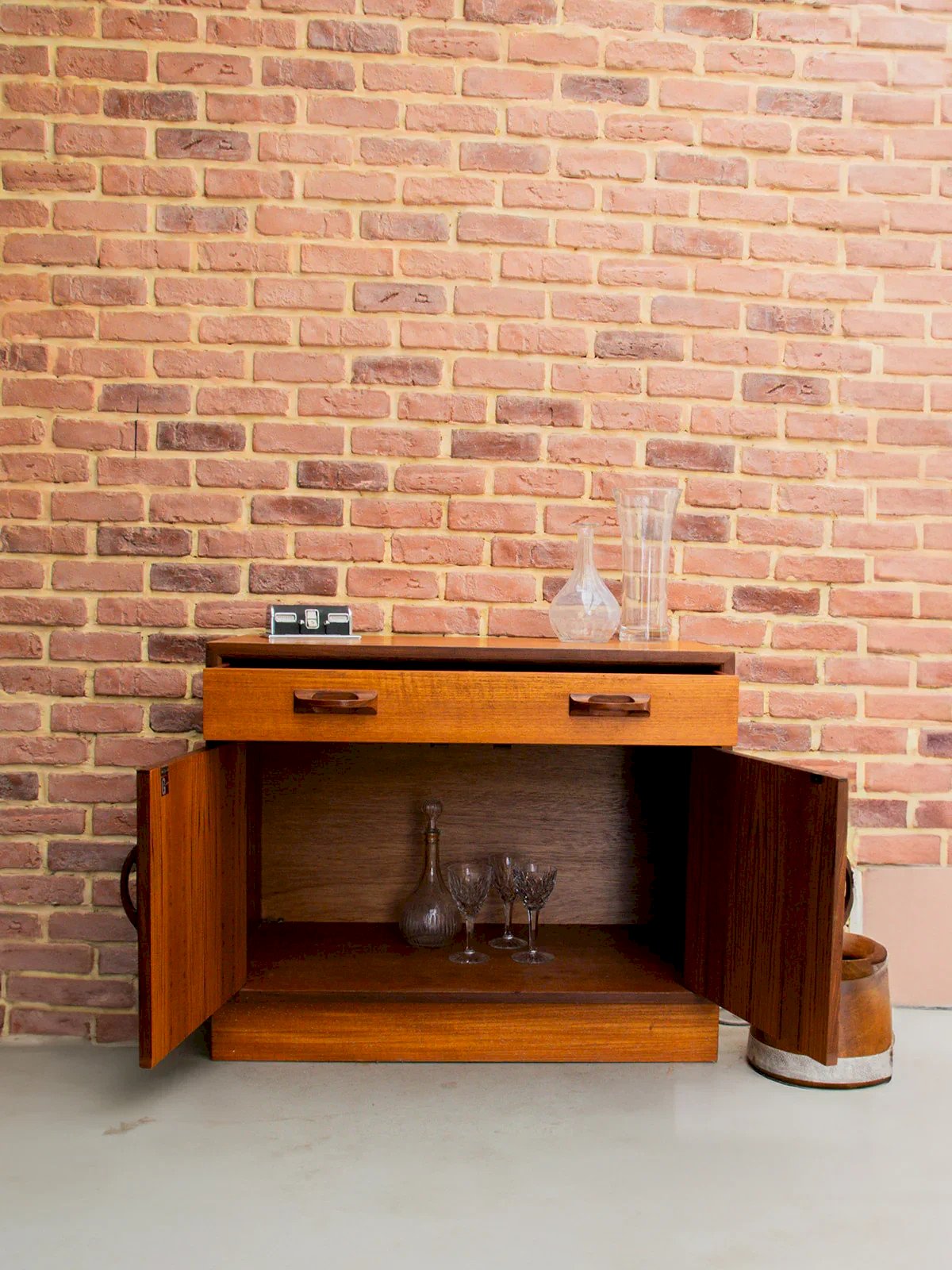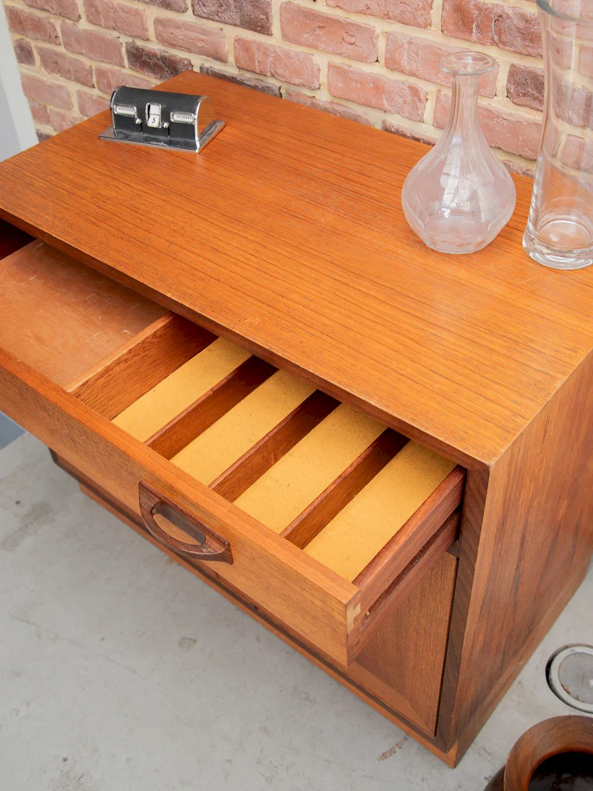 Discover this 1960s teak sideboard, signed by GPlan, which harmoniously combines two tones of light and dark wood with a beautiful grain. It features a cleverly divided drawer for cutlery storage. Its large niche, closed by two doors, offers additional storage space. Some signs of wear reflect its authentic character. A functional and elegant piece, perfect for enhancing your interior. Length: 84 cm Height: 69 cm Depth: 46 cm Condition: Used: Item has been used. Item shows some signs of superficial wear... Used: Item has been used. Item shows some signs of superficial wear, fully operational and functioning properly. It may be a display model or a returned item after a short period of use. any possible imperfections. Brand: Debongout Type: Vintage Find Material: Teak, Wood Style: Contemporary Customizable: Sideboards