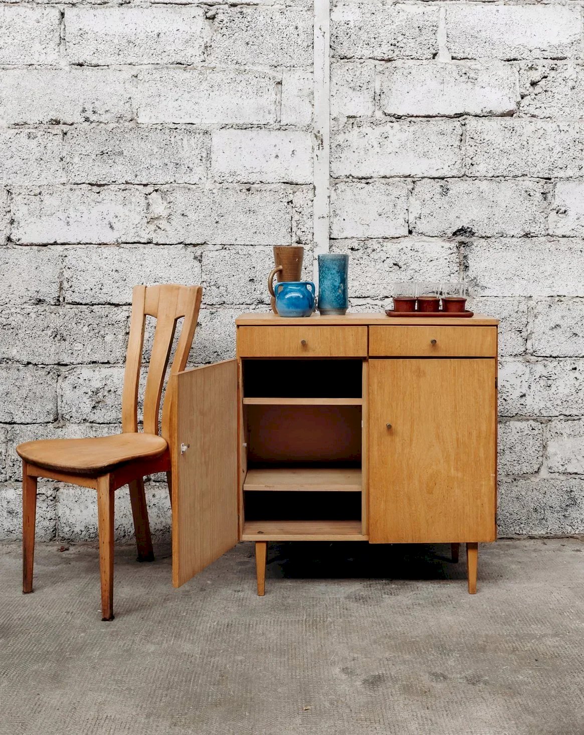 This light wood storage unit with two drawers and two cabinets combines simplicity and practicality. Its sleek design and natural finish add a touch of softness and lightness to your interior while providing a generous and well-organized storage space. Ideal for a living room or an entryway, it blends modern aesthetics with functionality. Length: 81 cm Width: 36 cm Height: 86 cm Drawer height: 9 cm Condition: Used: An item that has been used. Item with some superficial signs of wear, fully operational and functioning correctly. It may be a display model or a product returned to the store after a short period of use, along with any potential imperfections. Brand: Debongout Type: Vintage product Material: Wood Style: Contemporary Customized: Sideboards