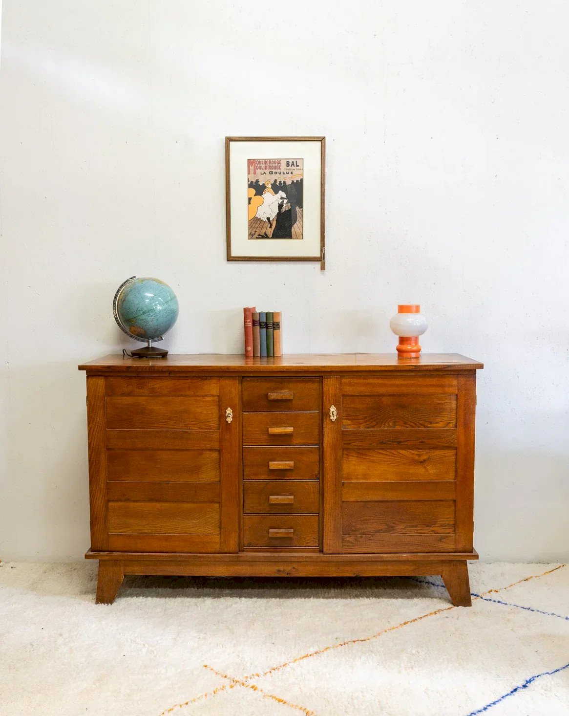 Enhance your interior with this oak sideboard attributed to René Gabriel, featuring elegant lines and a stylish appearance. Its two lockable doors and internal shelves, complemented by five wooden-handled drawers, provide organized storage for crockery, linen, or everyday items, while the wood's patina creates a warm and authentic atmosphere. Some signs of age and a flaw on the top tell its story. Length: 154 cm Width: 47 cm Height: 96 cm Drawer height: 9 cm Condition: Used: Item has been used. Item shows some minor superficial wear... Used: Item has been used. Item shows some minor superficial wear, fully operational and functioning correctly. It may be a demonstration model or an item returned to the store after a short period of use. Any potential imperfections. Brand: Debongout Type: Vintage product Material: Oak Style: Contemporary Custom: Sideboards