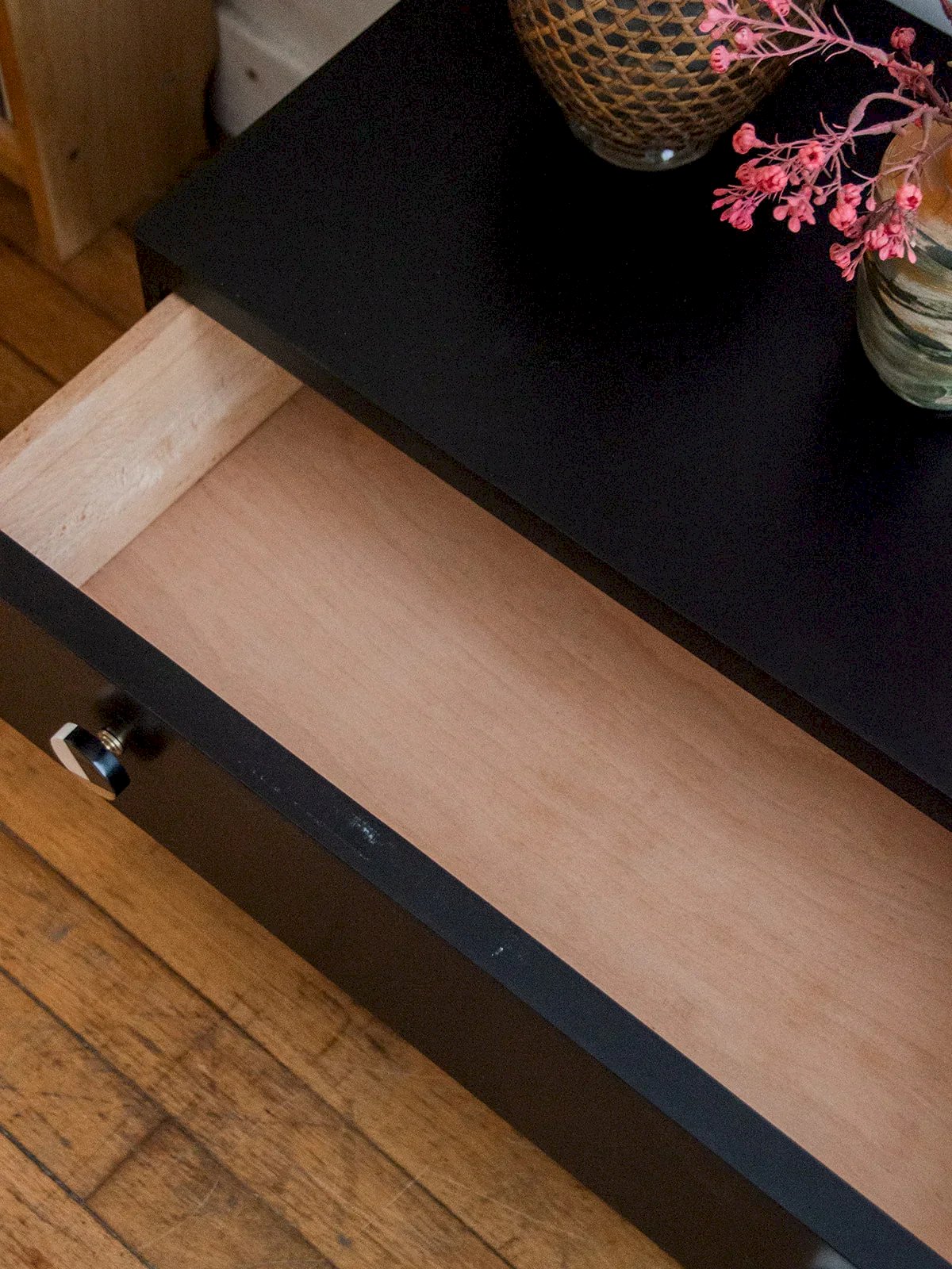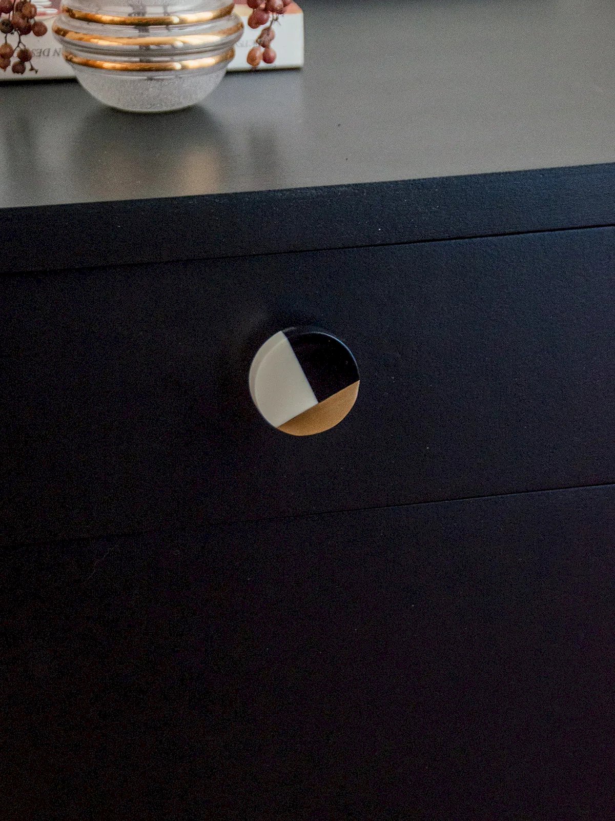 Discover this asymmetrical storage unit in Art Deco style, composed of two elegantly interlocking volumes. Carefully restored, it has been sanded and then painted in a beautiful "Deep Black" color with a satin finish. Contemporary handles replace the original ones for a more current touch. Its finely crafted legs add even more charm to the whole piece. In very good condition, it combines character and functionality. Length: 120 cm Width: 41 cm Height: 46/61 cm Drawer height: 8/13 cm Cabinet height: 36 cm Condition: Used: Item has been used. Item shows some signs of superficial wear... Used: Item has been used. Item shows some signs of superficial wear, fully operational and functioning correctly. It may be a display model or an item returned to the store after a short period of use, along with any possible imperfections. Brand: Debongout Type: Vintage product Material: Wood Style: Contemporary Customized: Buffets