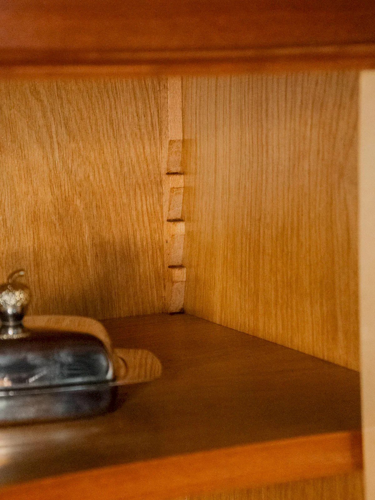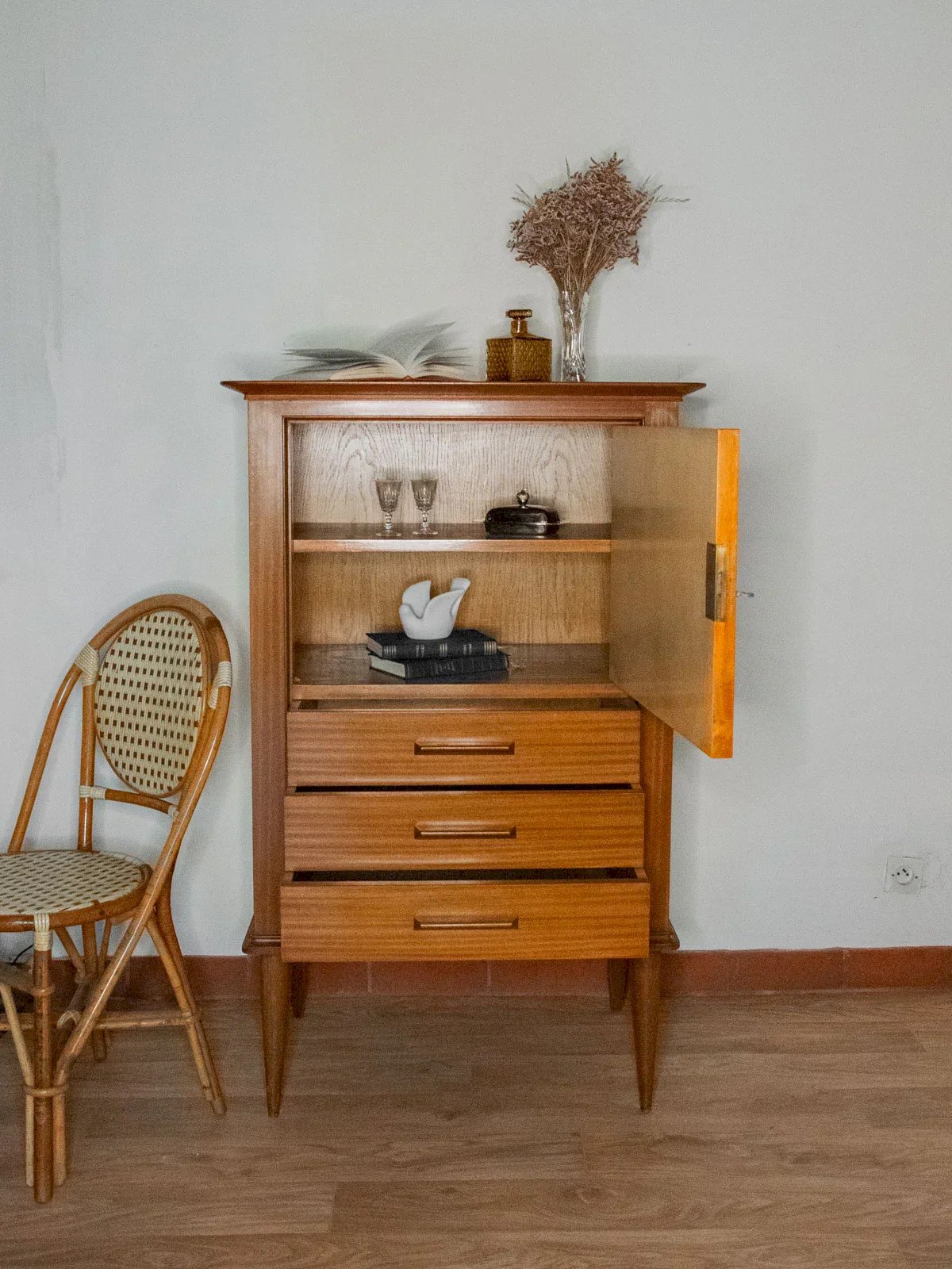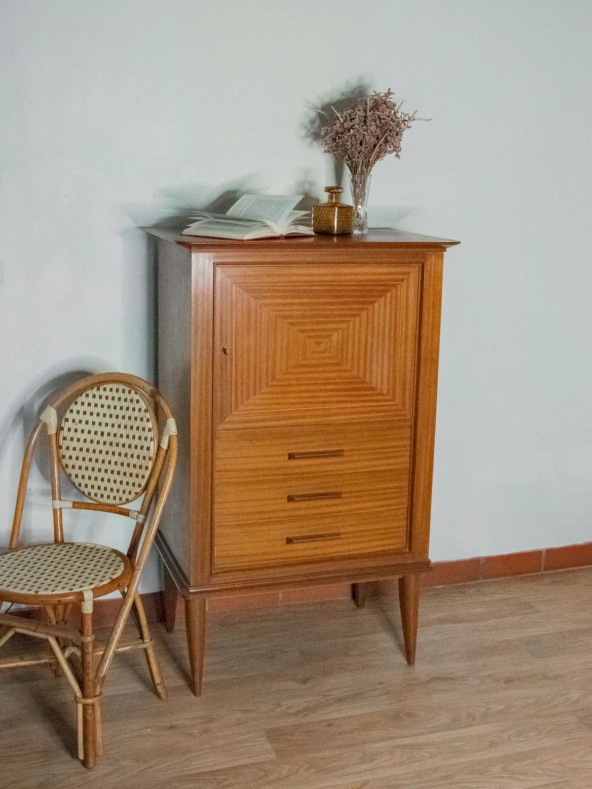 Give your interior this 70s sideboard with warm veneer, featuring geometric triangular patterns and resting on tapered legs, which imposes a chic retro style while remaining undeniably functional. One door reveals an adjustable shelf for organizing dishes or books, while three drawers provide instinctive and practical storage; the top surface becomes a beautiful display area for objects and plants, creating a warm and sophisticated ambiance. Some nicks and veneer imperfections are present. Length: 79 cm Width: 49.5 cm Height: 125 cm Drawer height: 8 cm Shelf depth: 39 cm Condition: Used: Item has been used. Item shows some superficial wear marks, fully operational and functioning correctly. It may be a demonstration model or an item returned to the store after a short period of use. Any imperfections. Brand: Debongout Type: Vintage product Material: Wood Style: Contemporary Customized: Sideboards