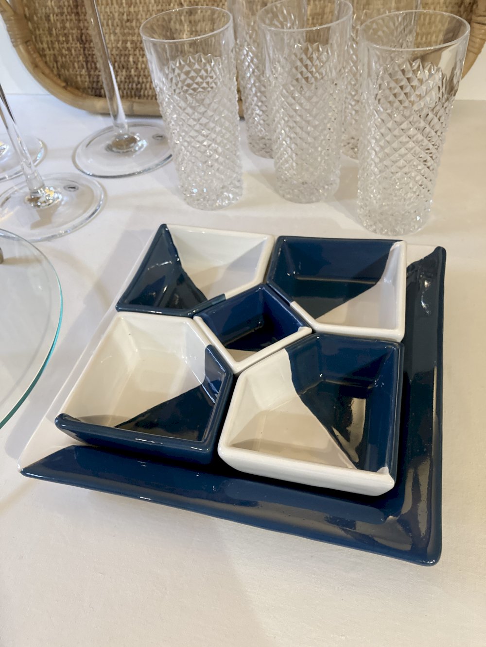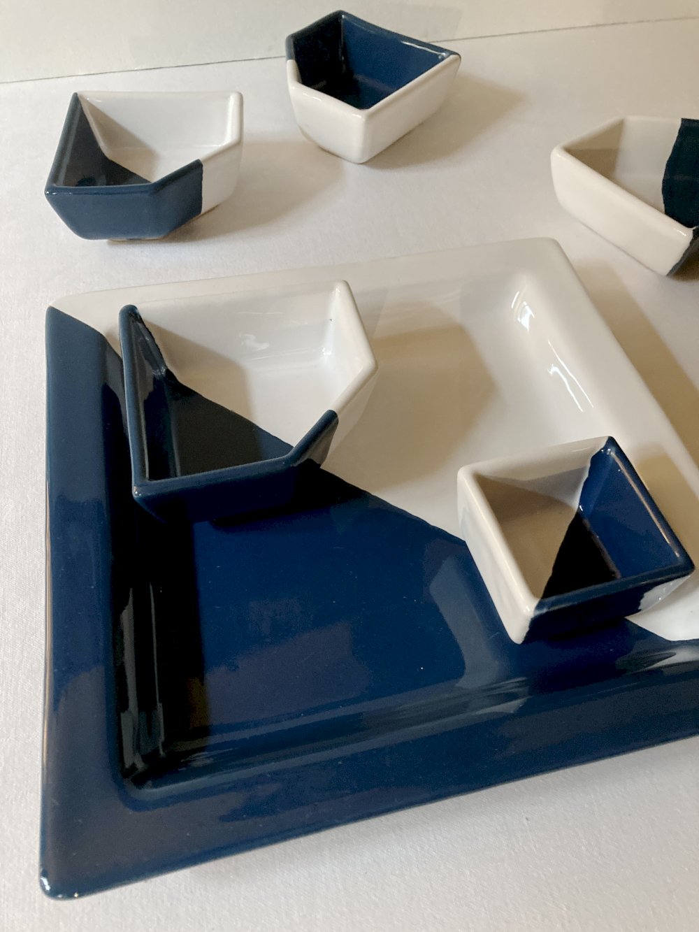 Hand-painted ceramic appetizer server, featuring a geometry of contrasting white and blue.