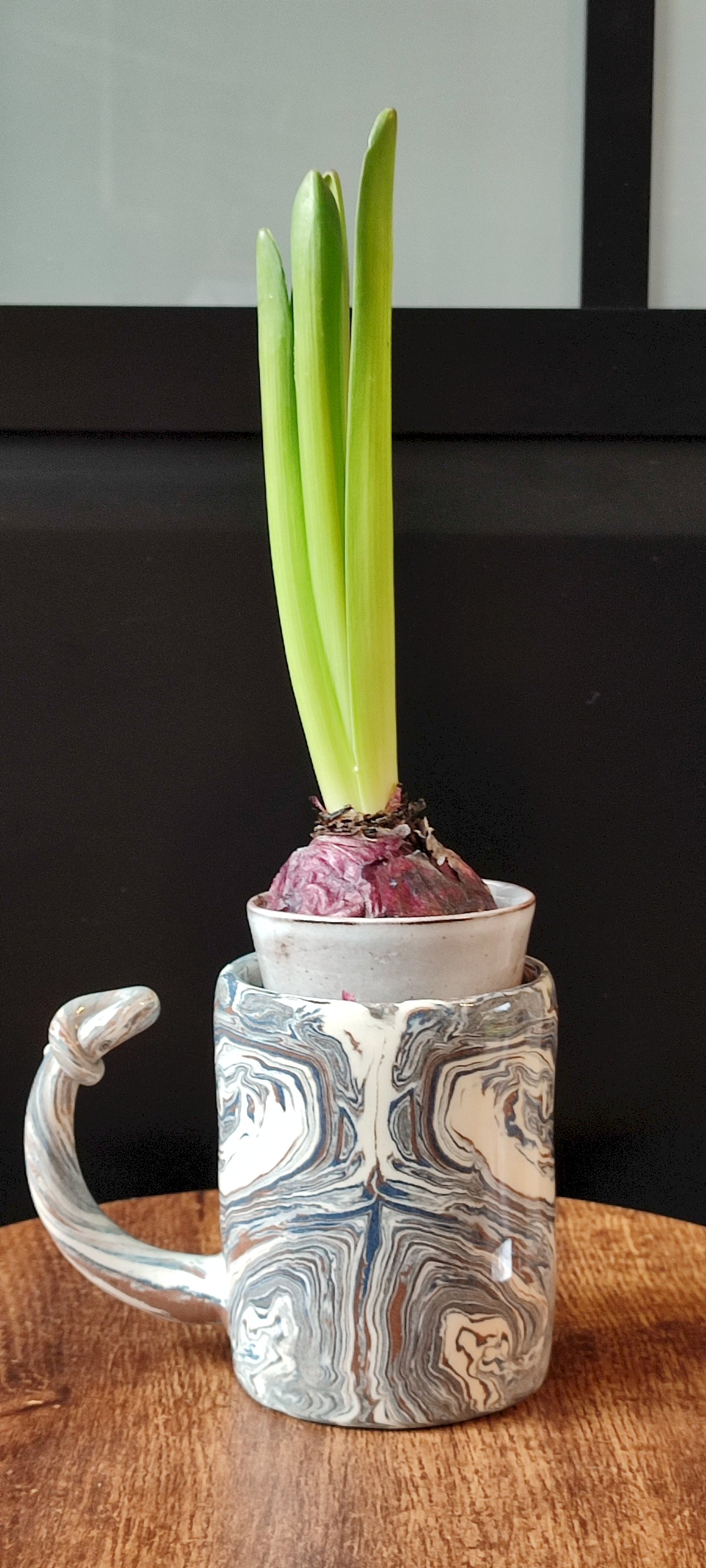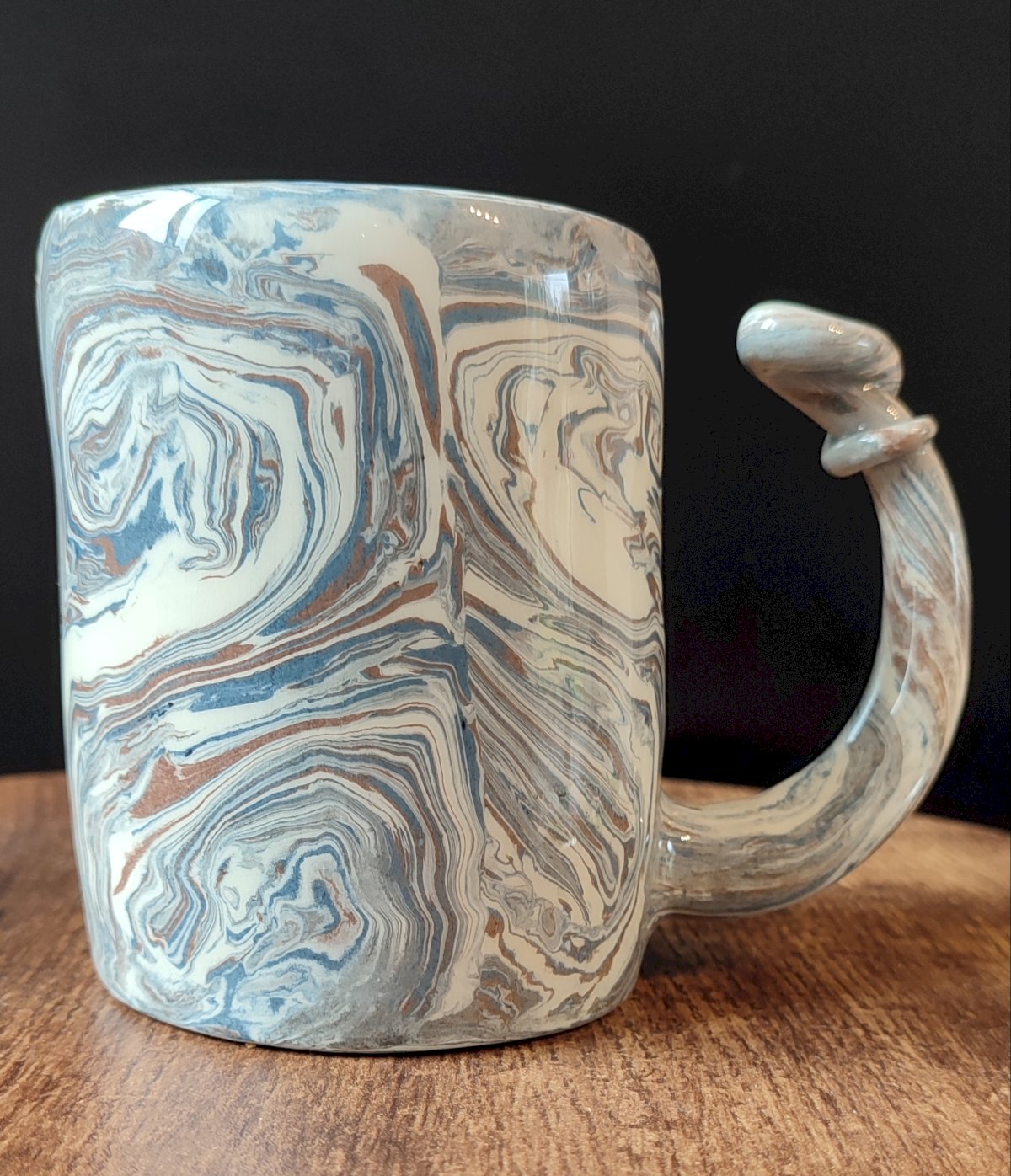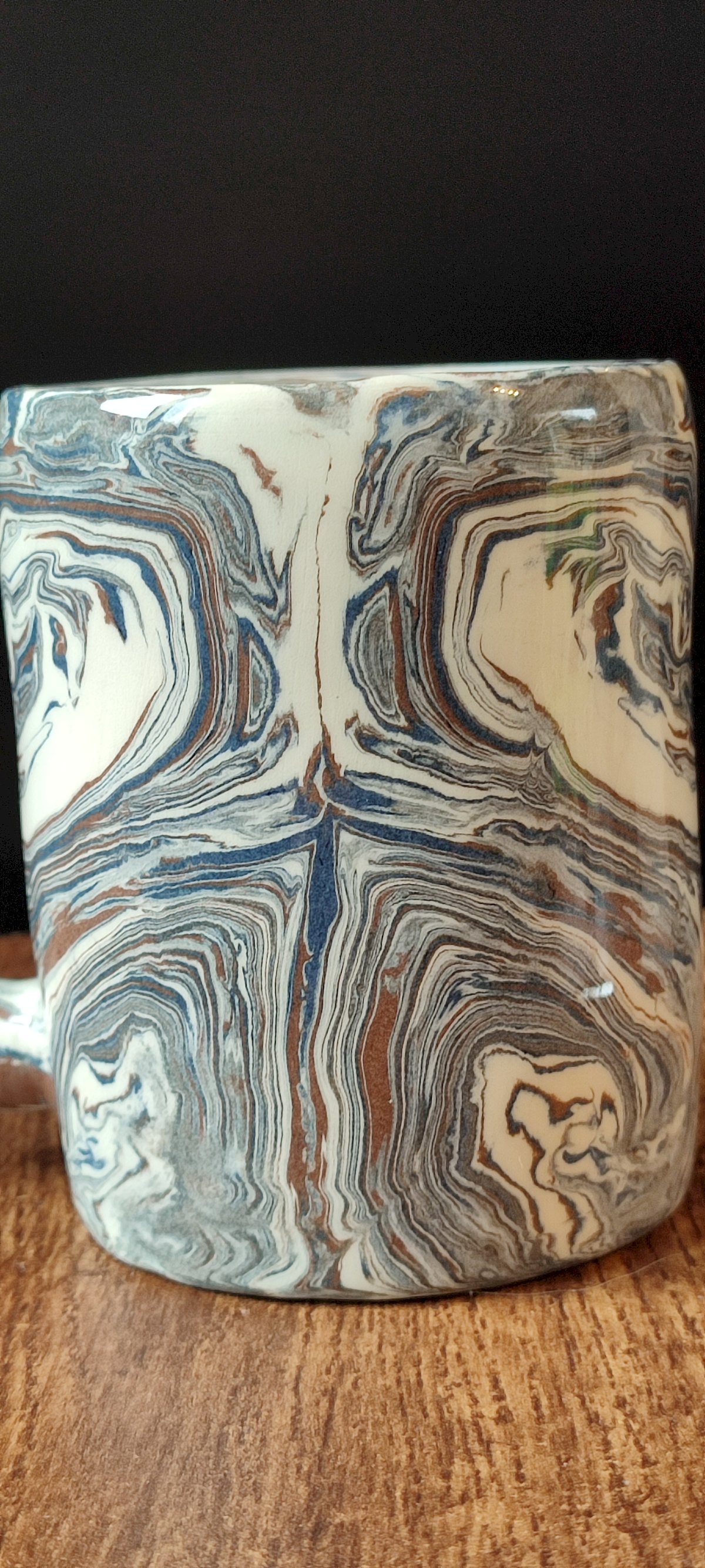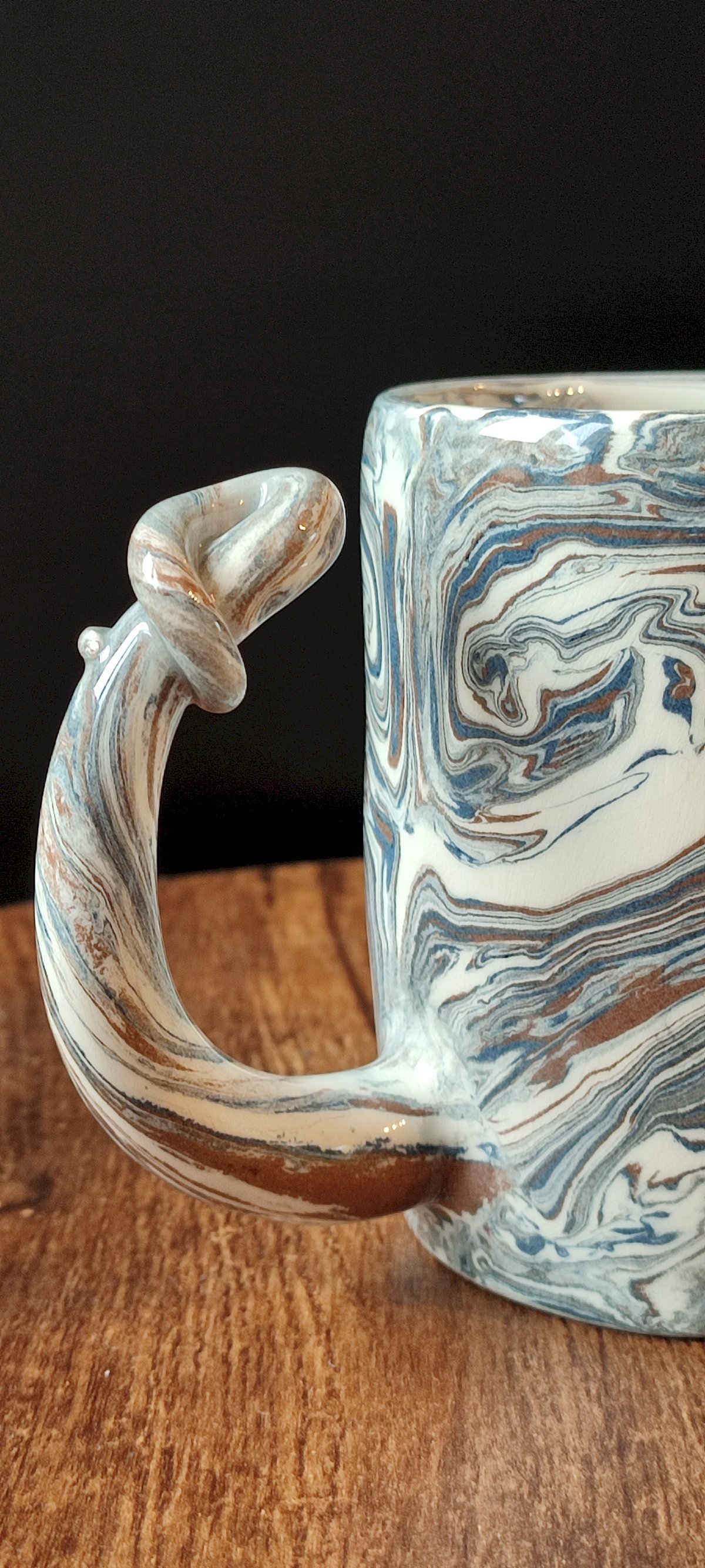 Marbled decoration achieved through mixed clay technique, each piece displaying a unique pattern. Shaping and glazing done by hand.