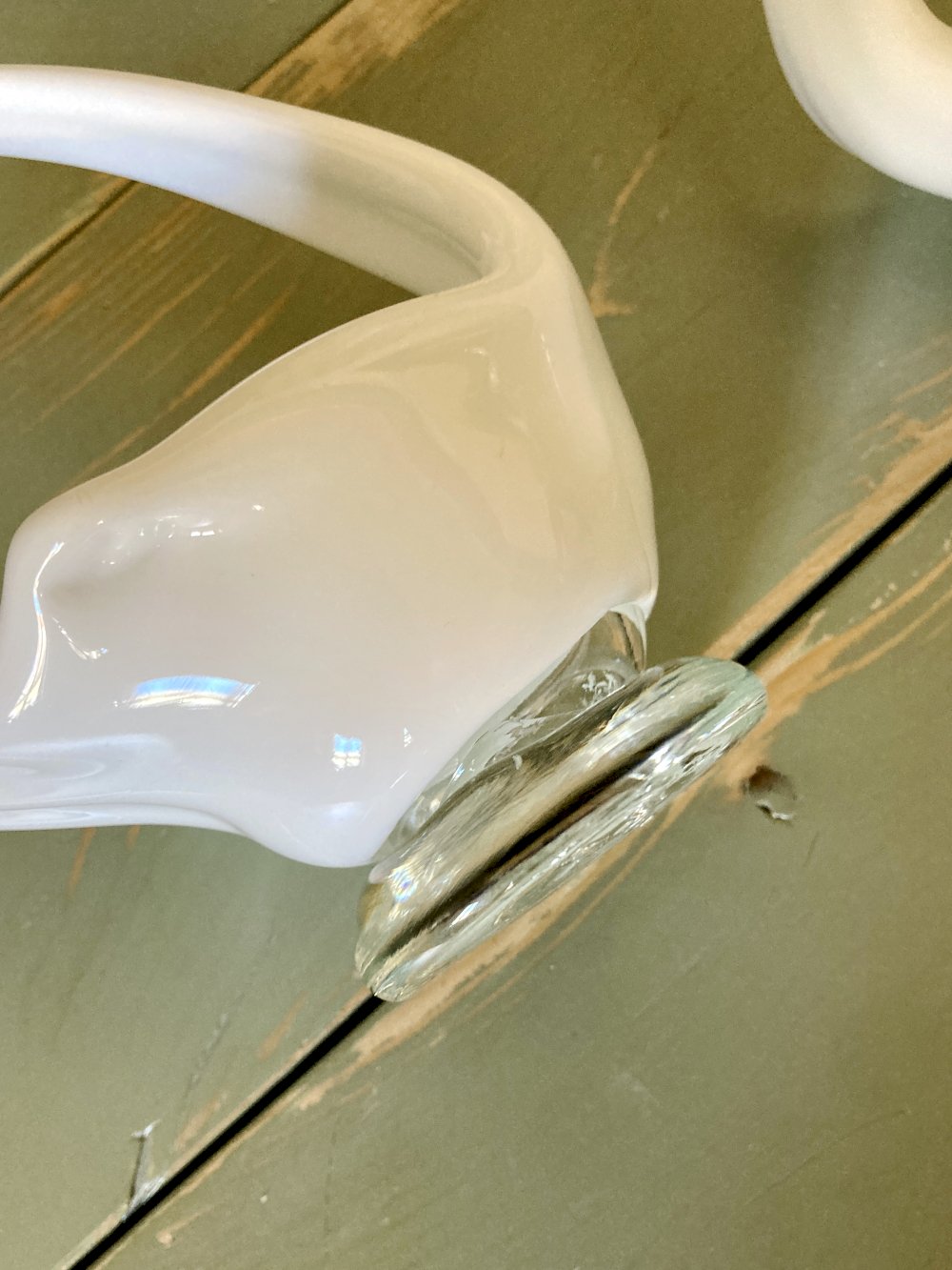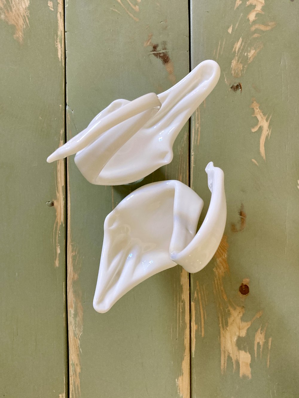 They are made of blown white opaque glass, shaped and mounted on a translucent blown glass base.