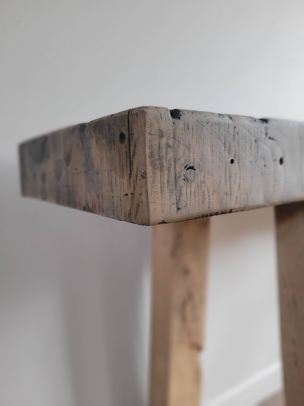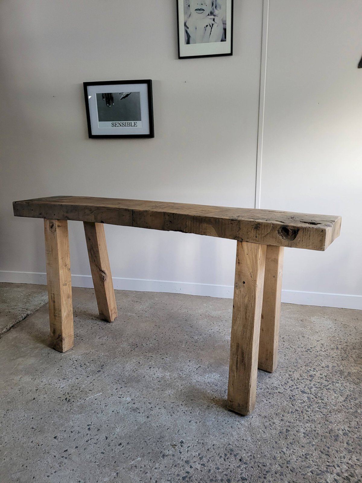 We appreciate the contrast between the top, with a marked brown patina, a witness to the past, and the legs made of lighter wood. This workshop furniture could just as well serve as a console in an entryway or a living room, an ideal piece in a Wabi-sabi style interior where craftsmanship and imperfection are at the heart of beauty. Generally in good condition, with signs of wear here and there. Dimensions: 155 X 75 X 31 cm (L X H X D). L: 155 W: 31 H: 75
