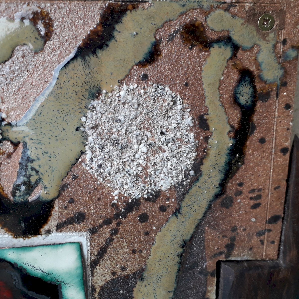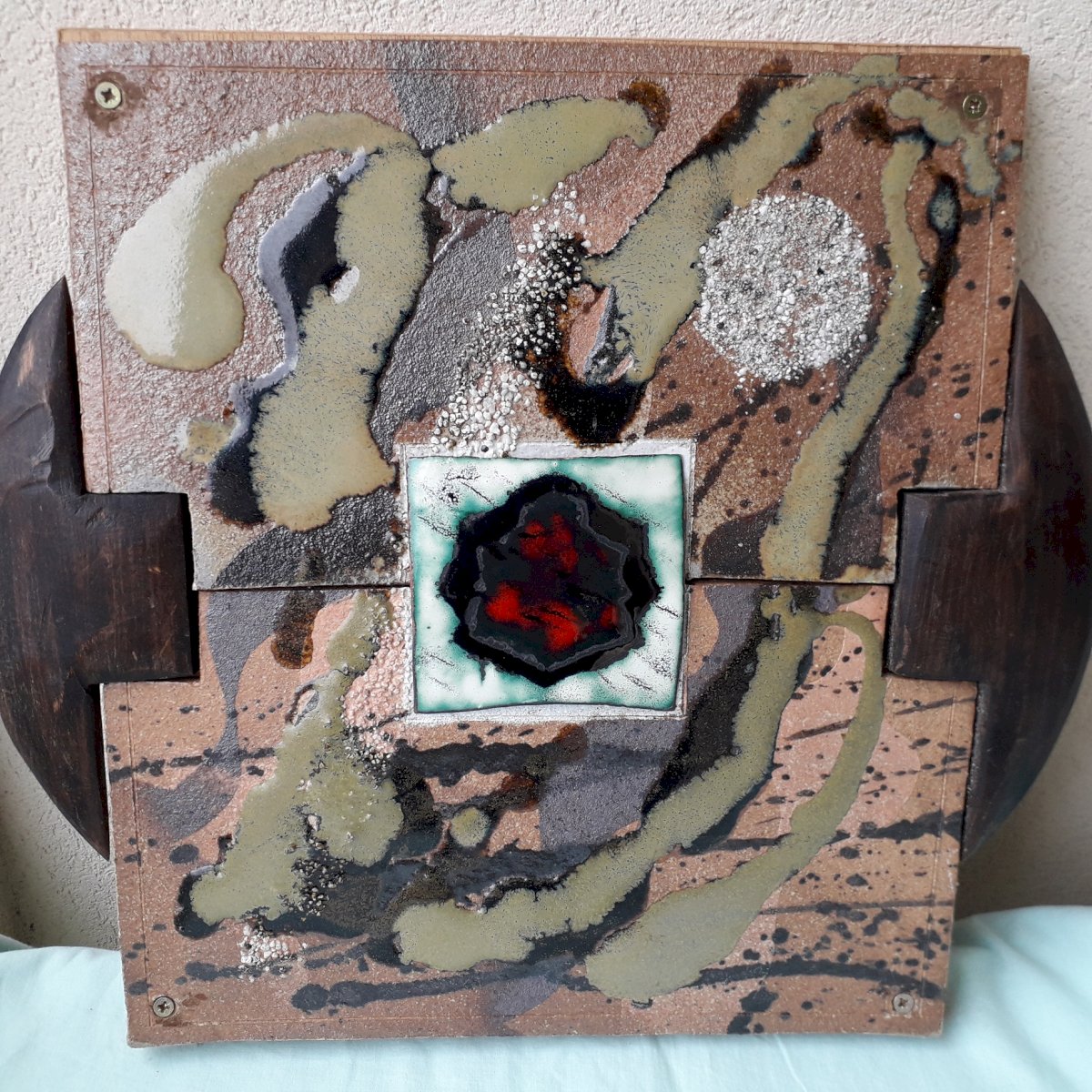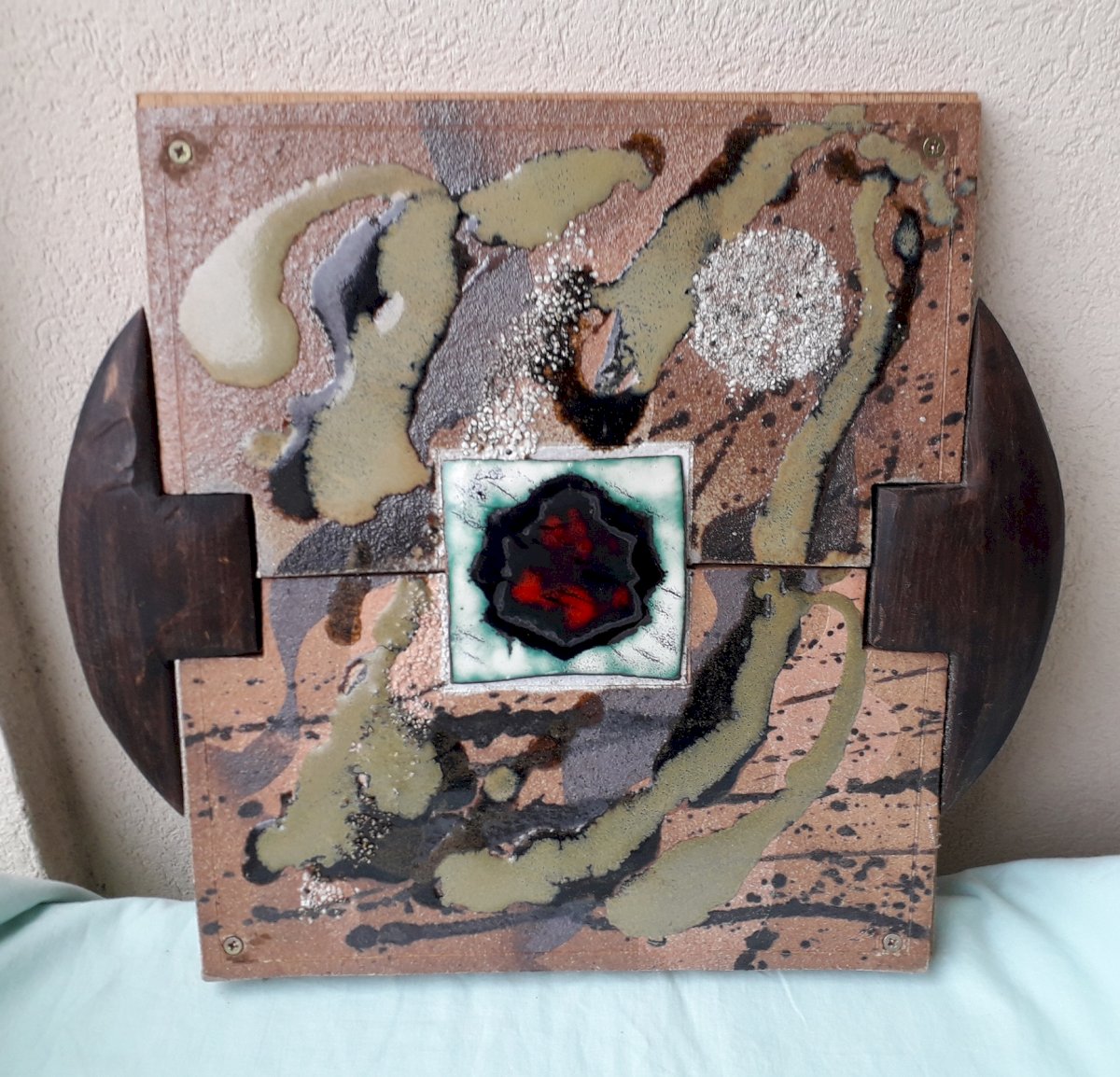 Handmade wall decoration, combining several materials: at the center a porcelain-enamelled copper plate, resting on two stoneware plates partially covered with enamel, with small pebbles in other places; all encased in a wooden part. Artist's signature at the bottom right (see photos), to be deciphered.