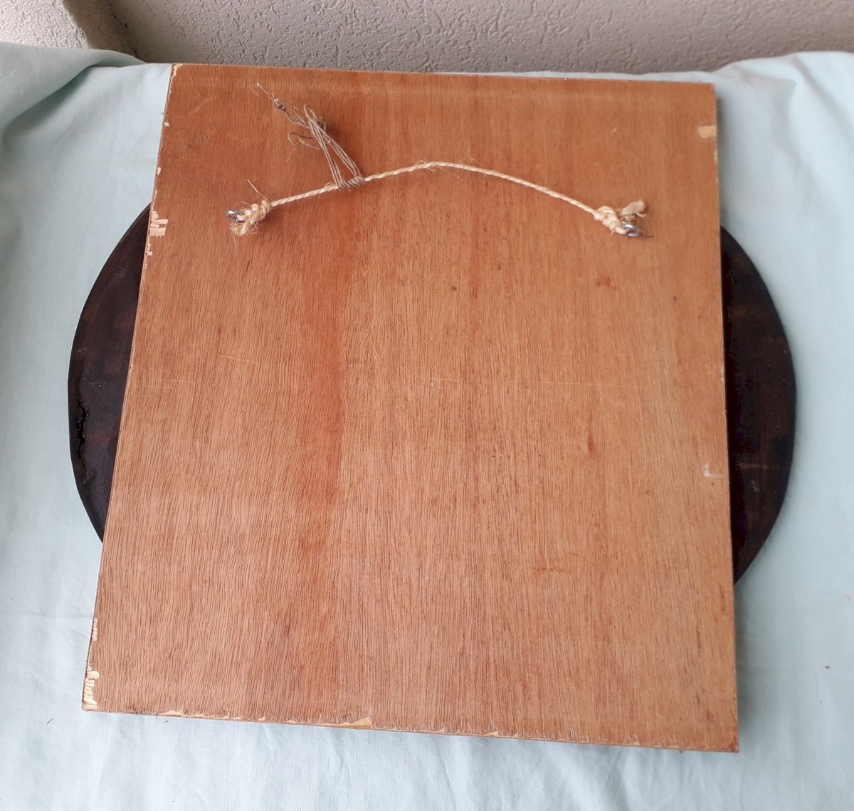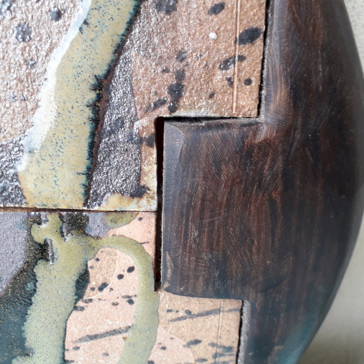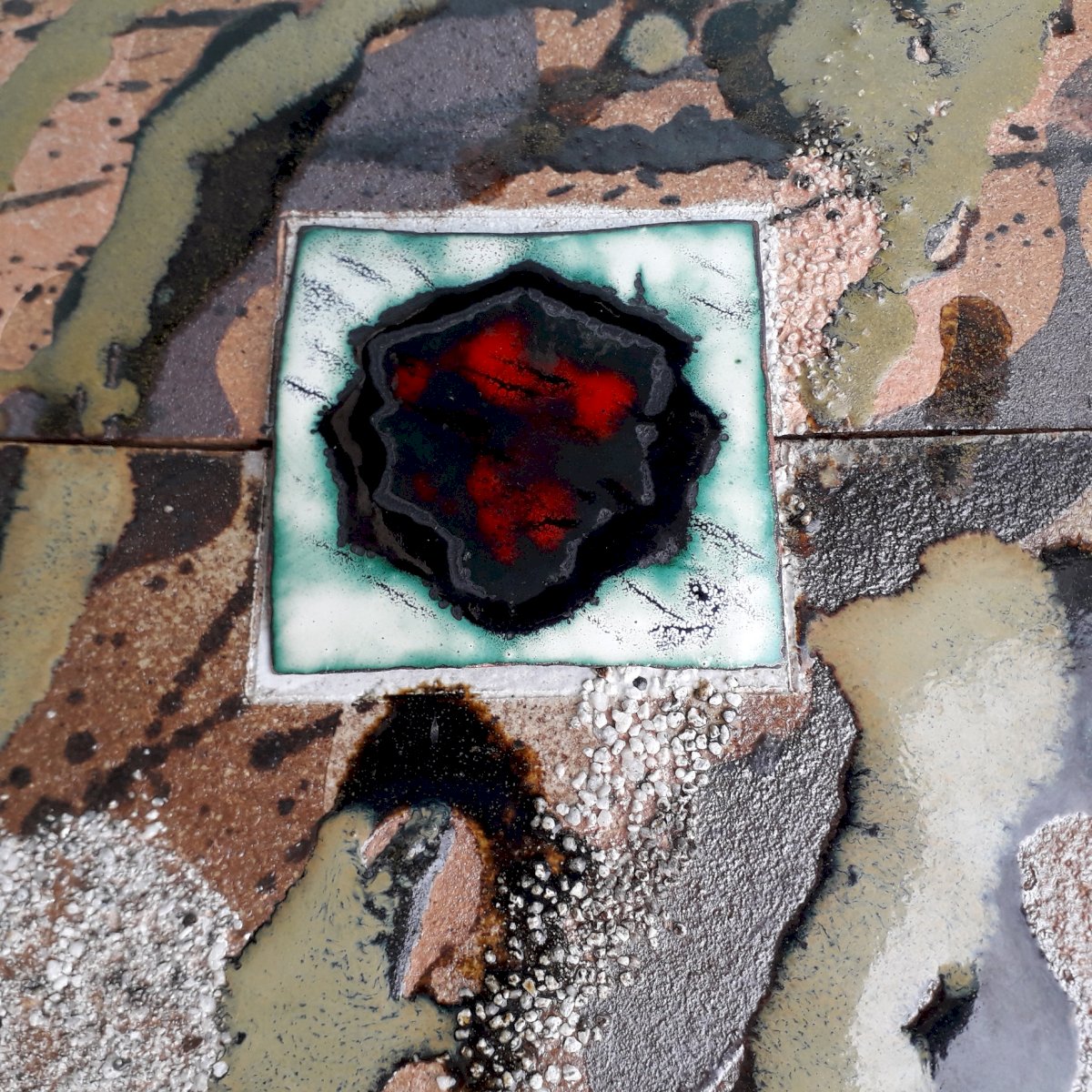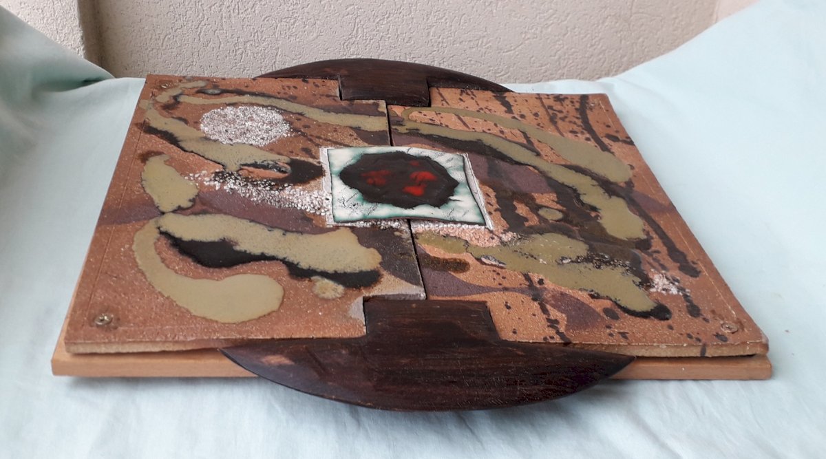 Handmade wall decoration, combining several materials: at the center a porcelain-enamelled copper plate, resting on two stoneware plates partially covered with enamel, with small pebbles in other places; all encased in a wooden part. Artist's signature at the bottom right (see photos), to be deciphered.