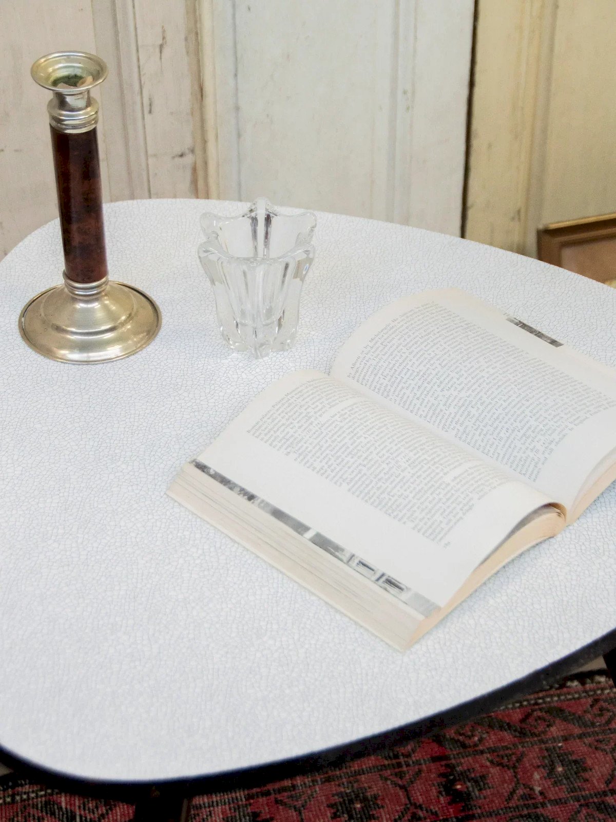 Adopt this triangular side table from the 50s/60s with retro charm, featuring a free-form white top and three tapered wooden legs enhanced with brass tips. Its compact size and lightweight yet sturdy construction make it perfect as a coffee table, end table, or decorative element, providing punctual storage and a practical surface. The combination of wood and white brings a subtle elegance and vintage warmth, ideal for enhancing a contemporary or Scandinavian living room. Height: 58 cm Diameter of the top: 59 cm Condition: Used: Item that has been used. Item showing some signs of superficial wear,...Used: Item that has been used. Item showing some signs of superficial wear, fully operational and functioning properly. It may be a display model or an item returned to the store after a short period of use. possible imperfections. Brand: Debongout Type: Vintage product Material: Wood, Brass Style: Contemporary Custom: Side tables