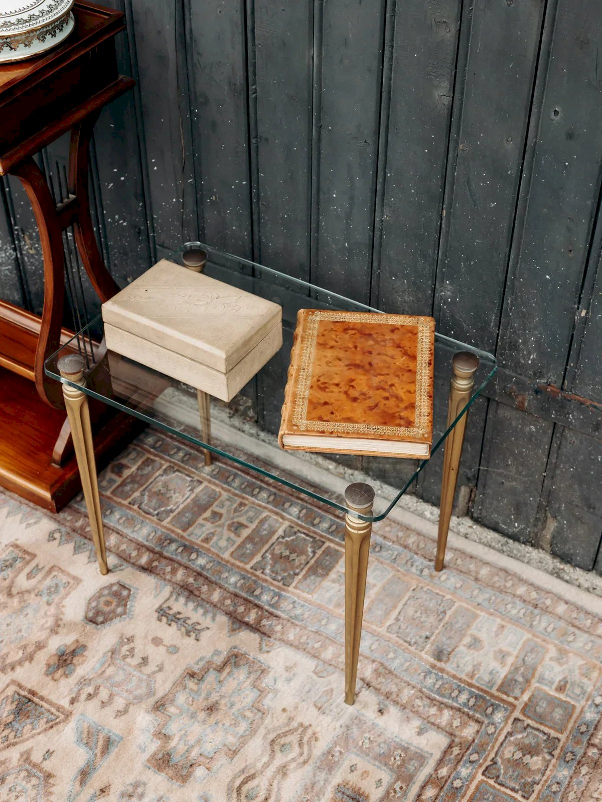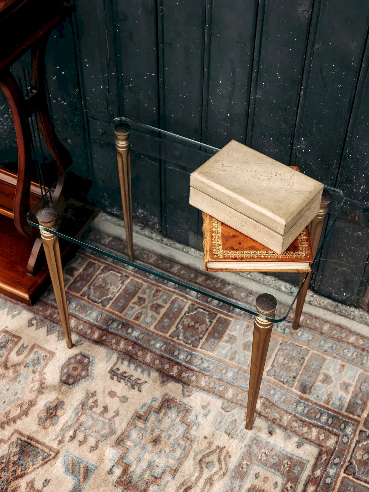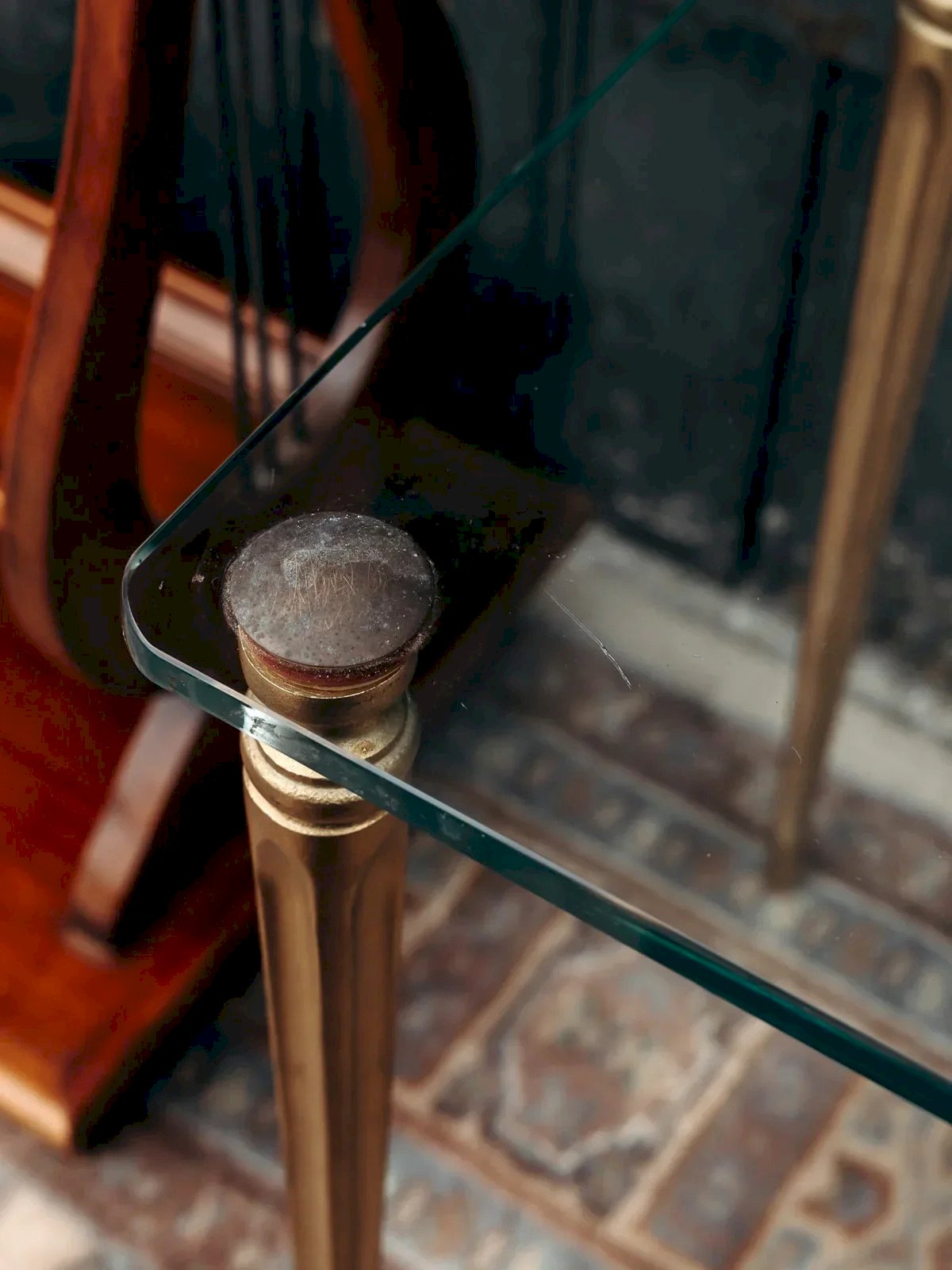 Add a touch of elegance to your living room with this coffee table featuring a refined glass top, enhanced by fluted golden brass legs. Practical and decorative, it holds your books, objects, or cups of tea while adding a luminous and chic note to your interior. A piece with contemporary design that brings style and refinement to your living space. Length: 45 cm Height: 37.5 cm Depth: 30 cm Condition: Used: Item has been used. Item shows some superficial signs of wear... Used: Item has been used. Item shows some superficial signs of wear, fully operational and functioning properly. It may be a demonstration model or an item returned to the store after a short period of use. Any imperfections. Brand: Debongout Type: Thrifted product Material: Glass, Brass Custom: Side tables Style: Contemporary