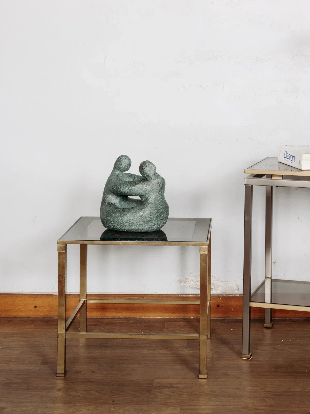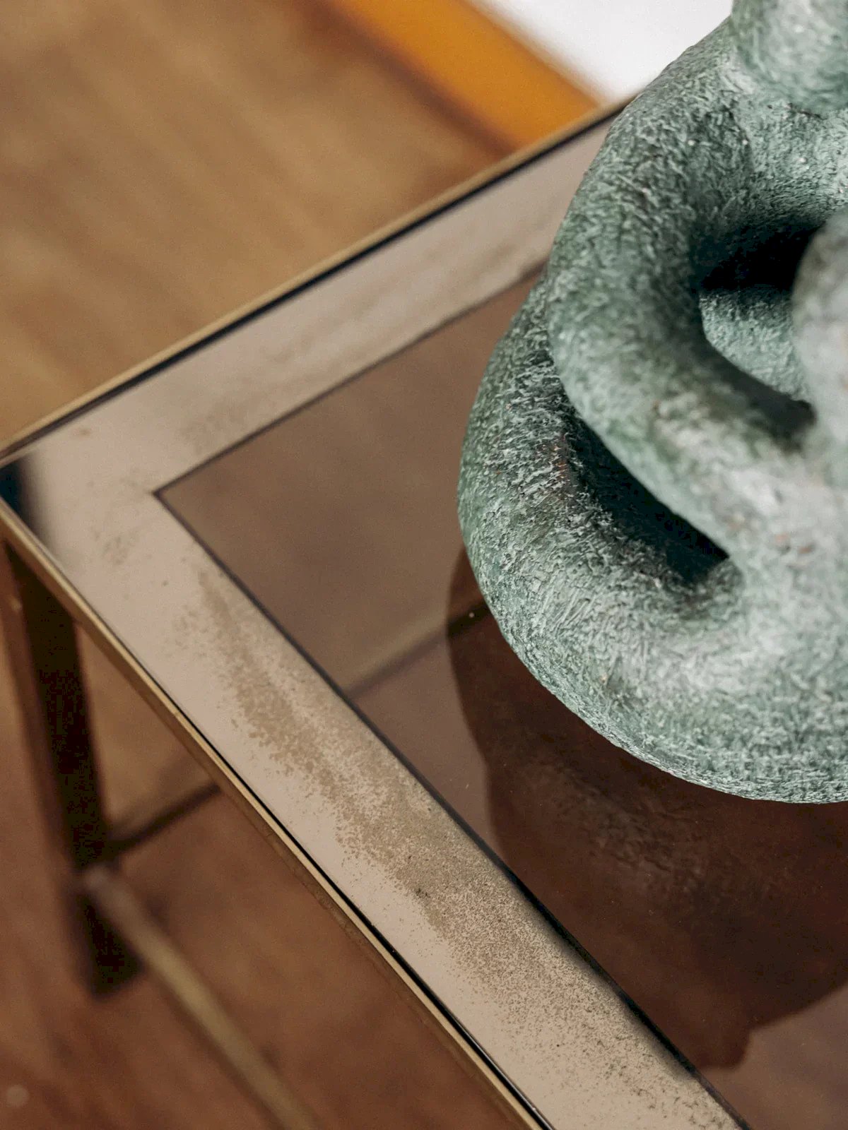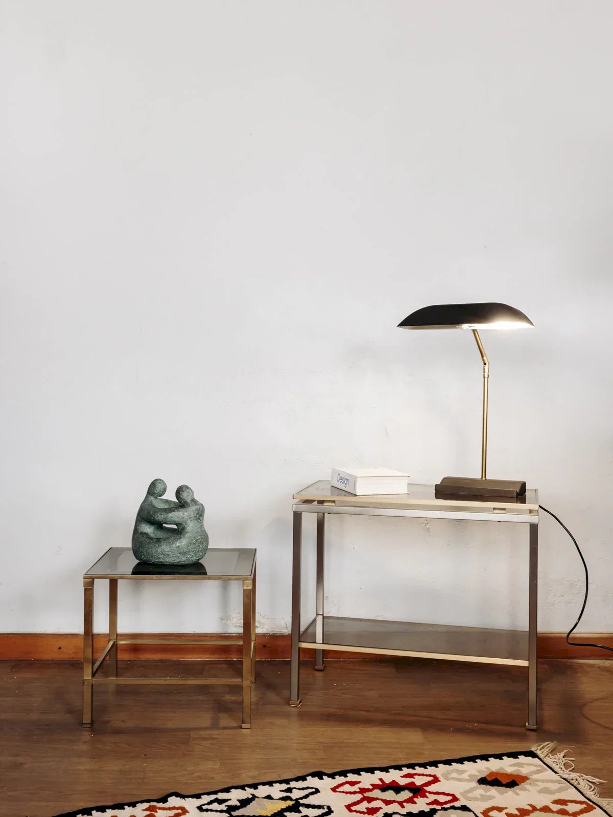 This small metal and glass side table is appealing due to its minimalist and modern design. The combination of sleek metal and transparent glass adds a touch of lightness and chic to your space. Perfect for adding an elegant and practical accent to your living room or hallway, it easily integrates into all styles of decoration. Web exclusive, the meeting will take place at your home! Length: 41 cm Width: 35.5 cm Height: 36.5 cm Condition: Used item: An item that has been used. Item shows some superficial signs of wear, ...Used item: An item that has been used. Item shows some superficial signs of wear, fully operational and functioning properly. It may be a demonstration model or an item returned to the store after a short period of use. any potential imperfections. Brand: Debongout Type: Vintage product Material: Metal, Glass Style: Contemporary Customized: Side tables