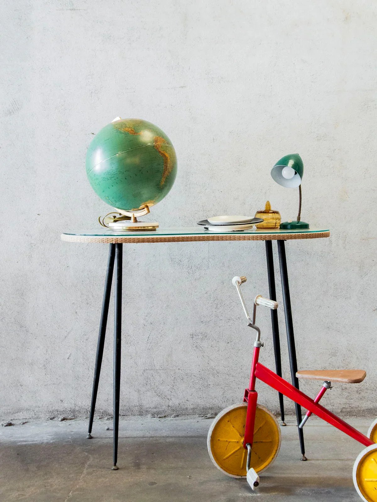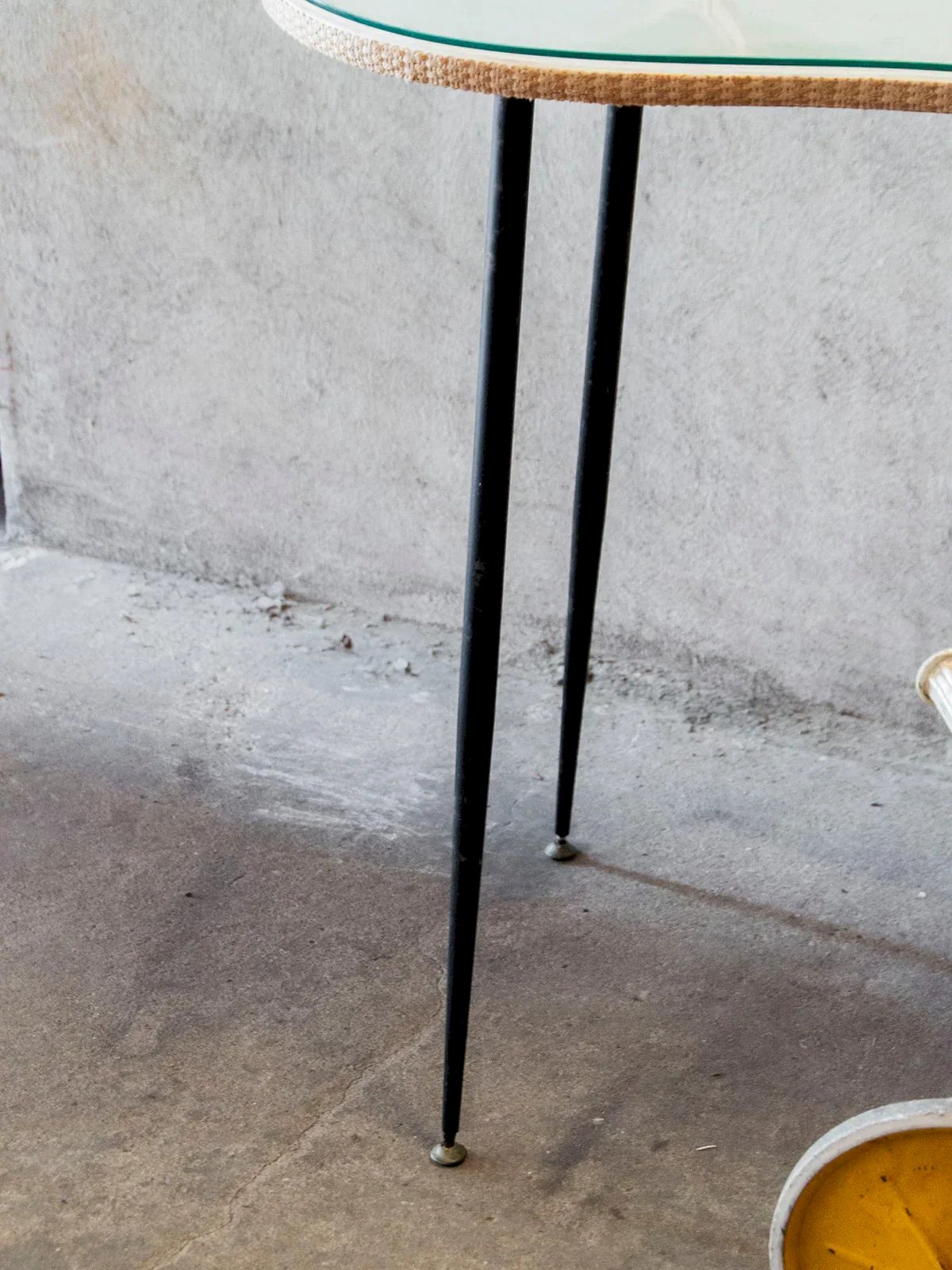 Add a touch of elegance to your interior with this high bean-shaped side table. Its thick glass top, paired with elegant cordage underneath, creates a striking contrast while providing practical functionality. The splayed metal legs ensure optimal stability while adding a contemporary note to your decor. Perfect as a side table in a living room or bedroom, it will charm with its refined design and practicality. Length: 96 cm Width: 53 cm Height: 78 cm Condition: Used: Item has been used. Item shows some superficial signs of wear, fully operational and functioning properly. It may be a display model or an item returned to the store after a short period of use. Possible imperfections. Brand: Debongout Type: Curated product Material: Glass, Metal Style: Contemporary Custom: Side tables.