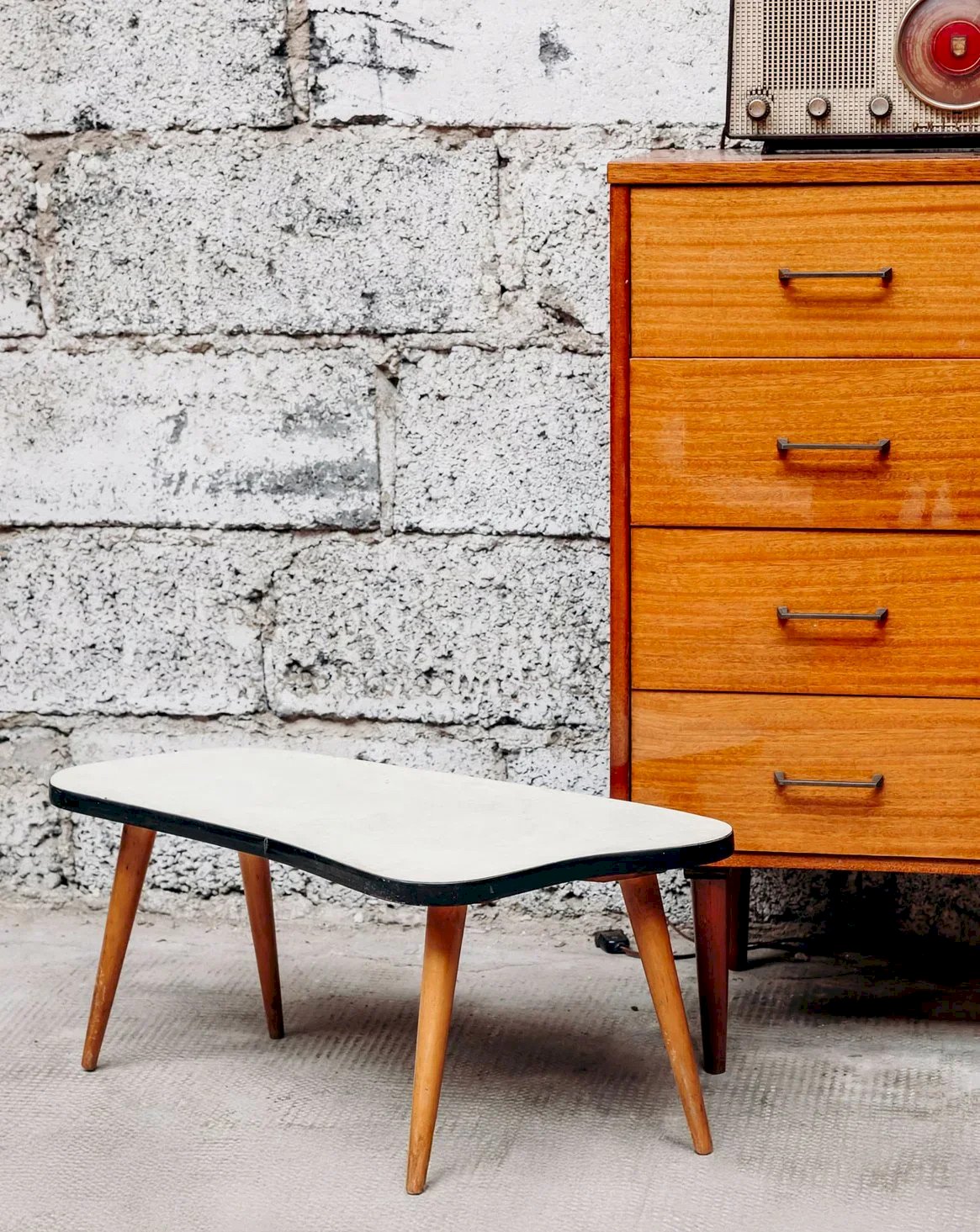 Add a touch of freshness to your interior with this small side table. Its bright top is framed by an elegant black outline, giving it character. The light wood legs add a Scandinavian note and ensure good stability. Ideal as an end table next to a sofa or a side table in a bedroom, it fits perfectly anywhere. A nice blend of simplicity and originality to enhance your decor. Length: 66 cm Height: 29 cm Depth: 32 cm Condition: Used: Item that has been used. Item shows some superficial signs of wear... Used: Item that has been used. Item shows some superficial signs of wear, fully operational and functioning correctly. It may be a demonstration model or an item returned to the store after a short period of use. possible imperfections. Brand: Debongout Type: Vintage product Material: Wood Custom: Side tables Style: Contemporary