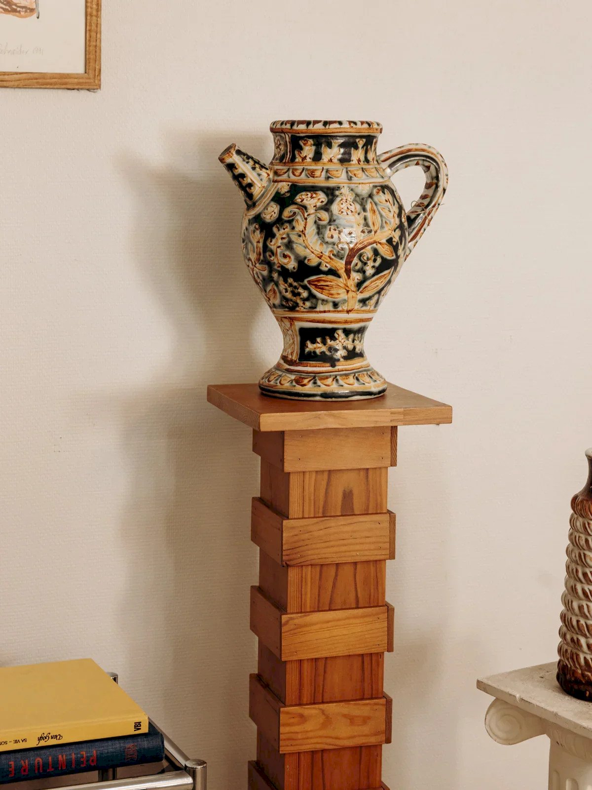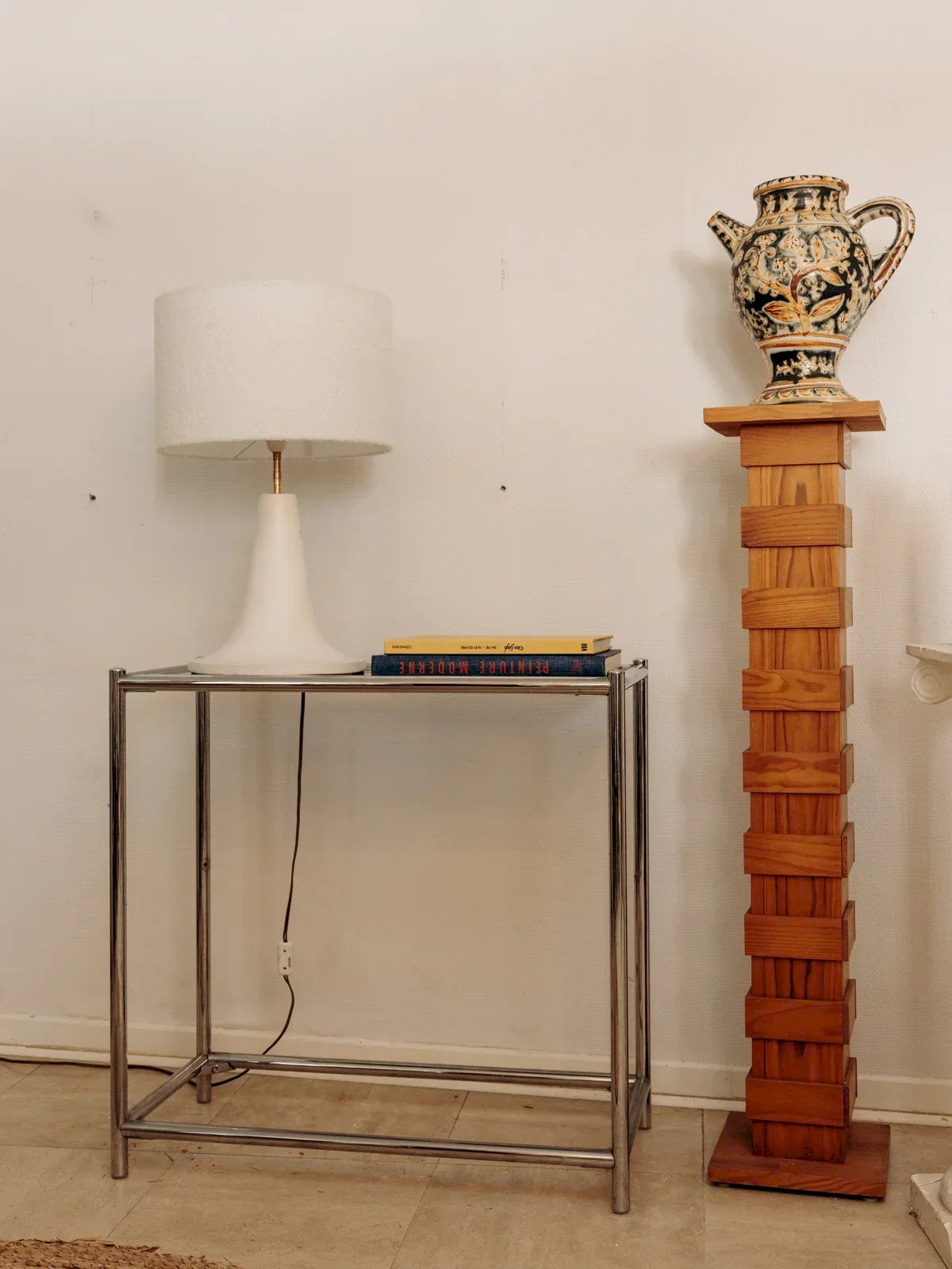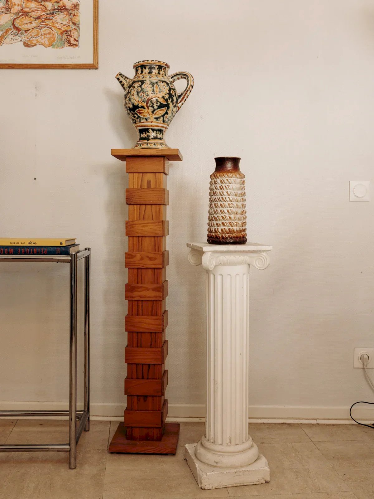 Add a retro touch to your interior with this solid wood plant stand column in vintage style. Its graphic design and stacked blocks create a captivating play of volumes, perfect for showcasing a plant, lamp, or sculpture. With its slender silhouette and beautiful wood patina, this decorative piece from the 70s fits perfectly with all styles. Also explore other models to play with heights and enhance your decor. Width: 25 cm Height: 114 cm Depth: 25 cm Condition: Used: Item that has been used. Item shows some signs of superficial wear, fully operational and functioning correctly. It may be a demonstration model or an item returned to the store after a short period of use. The potential imperfections. Brand: Debongout Type: Vintage product Material: Wood Style: Contemporary Customized: Side tables