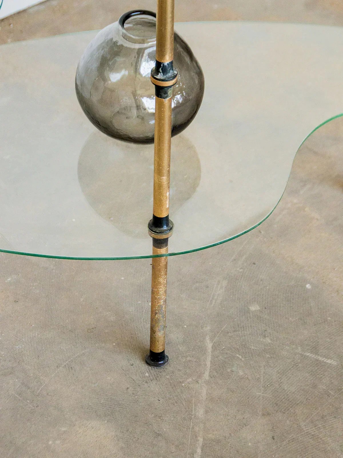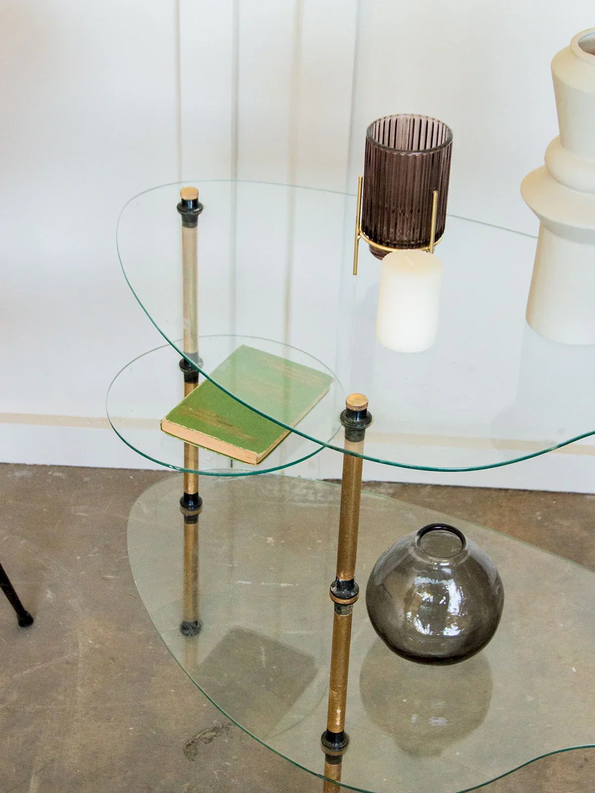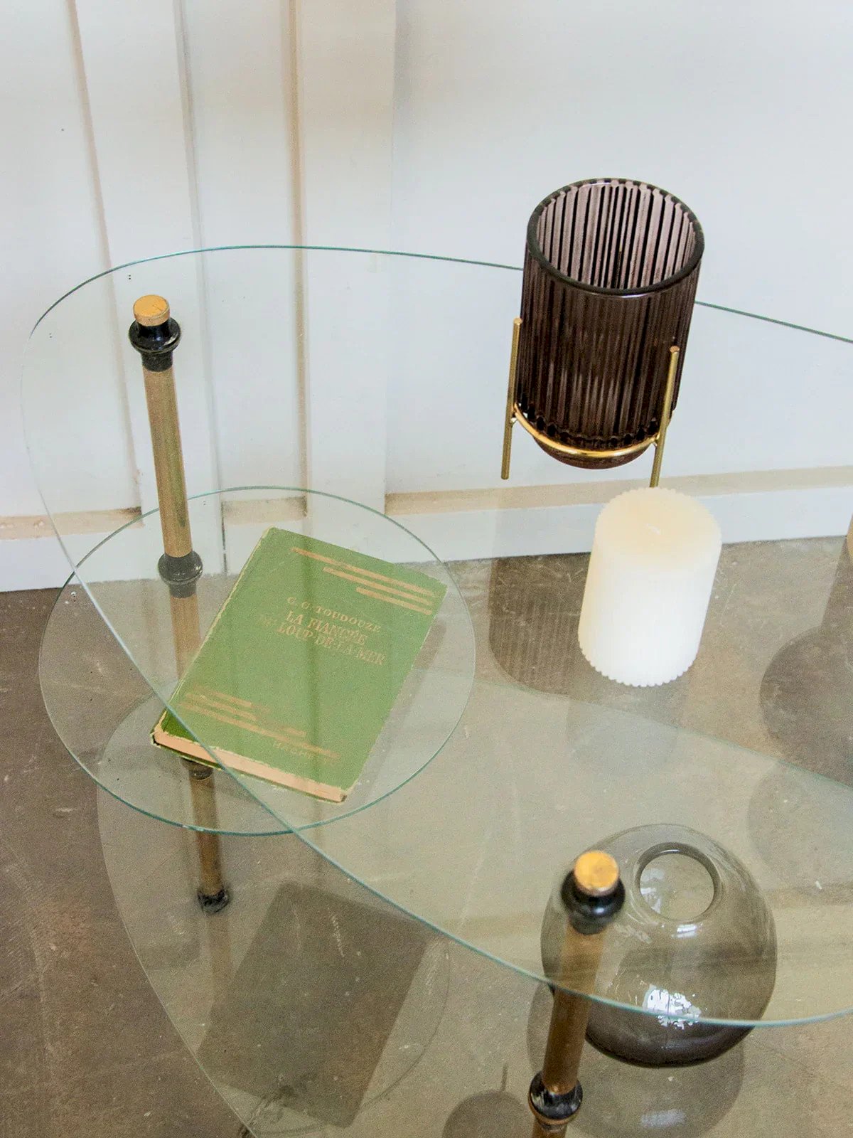 Discover this elegant side table, featuring two glass tops supported by fine golden metal legs. Its simple and refined lines make it a perfect piece for a chic or contemporary interior. A few subtle scratches on the glass indicate light usage without compromising its charm. It subtly captures light and adds a precious touch to the living room. A beautiful balance between lightness and elegance, all in finesse. Length: 81 cm Height: 65 cm Height between the two tops: 40.5 cm Depth: 45 cm Diameter of small top: 27 cm Condition: Used item. Item shows some superficial wear marks, fully operational and functioning correctly. It may be a display model or an item returned to the store after a short period of use, with any potential imperfections. Brand: Debongout Type: Curated product Material: Metal, Glass Style: Contemporary Customized: Side tables