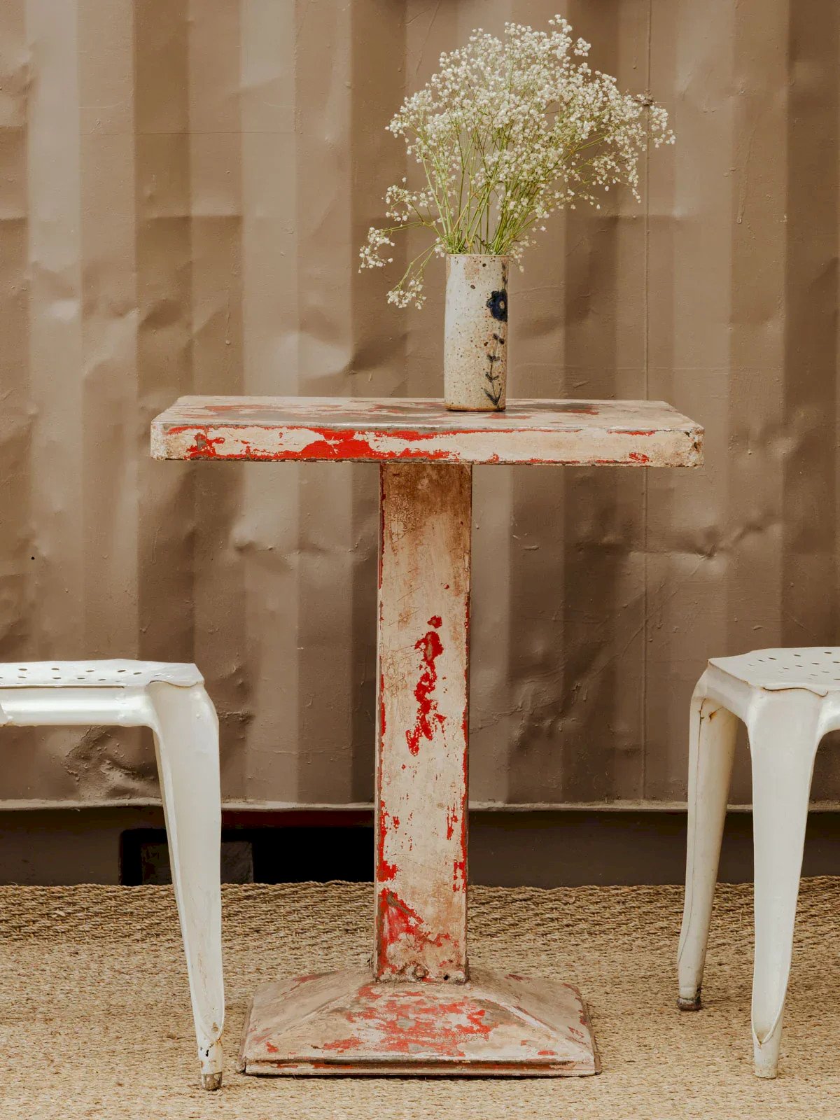 Discover this vintage Tolix table with a patina, exuding industrial charm warmed by a gradient of red and white. The painted steel structure is patinated, and the tabletop offers comfortable space for 2 to 4 guests, perfect for convivial meals or to liven up a coffee corner. Its clean lines and balanced proportions allow it to fit seamlessly into both contemporary interiors and more rustic atmospheres. The interplay of paint and patina adds character and authenticity. Slight traces of time contribute to its charm. Length: 60 cm Width: 60 cm Height: 75 cm Height under the tabletop: 70 cm Condition: Used: Item has been used. Item shows some superficial signs of wear, fully operational and working correctly. It may be a demonstration model or an item returned to the store after a short period of use. Any possible imperfections. Brand: Debongout Type: Thrifted product Material: Metal Style: Contemporary Customizable: Side tables