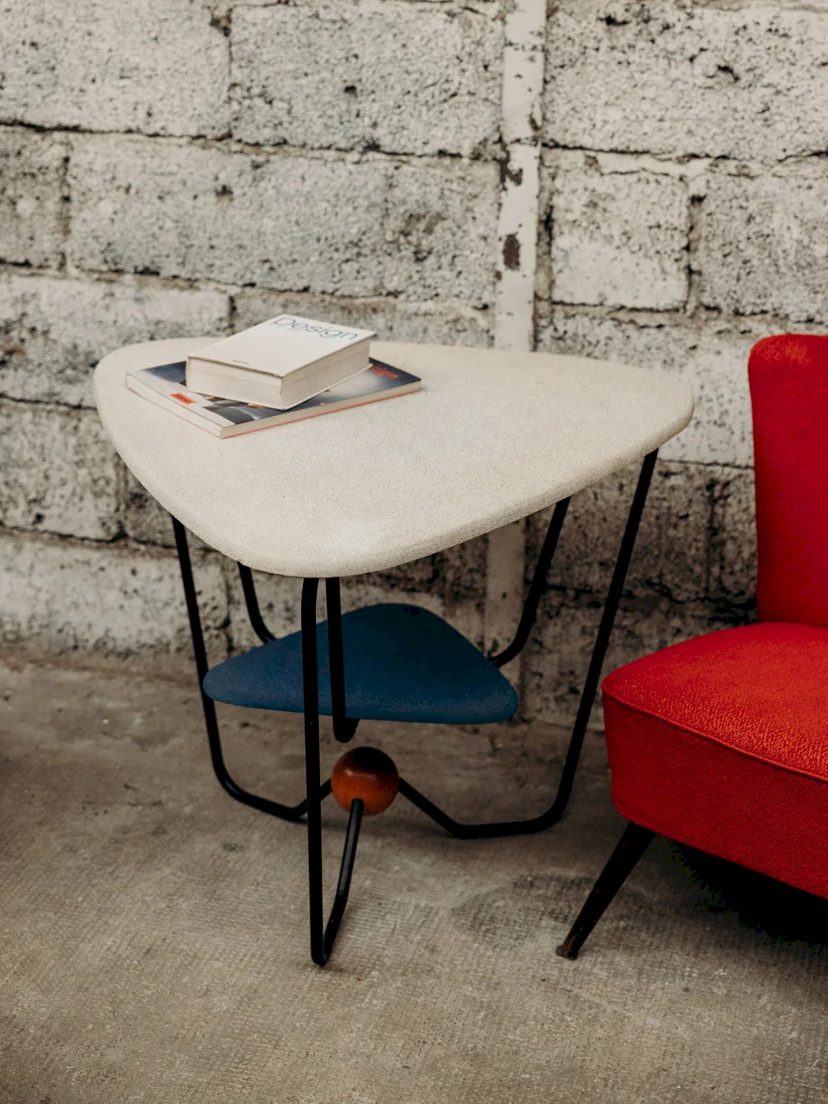 Discover this 1950s side table or coffee table, featuring a black tubular metal base that gives it a modern and sleek look. Its dual white and blue top adds a touch of freshness and dynamism to your interior. Ideal for complementing your vintage or contemporary decor, it combines functionality and aesthetics. This compact and elegant piece perfectly fits into all types of rooms. A practical and stylish object that is sure to catch the eye. Web exclusive, the meeting will take place at your home! Length: 78.5 cm Height: 85 cm Depth: 75.5 cm Condition: Used: Item has been used. Item shows some signs of superficial wear, fully operational and functioning correctly. It may be a demonstration model or an item returned to the store after a short period of use with possible imperfections. Brand: Debongout Type: Curated Product Material: Metal Style: Contemporary Customized: Side tables