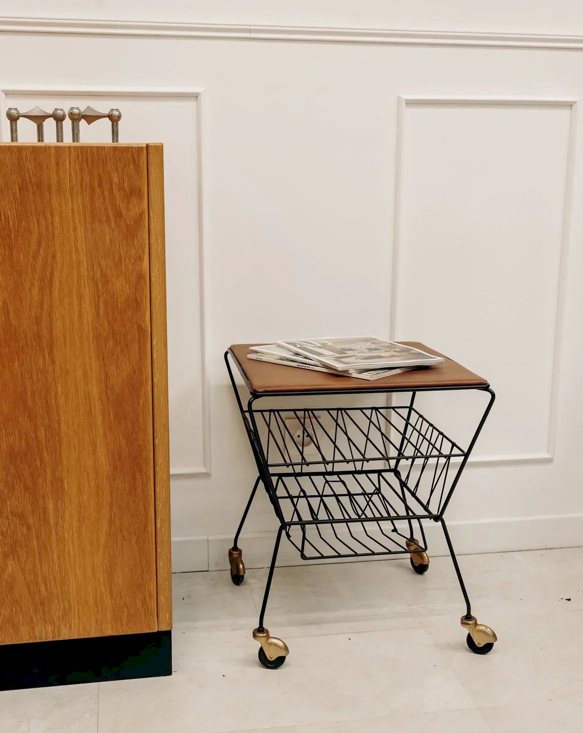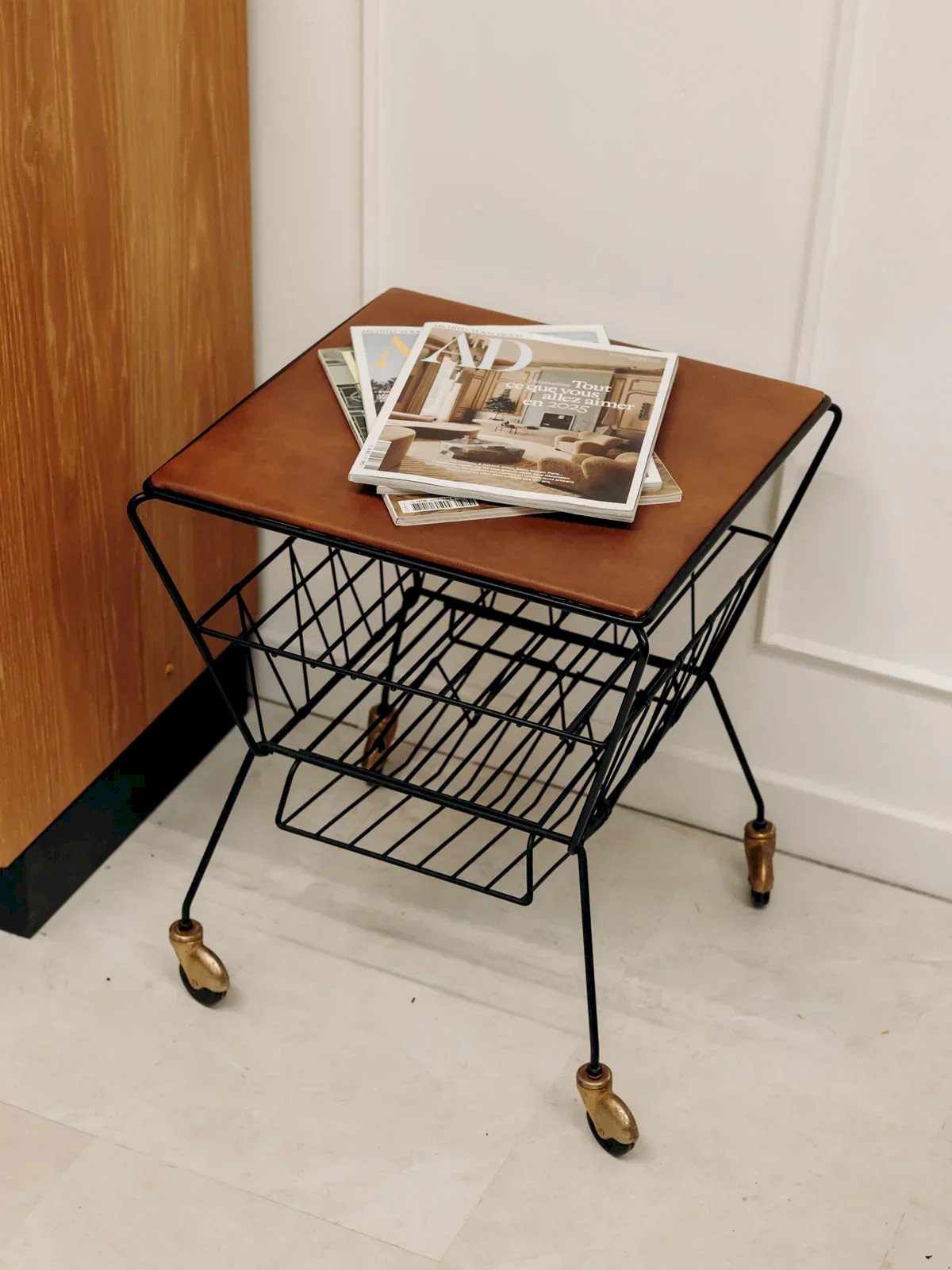Discover our vintage-style side table, perfect for retro design enthusiasts. This black metal wheeled table, a former record holder, combines functionality and elegance. Its faux leather top adds a touch of modernity while maintaining the charm of yesteryear's items. Ideal for bringing an original note to your interior while remaining practical, it adapts to all your needs. Length: 42 cm Width: 42 cm Height: 51 cm Condition: Used: Item has been utilized. Item shows some signs of superficial wear... Used: Item has been utilized. Item shows some signs of superficial wear, fully operational and functioning correctly. It may be a demonstration model or a product returned to the store after a short period of use. Any imperfections. Brand: Debongout Type: Thrifted product Material: Metal, Faux leather Custom: Side tables Style: Contemporary
