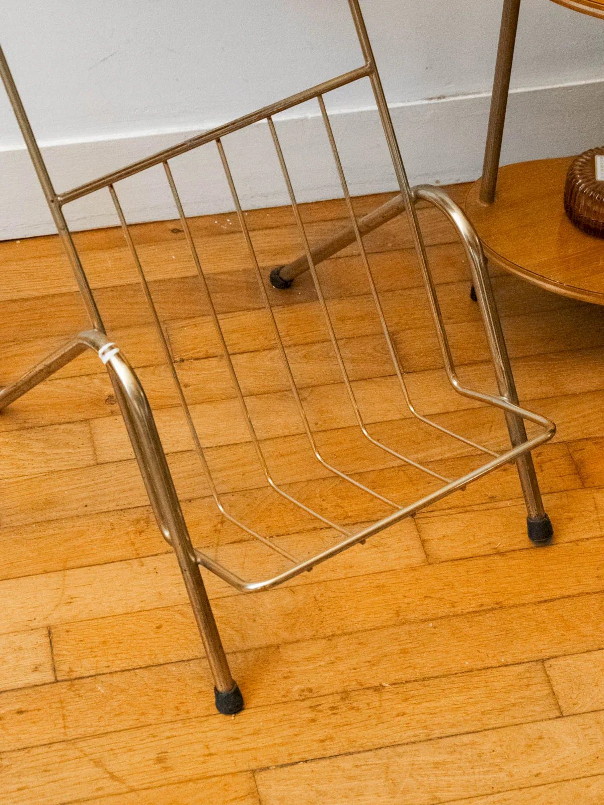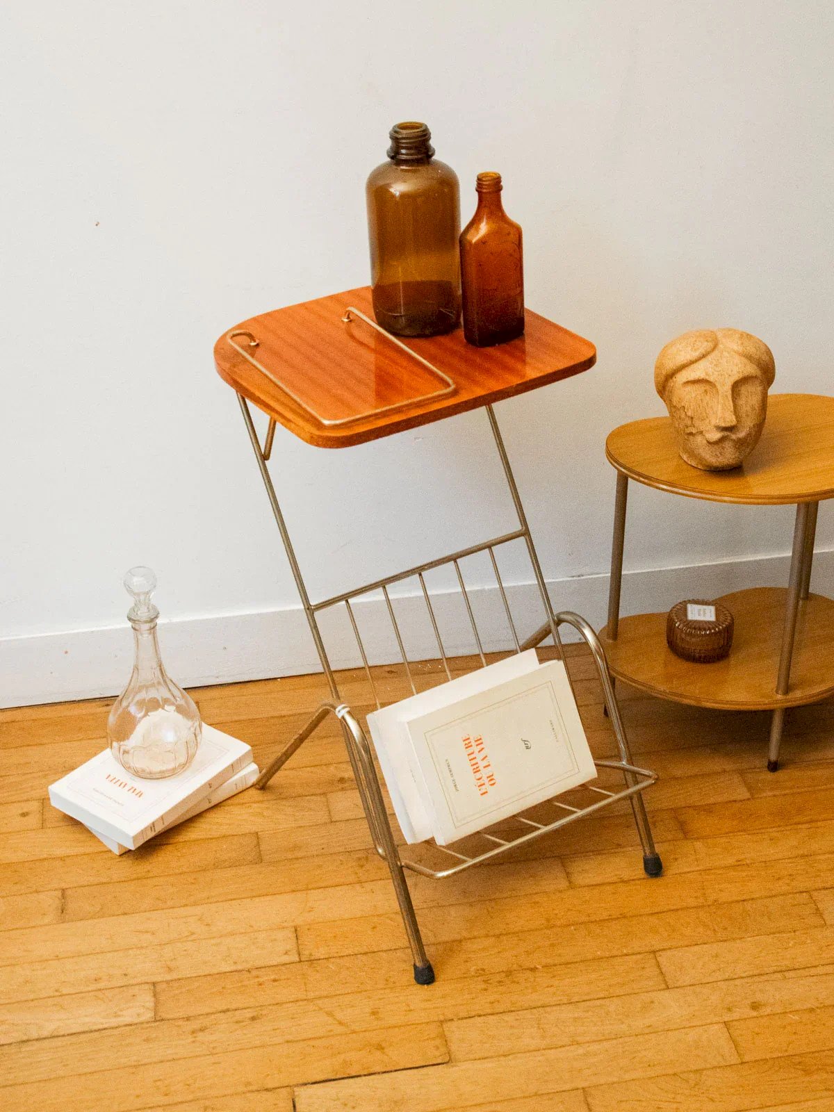 Add a touch of elegance with this high side table, designed to hold documents and magazines. Its golden metal structure, with fine lines, plays on elongated proportions, making it ideal next to an armchair or in a narrow entryway. The top tray and lower shelf provide accessible and orderly storage, without cluttering the space. Its sober and bright appearance creates a warm and contemporary atmosphere. Length: 32 cm Width: 40 cm Height: 60 cm Condition: Used: Item that has been used. Item showing some superficial signs of wear, ...Used: Item that has been used. Item showing some superficial signs of wear, fully operational and functioning correctly. It may be a demonstration model or an item returned to the store after a short period of use. any possible imperfections. Brand: Debongout Type: Vintage product Material: Metal, Formica Style: Contemporary Custom: Side tables