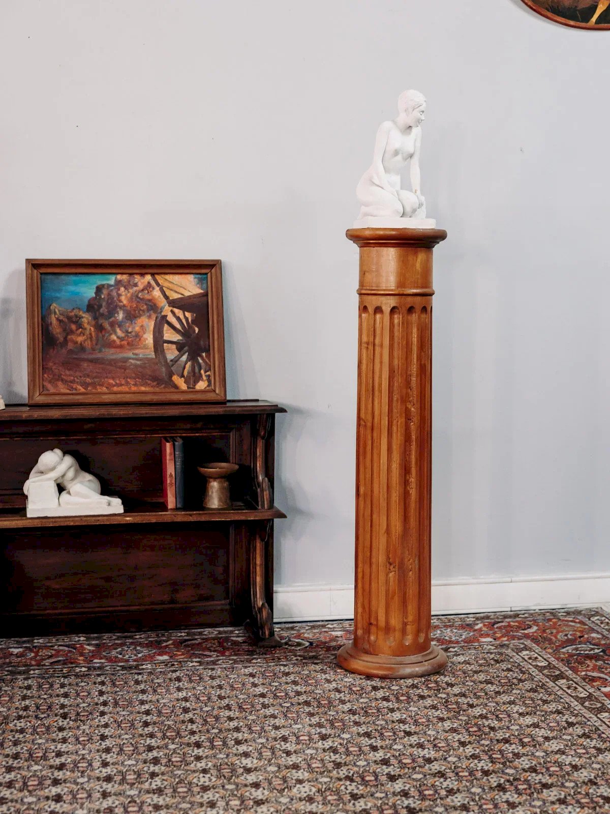 Discover this slender orange wood column, resting on a round base and crowned with a circular top, perfect for showcasing a plant, sculpture, or lamp. Its warm hue and natural finish add a cozy and contemporary touch to any interior, while its tall proportions create a discreet yet present visual support. The monogram D M engraved near the top adds a refined and artisanal detail. Height: 110 cm Base diameter: 29 cm Condition: Used item. Item shows some signs of superficial wear, fully operational and functioning correctly. It may be a demonstration model or a product returned to the store after a short period of use. Possible imperfections. Brand: Debongout Type: Curated product Material: Wood Style: Contemporary Custom: Side tables