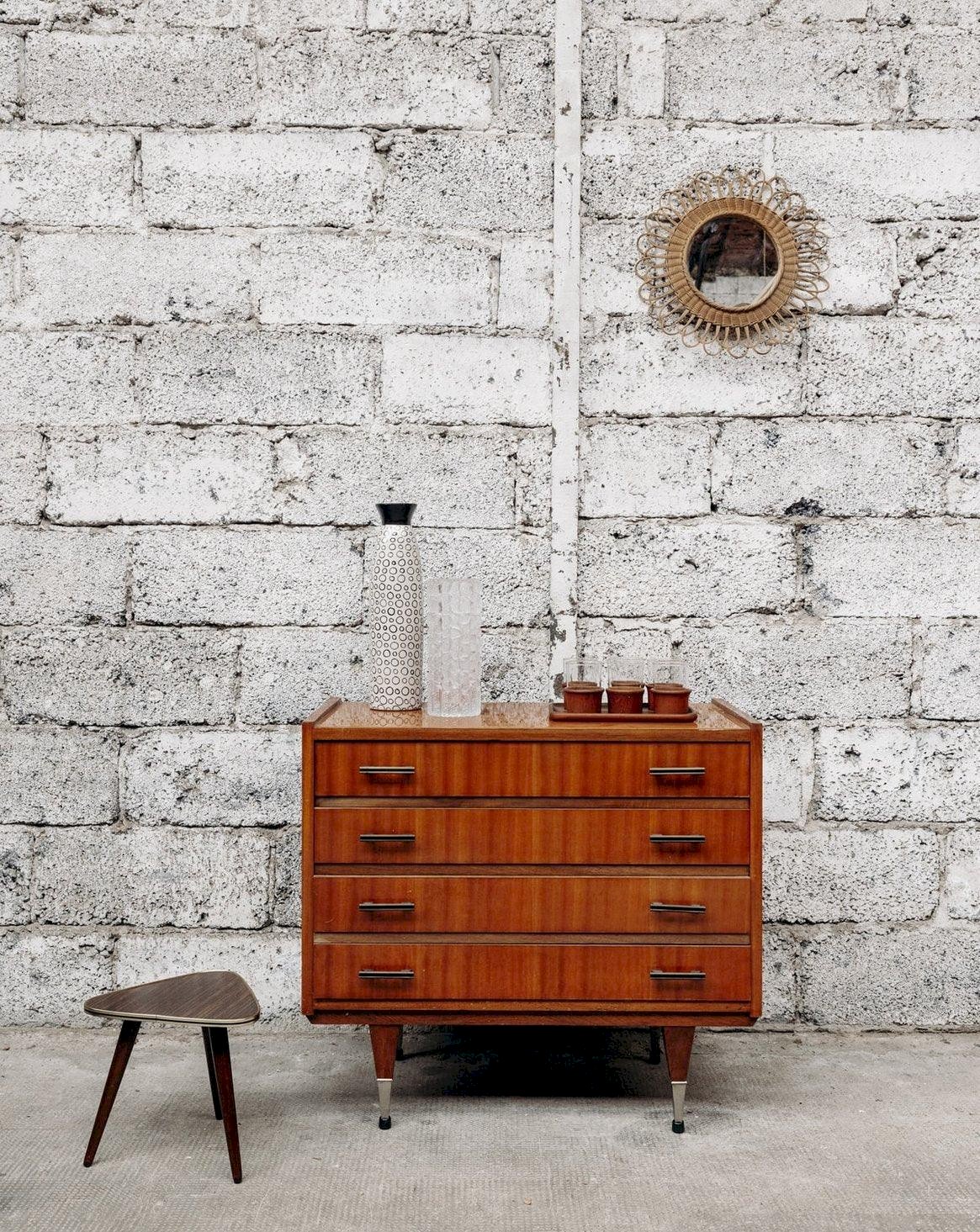 This small tripod side table in dark formica combines lightness and elegance. Its minimalist design with three slender legs adds a modern and sleek touch to your interior. Perfect for adding a note of refinement while being functional, it easily integrates into any room as a side table or decorative support. Web exclusive, the meeting will take place at your home! Length: 24 cm Width: 24 cm Height: 26 cm Condition: Second-hand: Item has been used. Item shows some signs of superficial wear... Second-hand: Item has been used. Item shows some signs of superficial wear, fully operational and functioning correctly. It may be a demonstration model or an item returned to the store after a short period of use. Any possible imperfections. Brand: Debongout Type: Curated Product Material: Wood Customized: Side tables Style: Contemporary