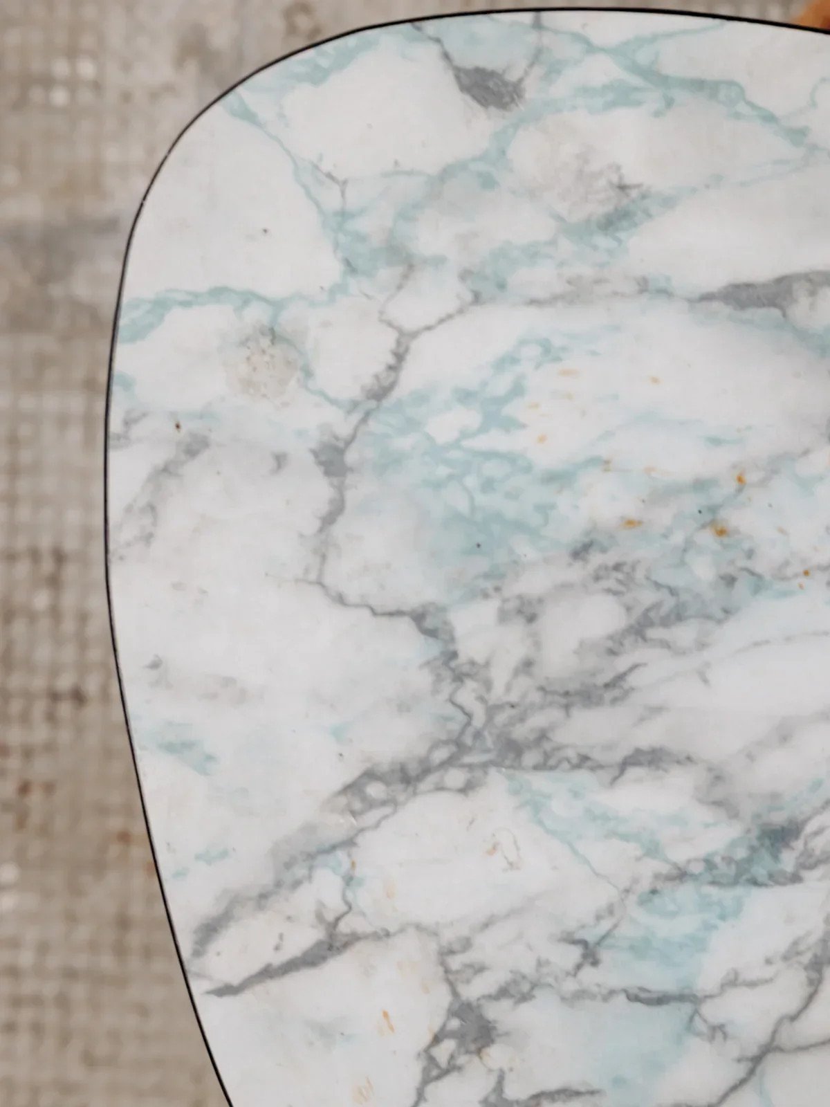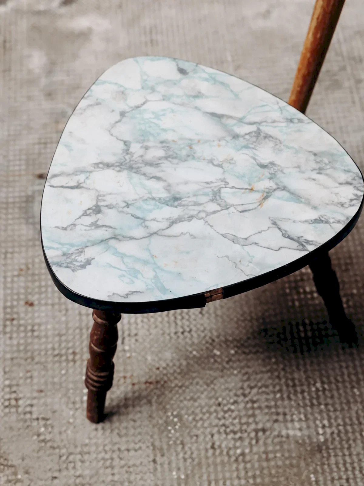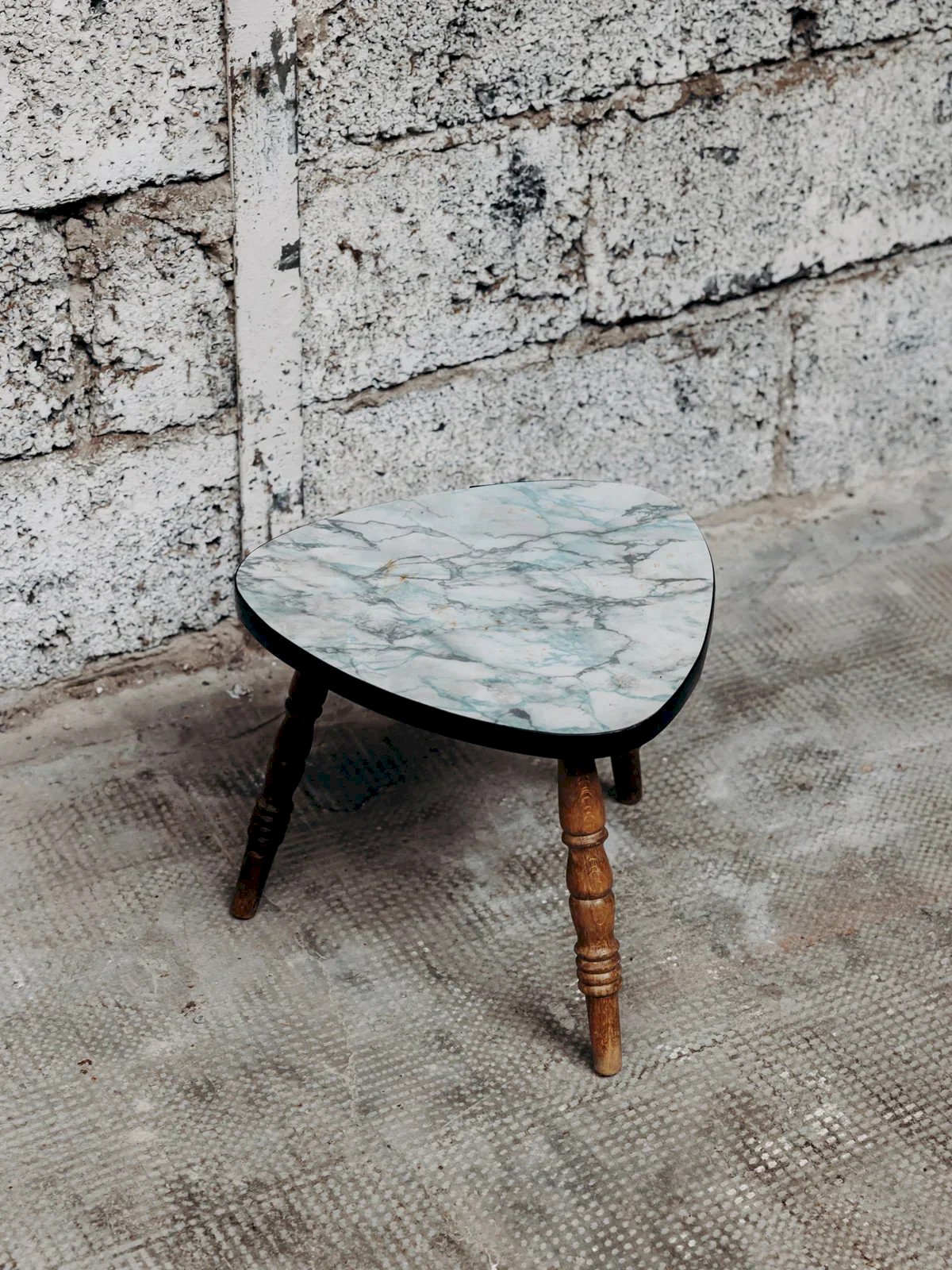 Bring a retro touch to your interior with this small triangular side table featuring a unique look. Its blue faux marble top catches the eye with its deep and elegant shades. The three wooden legs provide great stability and a distinct vintage charm. The black edge highlights its original shape, although a small piece is missing, which does not detract from its appearance. Perfect as a side table or accent table, it combines style and practicality in a compact format. Height: 29 cm Diameter: 36 cm Condition: Used: Item has been used. Item shows some superficial signs of wear... Used: Item has been used. Item shows some superficial signs of wear, fully operational and functioning correctly. It may be a demonstration model or an item returned to the store after a short period of use. Possible imperfections. Brand: Debongout Type: Thrifted product Material: Wood, Formica Customized: Side tables Style: Contemporary.