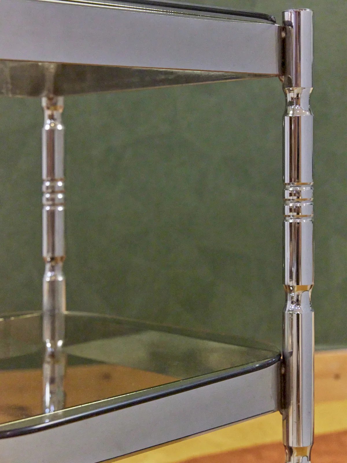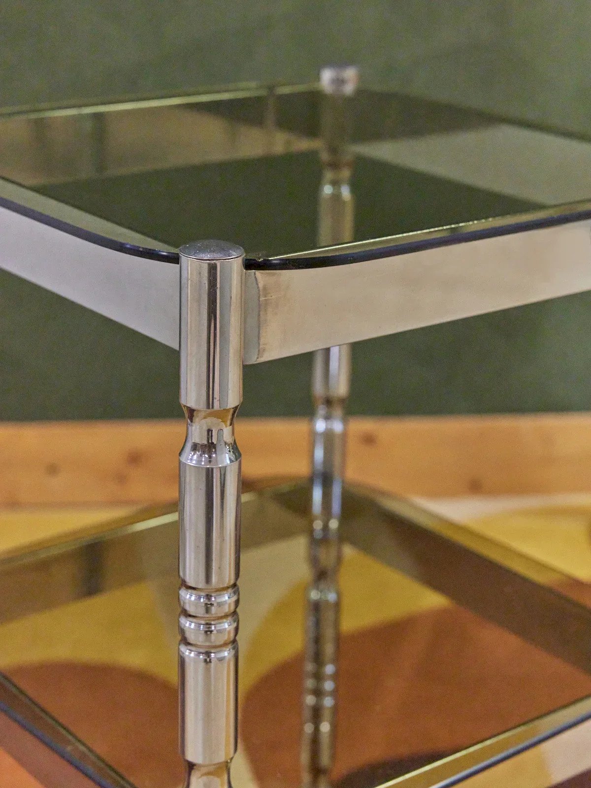 Add a contemporary and light touch to your living room with this side table featuring a smoked glass top and chrome structure. The translucent surface plays with light while the chrome finish highlights clean and elegant lines, perfect for a modern or minimalist interior. Designed for the end of a sofa, it accommodates lamps, magazines, and small objects without weighing down the space. Its discreet presence creates a refined and soothing atmosphere. Length: 35 cm Width: 35 cm Height: 58 cm Condition: Used: Item that has been used. Item showing some superficial signs of wear, ...Used: Item that has been used. Item showing some superficial signs of wear, fully operational and functioning correctly. It may be a demonstration model or an item returned to the store after a short period of use, with possible imperfections. Brand: Debongout Type: Curated product Material: Glass, Chrome Style: Contemporary Customizable: Side tables