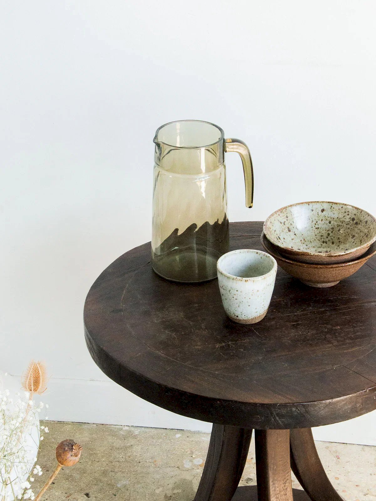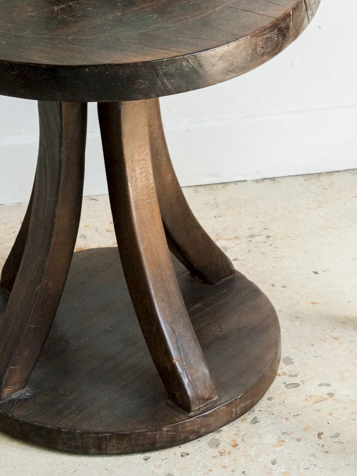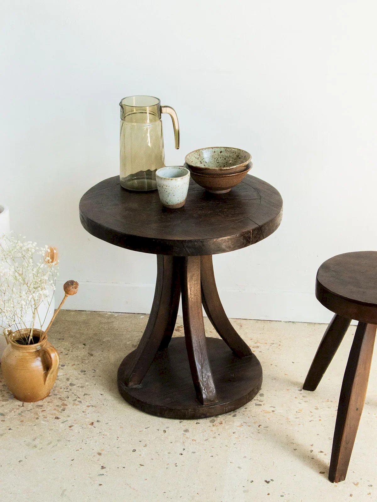 Discover this charming vintage circular side table made of teak, featuring authentic Indonesian style. Its elegant curved legs converge on a round base, bringing balance and character. This second-hand furniture from Asia tells a beautiful story. The traces of time give it a charming patina without compromising its solidity. A stable and unique piece to enrich your interior tastefully. Height: 50 cm Diameter: 50 cm Condition: Used: Item has been used. Item shows some superficial signs of wear... Used: Item has been used. Item shows some superficial signs of wear, fully operational and functioning correctly. It may be a demonstration model or a product returned to the store after a short period of use. any possible imperfections. Brand: Debongout Type: Thrifted product Material: Teak, Wood Style: Contemporary Custom: Side tables