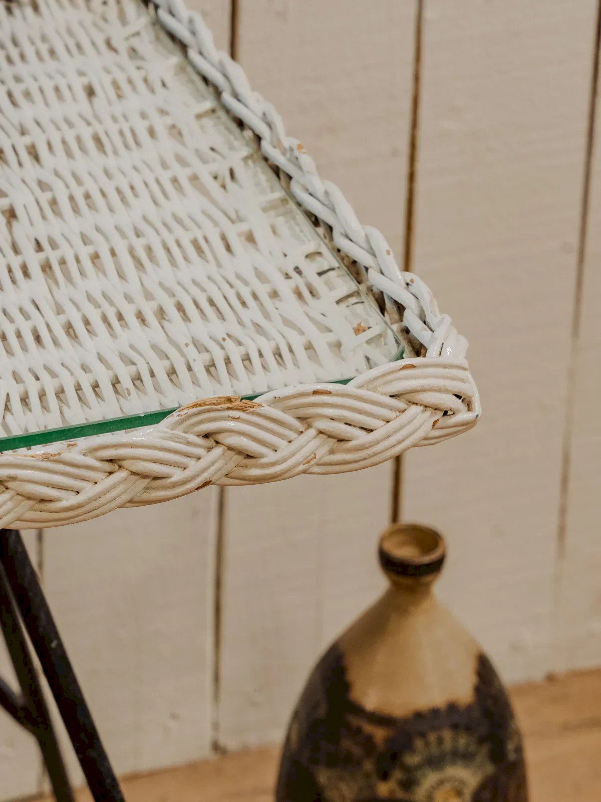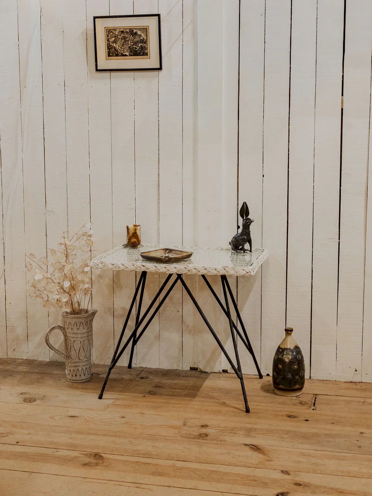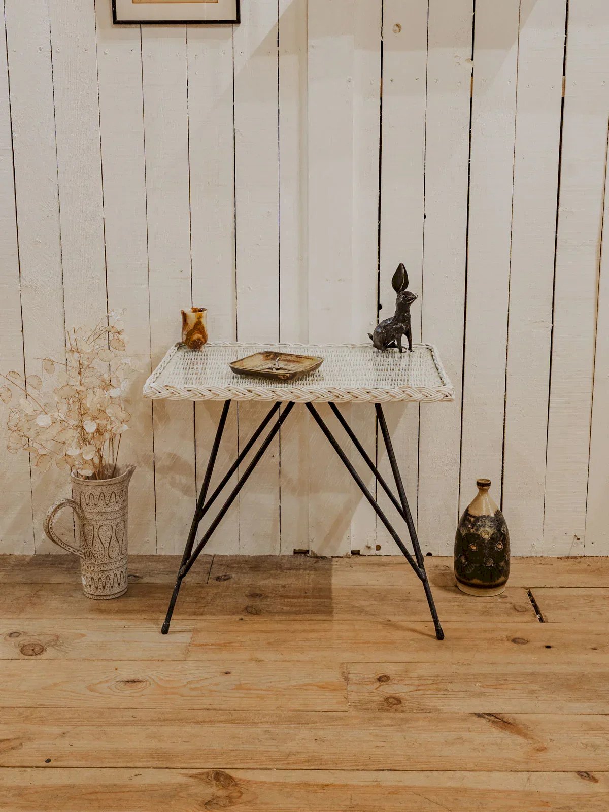 Bring this accent table to the white rattan tray topped with a glass pane and resting on black metal legs, which combines natural warmth and contemporary lines. Its proportions make it ideal for a lounge corner, a bedroom, or an entryway, offering a lightweight surface for a lamp and books without cluttering the space. The material/metal contrast creates a sober and welcoming ambiance, perfect for a boho-chic interior. Some signs of wear are present. Length: 62 cm Width: 43 cm Height: 55 cm Condition: Used: Item that has been used. Item showing some superficial signs of wear, ...Used: Item that has been used. Item showing some superficial signs of wear, fully operational and functioning correctly. It may be a display model or a product returned to the store after a short period of use. potential imperfections. Brand: Debongout Type: Thrifted Product Material: Rattan, Glass, Metal Style: Contemporary Custom: Accent Tables