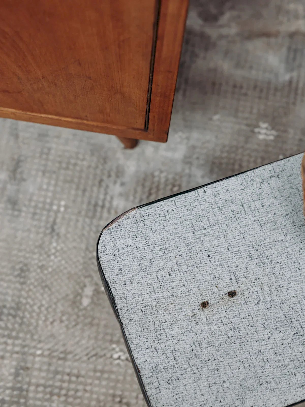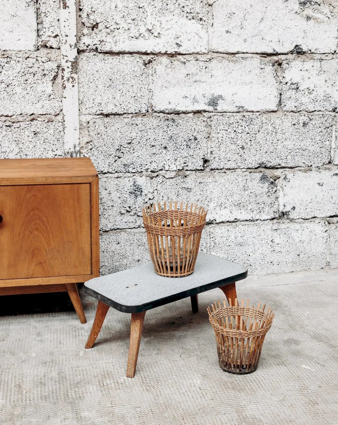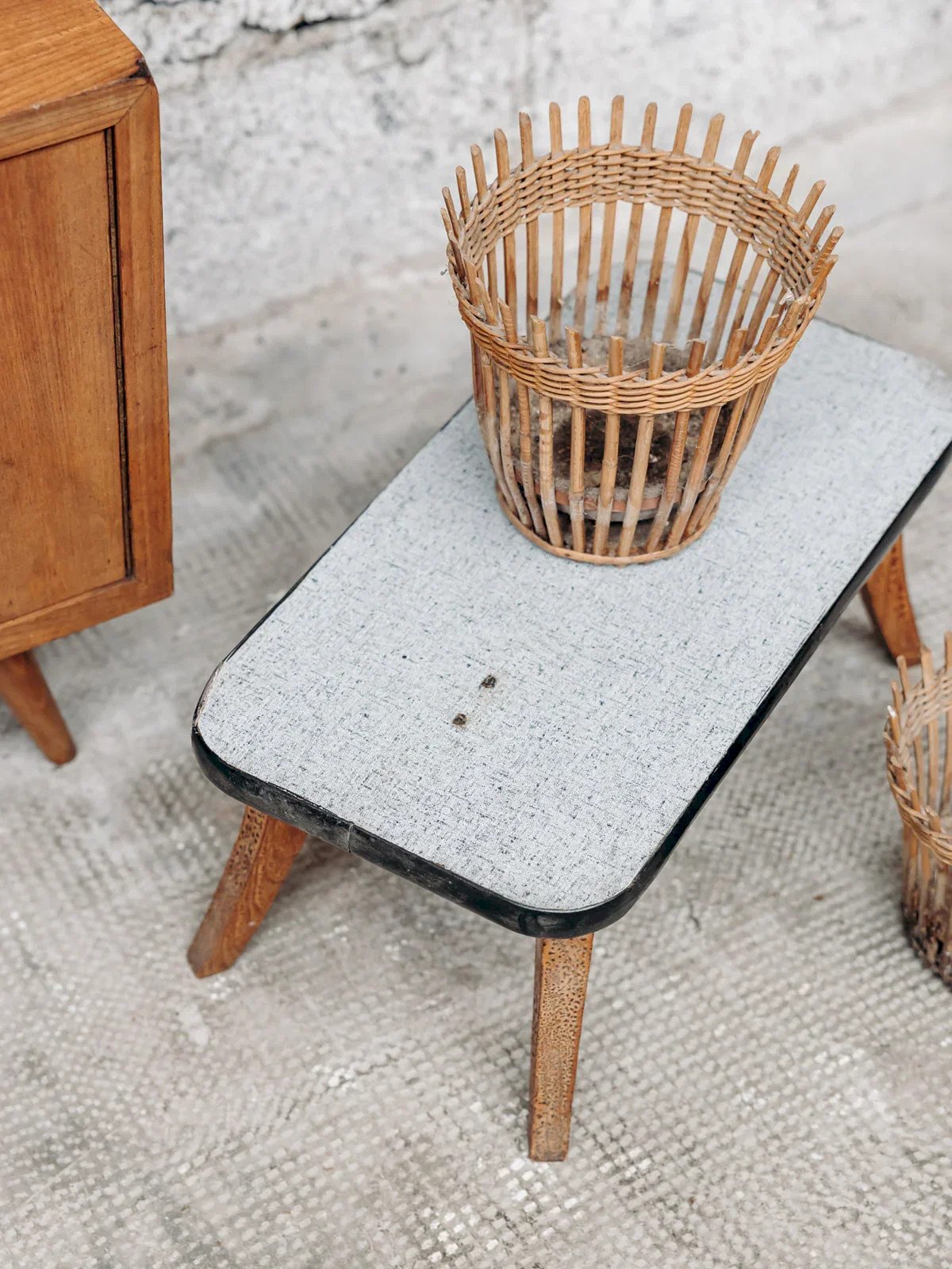 Discover this small gray side table with a modern and elegant design. Its spaced wooden legs add a Scandinavian touch to the whole, while the black outline highlights its minimalist style. Ideal for completing your living room, bedroom, or office, it can adapt to various types of interiors. Compact and functional, it provides extra space for your everyday items. A practical and aesthetic piece of furniture to bring a contemporary note to your decor. Length: 50 cm Height: 22 cm Depth: 26 cm Condition: Used: Item that has been used. Item showing some signs of superficial wear, fully operational and functioning properly. It may be a demonstration model or an item returned to the store after a short period of use. Any possible imperfections. Brand: Debongout Type: Vintage product Material: Wood Customized: Side tables Style: Contemporary