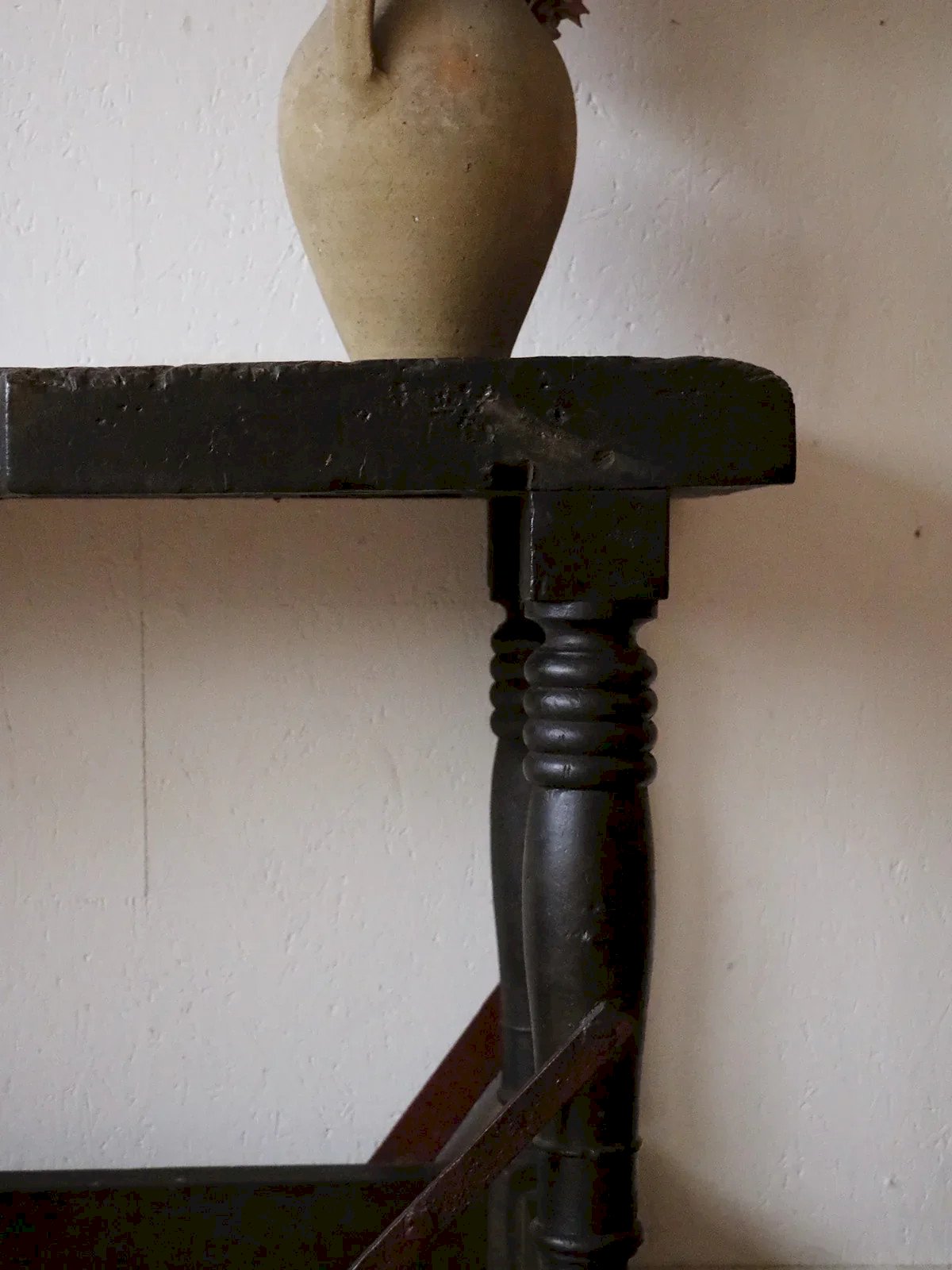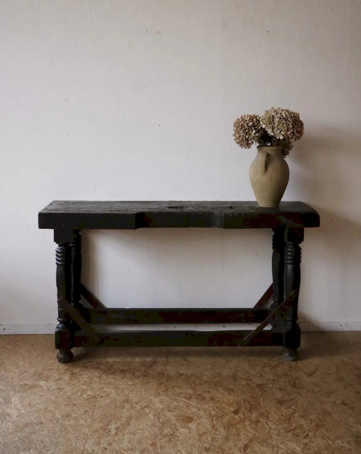 Discover this antique jeweler's workbench transformed into a console, crafted from solid wood painted black and resting on elegantly turned legs. Its long silhouette and generous depth provide a stable surface to display objects, lamps, or to serve during an aperitif, ideal in an entryway or behind a sofa for a warm atmosphere and workshop spirit. Original patina and drips present. Length: 132 cm Width: 43 cm Height: 73 cm Condition: Used: Item has been used. Item shows some superficial signs of wear, ...Used: Item has been used. Item shows some superficial signs of wear, fully operational and functioning correctly. It may be a demonstration model or an item returned to the store after a short period of use. Any imperfections. Brand: Debongout Type: Curated product Material: Wood Style: Contemporary Customizable: Side tables