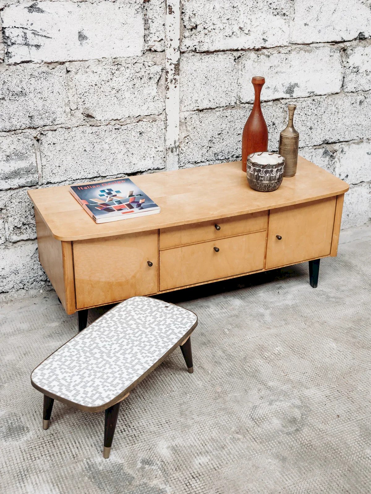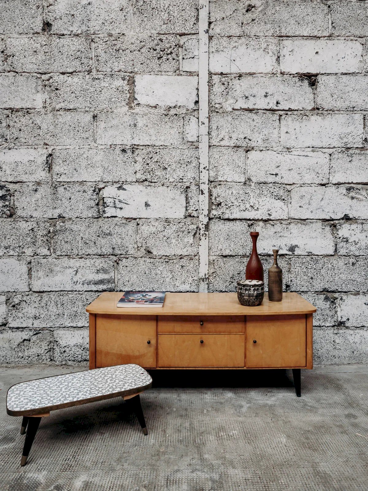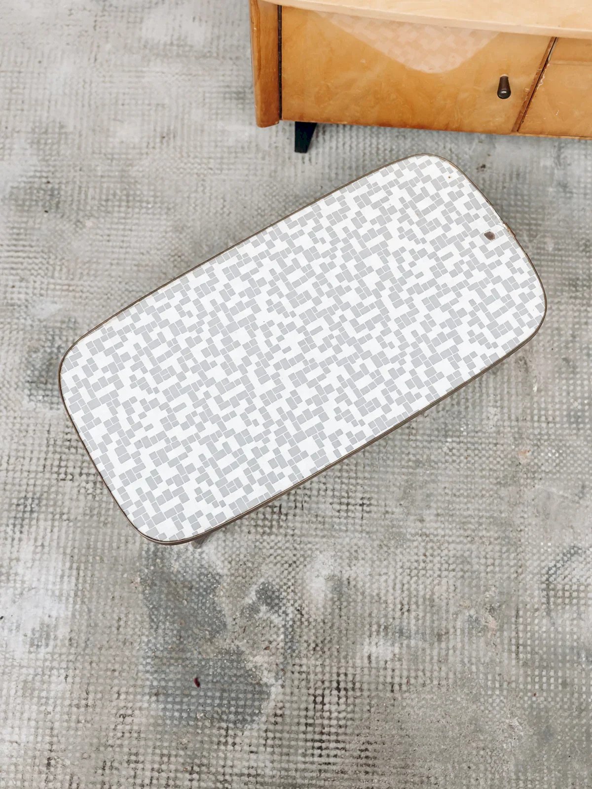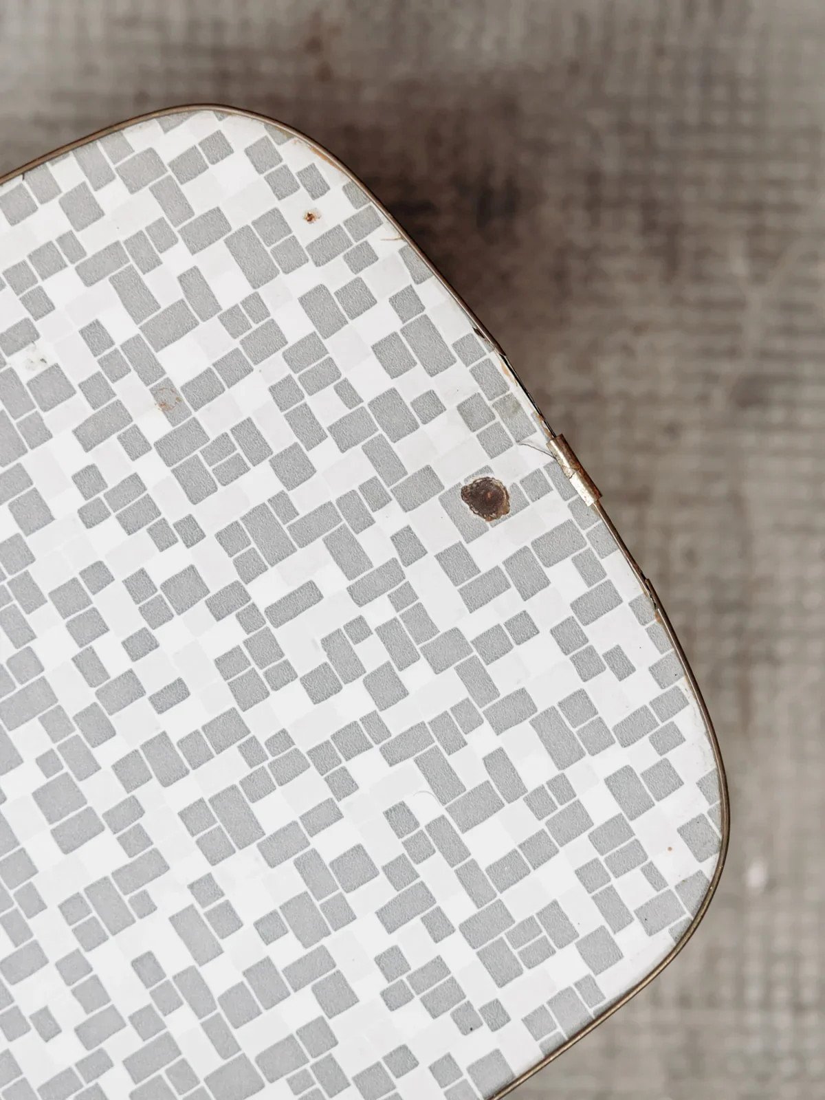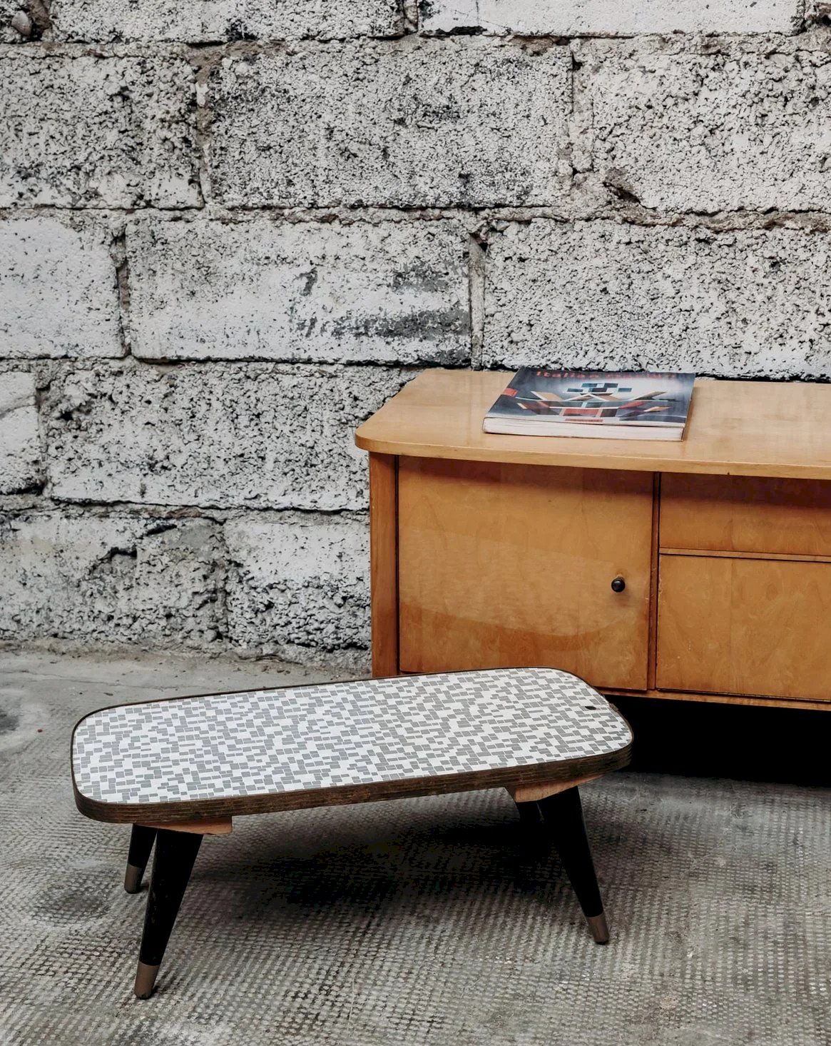 Discover this small side table with a unique charm, perfect for enhancing your interior. Its top is adorned with gray and white tiles, adding an elegant touch. The metallic effect outline emphasizes its industrial and modern style. Compact and practical, it easily finds its place in a living room, an entrance, or a bedroom. Ideal for placing a lamp, a few books, or your favorite objects. Length: 56 cm Height: 20 cm Depth: 28 cm Condition: Used: Item has been used. Item shows some signs of superficial wear... Used: Item has been used. Item shows some signs of superficial wear, fully operational, and functioning correctly. It may be a demonstration model or an item returned to the store after a short period of use, with any possible imperfections. Brand: Debongout Type: Thrifted Product Material: Wood Customized: Side tables Style: Contemporary