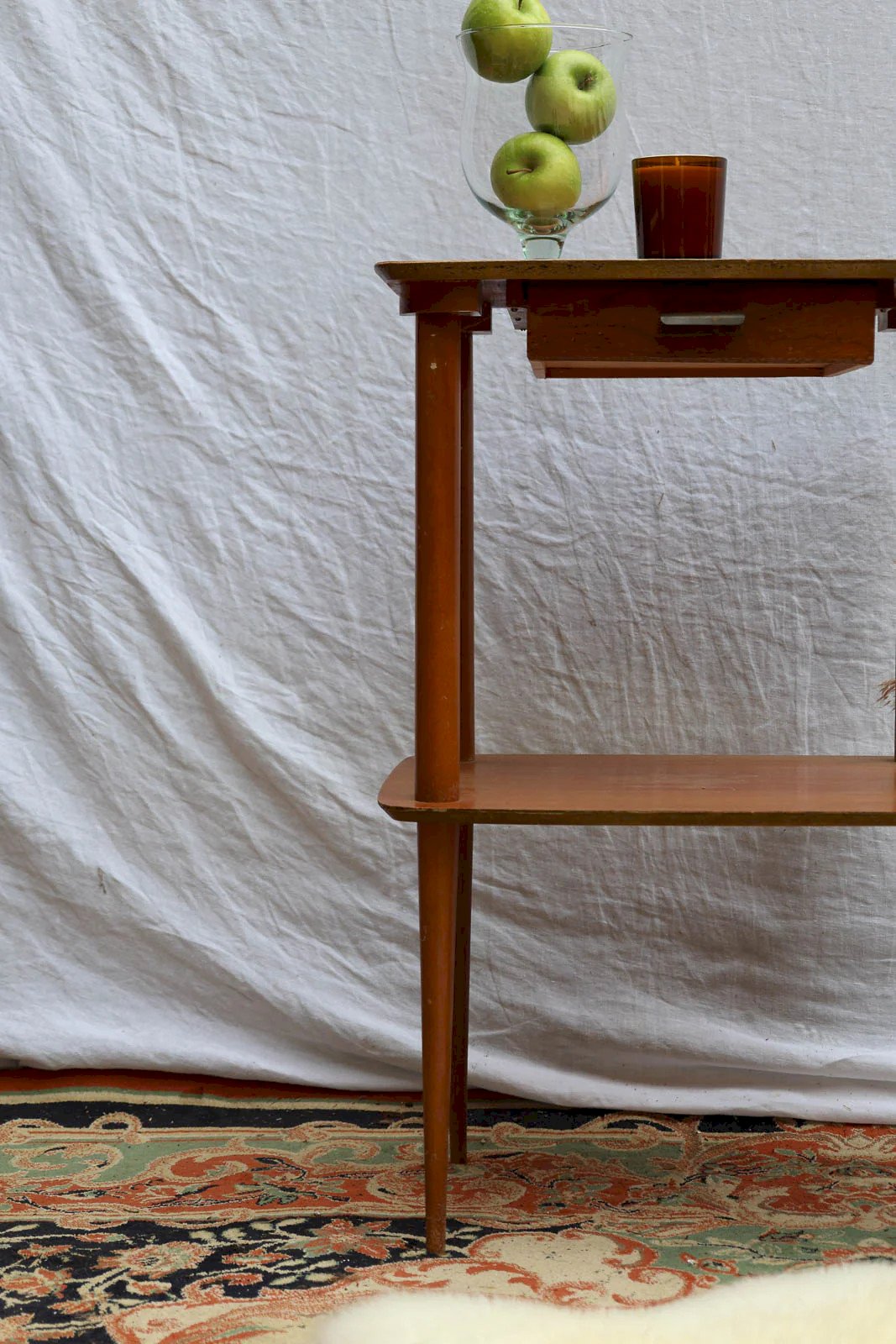 Embrace this vintage console with a Scandinavian style, understated and bright, that adds a touch of natural elegance to an entryway or narrow hallway. Its light wood structure and shallow drawer with metal handles offer discreet storage for keys and small items, while the lower shelf accommodates baskets or magazines. Its size and clean lines make it easy to integrate into small spaces, creating a warm and functional ambiance. Wear is present on the surfaces. Length: 49 cm Width: 40 cm Height: 77 cm Drawer height: 6 cm Drawer length: 26 cm Shelf height: 36 cm Condition: Used: Item that has been used. Item showing some signs of superficial wear, entirely operational and functioning correctly. It may be a display model or an item returned to the store after a short period of use. Any imperfections. Brand: Debongout Type: Thrifted product Material: Wood, Metal Style: Contemporary Customized: Side tables