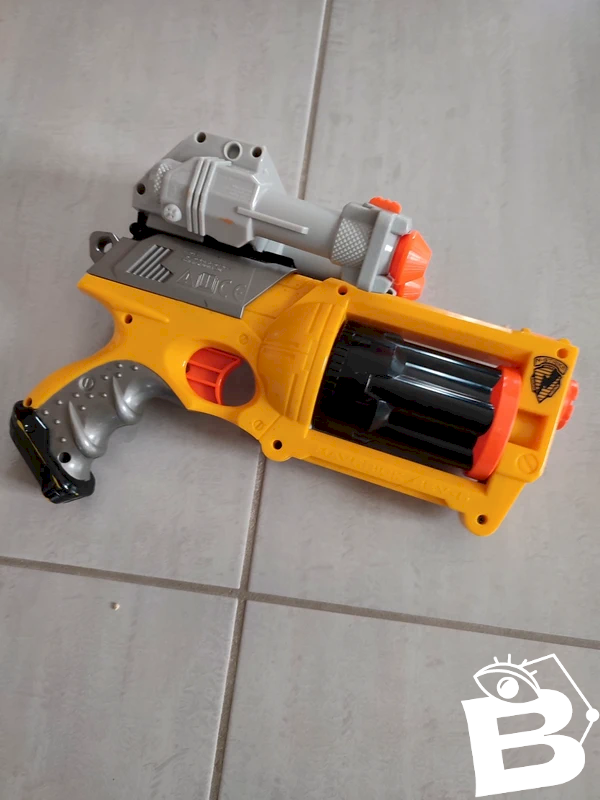 Hasbro Nerf N-Strike gun in good condition. Works well, just a few signs of use and wear on the gun. Comes with 6 darts.