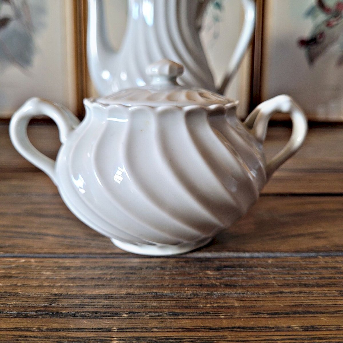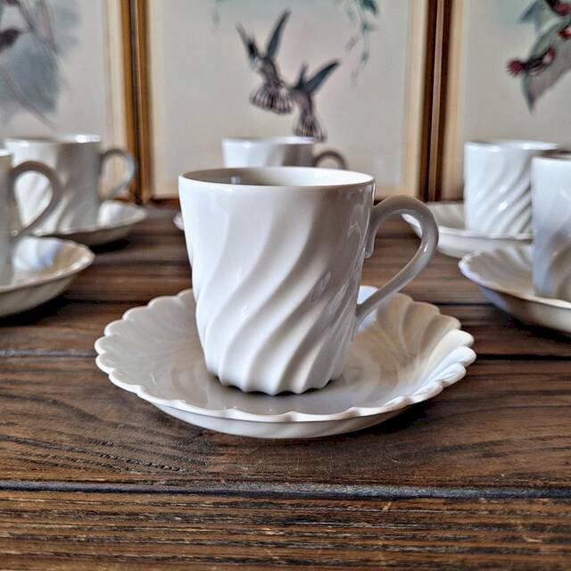 Haviland coffee set, Torse model in white porcelain. This fine and delicately translucent porcelain captures light with a rare softness, revealing a pure, almost luminous white. The twisted shape, subtle and harmonious, adds relief and timeless elegance to each cup. Comprising 12 small espresso/café cups with their saucers, a coffee pot, a sugar bowl, and a milk jug, this set offers a perfect balance between table art and user pleasure. It is suitable for both grand occasions and daily rituals, for simple visual and tactile enjoyment. Overall in very good condition, with slight traces of wear on some saucers, and one small chip on the edge of a saucer. Dimensions: cups: diameter 5.3 cm (without handles) x height 5.9 cm; saucers: diameter 11 cm.