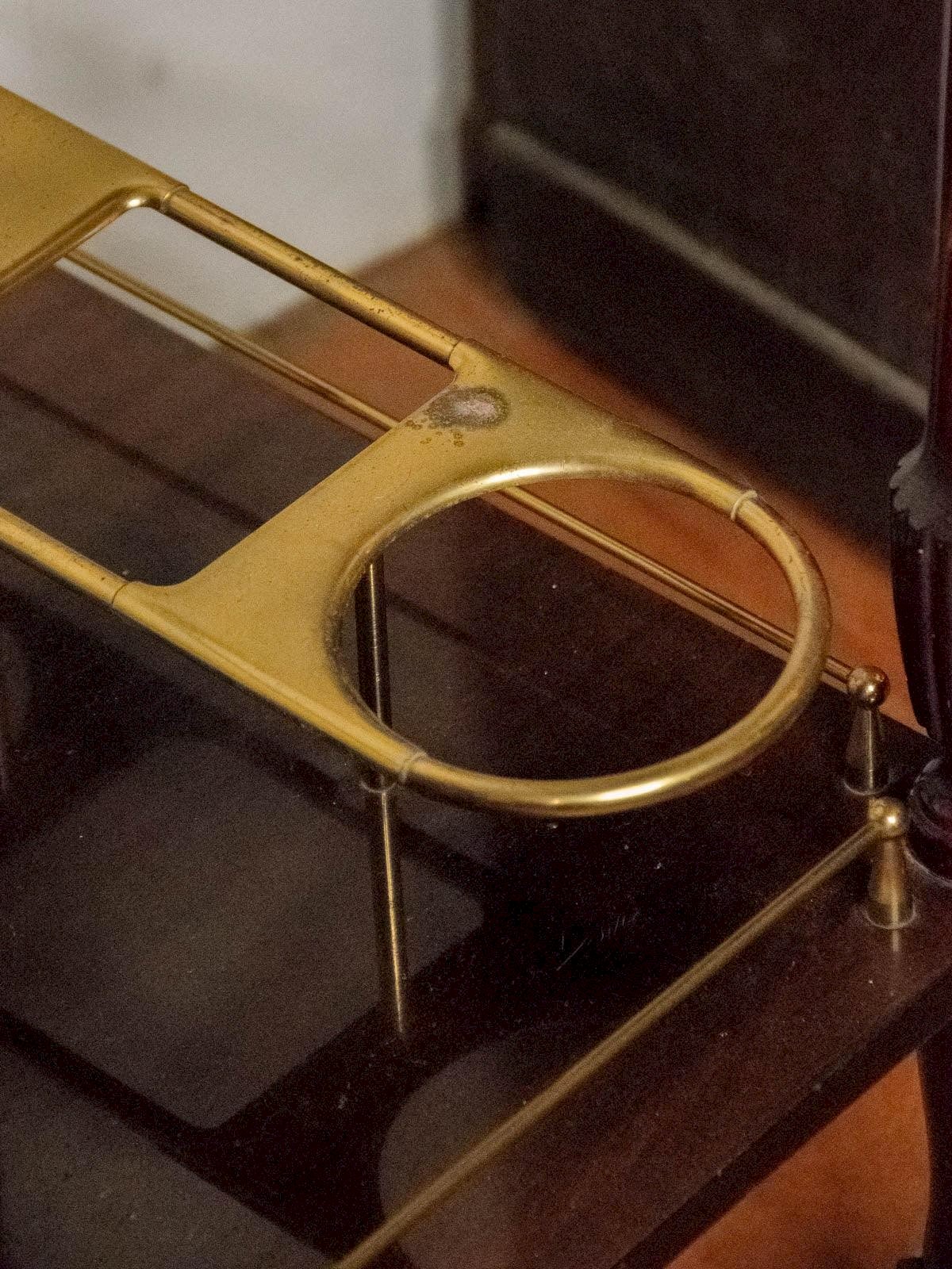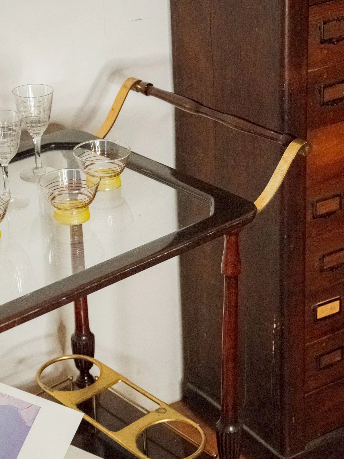 Elevate your interior with this 1950s Italian serving cart made of dark wood, brass, and glass, mounted on wheels for mobile and elegant service. The upper glass shelf showcases decanters and glassware, while the lower shelf features an integrated brass bottle holder designed to organize your bottles with simplicity. Its compact proportions offer generous storage without cluttering the space, and the patinated wood finish adds a subtle warmth. Ideal for aperitifs or an improvised bar corner. Length: 86 cm Width: 44 cm Height: 71 cm Height of lower shelf: 23 cm Height of upper shelf: 71 cm Length of shelves: 74 cm Width of shelves: 44 cm A brief history of the serving cart The serving cart, also known as a service table, originated in the 17th century. At that time, it was used to serve and clear dishes and tableware during meals. Equipped with wheels, it easily moves from one place to another, allowing for quicker table clearing by reducing the number of trips between the dining room and the kitchen. Its great utility has made the serving cart an important piece of furniture, also serving tea or breakfast. This small mobile side table has secured a special place in our homes over the centuries. Condition: Used: Item that has been used. Item showing some superficial signs of wear, fully operational and functioning correctly. It may be a demonstration model or an item returned to the store after a short period of use. potential imperfections. Brand: Debongout Type: Vintage product Material: Wood, Brass, Glass Style: Country Customizable: Serving carts