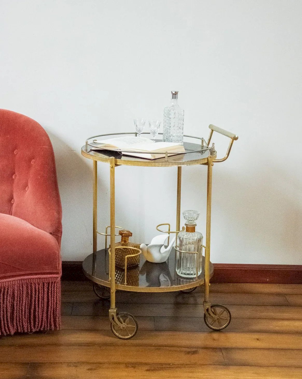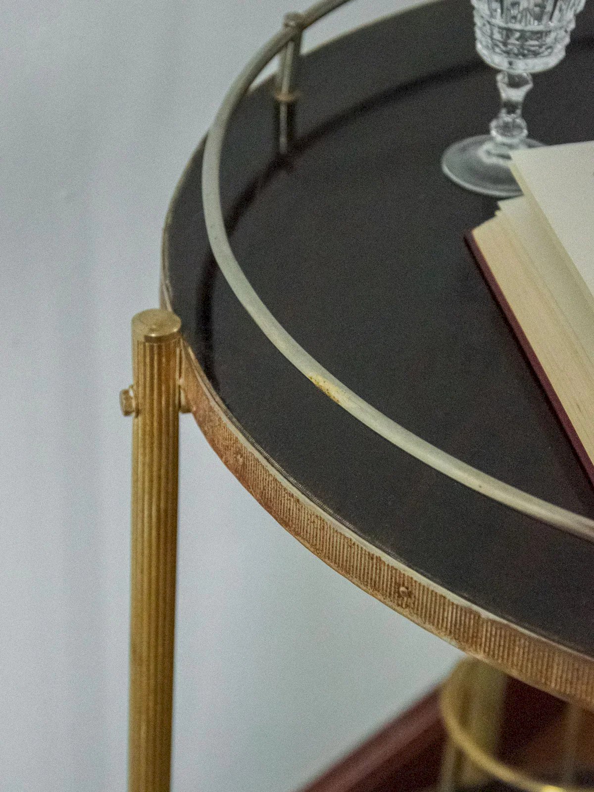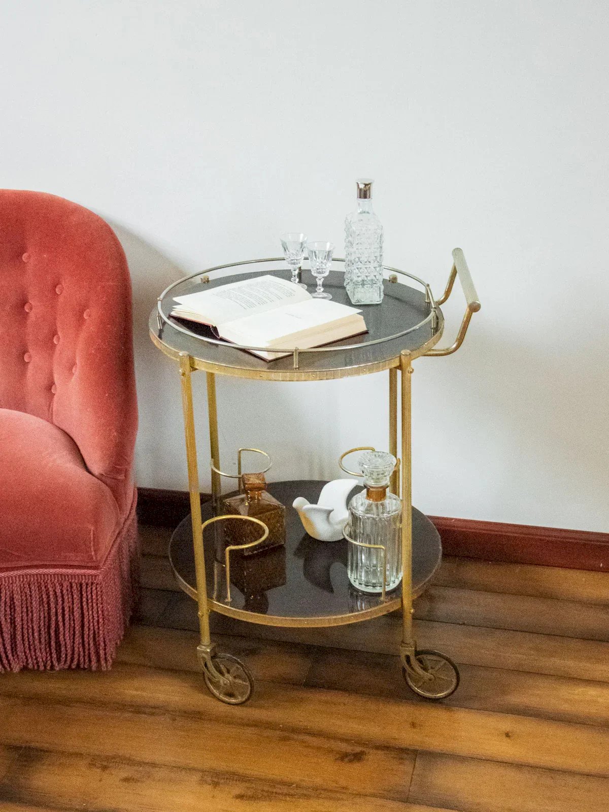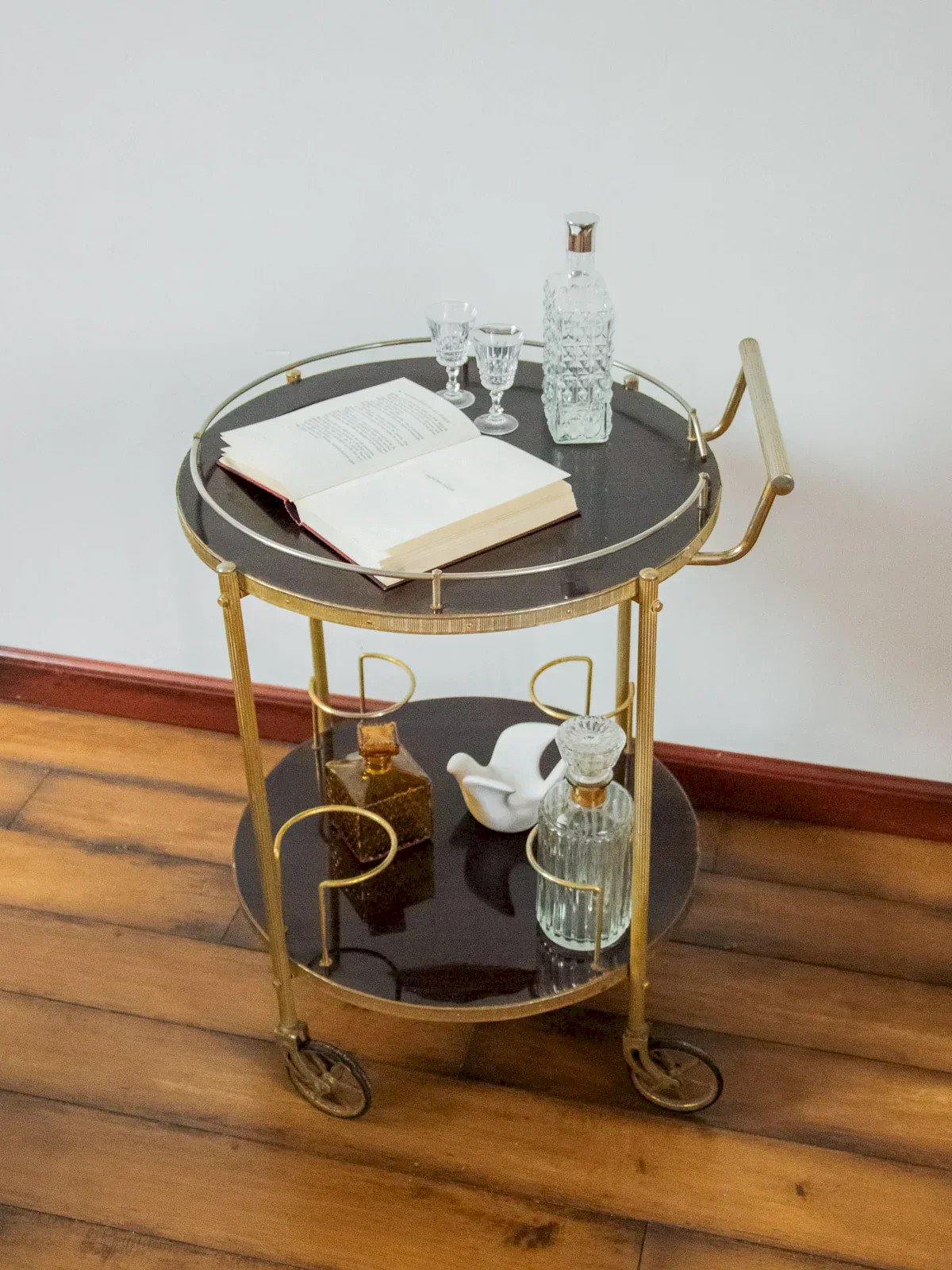 Invite this bar-style serving trolley on wheels, featuring two round Formica trays that bring a retro and elegant touch. The top tray, adorned with a golden metal support, showcases carafes and accessories, while the bottom tray includes four holders designed to store bottles and keep essentials within reach. Mobile and versatile, it creates a friendly atmosphere for aperitifs or lounge service. Width: 57 cm Height: 73 cm Diameter: 50 cm Niche height: 43 cm Bottle holder diameter: 10.5 cm Wheel height: 18 cm A brief history of the serving trolley The serving trolley, also known as a serving table, was born in the 17th century. At that time, it was used to serve and clear dishes and tableware during meals. Equipped with wheels, it can be effortlessly moved from one place to another, allowing for quicker table clearing by reducing the number of trips between the dining room and the kitchen. It is its great usefulness that has made the serving trolley an important piece of furniture, also serving tea or breakfast. This small mobile side table has managed to find a prominent place in our homes over the centuries. Condition: Used: Item has been used. Item shows some signs of superficial wear... Used: Item has been used. Item shows some signs of superficial wear, fully operational and functioning correctly. It may be a demonstration model or an item returned to the store after a short period of use. Potential imperfections. Brand: Debongout Type: Vintage product Material: Formica, Metal Style: Country Customizable: Serving trolleys