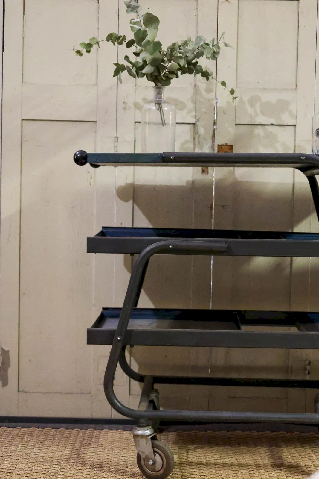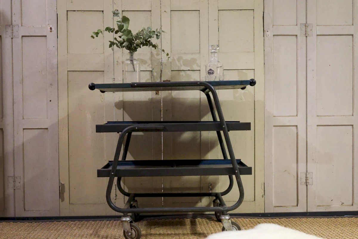 Invite this metal workshop cart on wheels, where the structure engages with patinated blue trays exuding discreet charm. Its three removable trays, which open on either side, offer modular storage and perfect accessibility for the kitchen, workshop, or living room. Mobile and stable, it easily slides to serve as an extra counter or serving cart. Its patina tells a story of use and adds a warm industrial touch. Length: 81 cm Width: 43 cm Height: 83 cm A brief history of the cart The cart, also known as a serving table, emerged in the 17th century. At that time, it was used to serve and clear dishes during meals. Equipped with wheels, it can be moved effortlessly from one place to another, allowing for quicker table clearing by reducing the number of trips between the dining room and the kitchen. It is due to its great utility that the cart has become an important piece of furniture, also serving to serve tea or breakfast. This small mobile side table has managed to find a prime place in our interiors over the centuries. Condition: Used: Item has been used. Item shows some superficial signs of wear, ... Used: Item has been used. Item shows some superficial signs of wear, fully operational and working correctly. It may be a demonstration model or an item returned to the store after a short period of use. any imperfections. Brand: Debongout Type: Thrifted product Material: Metal Style: Country Customizable: Carts