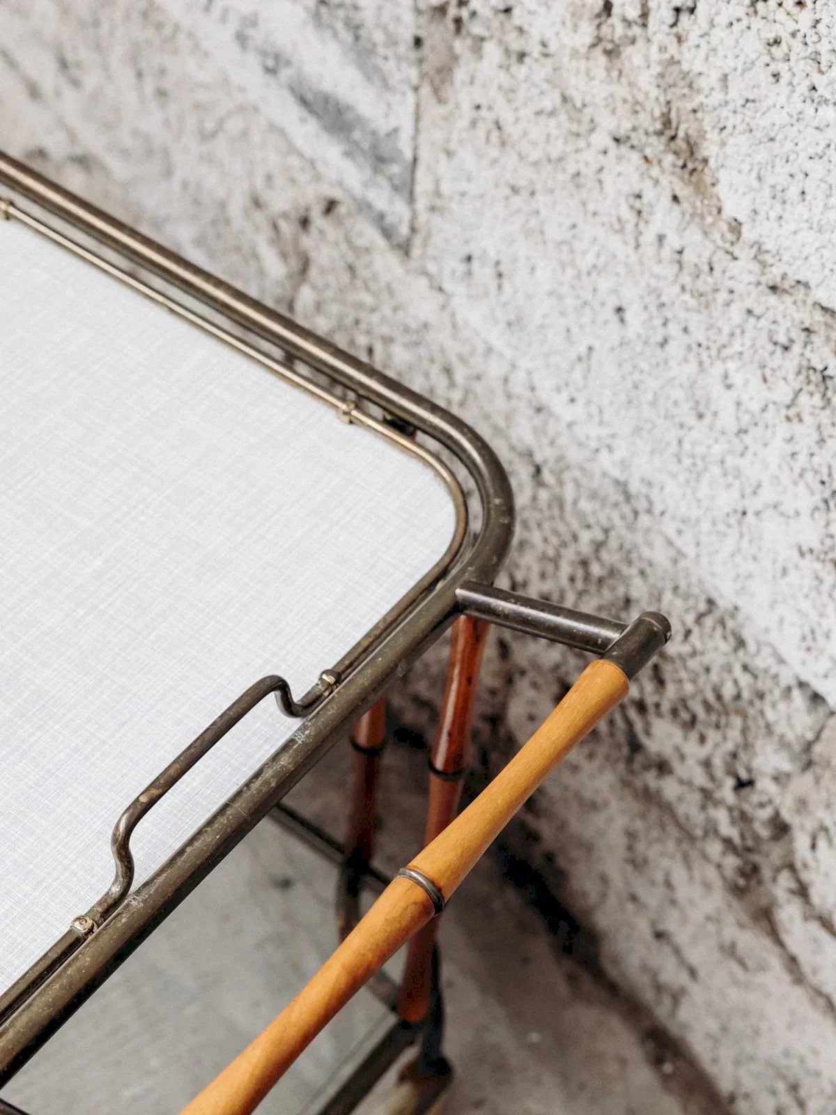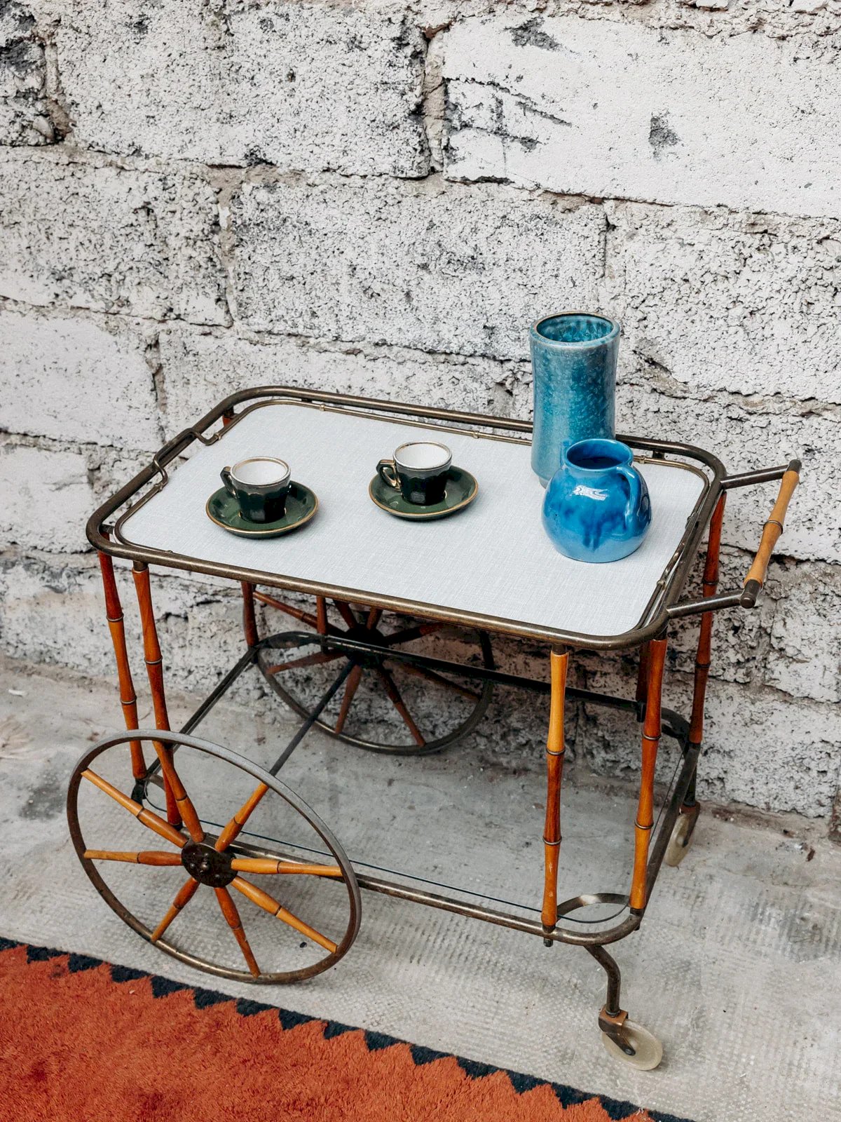 Discover this charming vintage-style serving cart, mounted on large wheels for easy and stylish movement. Its bamboo-look wooden structure gives it a warm and exotic feel. The top tray, removable and equipped with small handles, transforms into a lovely serving tray. The second level is made of glass, perfect for holding bottles or accessories. A piece that is both practical and decorative, ideal for your social moments. Length: 75 cm Tray length: 61 cm Height: 63 cm Height between tiers: 38 cm Depth: 45 cm Tray depth: 40 cm A brief history of the serving cart The serving cart, also known as a serving table, originated in the 17th century. At that time, it was used to serve and clear dishes and crockery during meals. Equipped with wheels, it moves from one place to another effortlessly and allows for quicker table clearing by reducing the number of trips between the dining room and the kitchen. Its great utility has made the serving cart an important element of furniture, also serving tea or breakfast. Over the centuries, this mobile side table has found a prime place in our interiors. Condition: Used item. Item shows some superficial wear, fully operational and functioning correctly. It may be a demonstration model or a returned item after a short period of use, along with any potential imperfections. Brand: Debongout Type: Vintage product Material: Wood, Glass Style: Country Customized: Serving carts